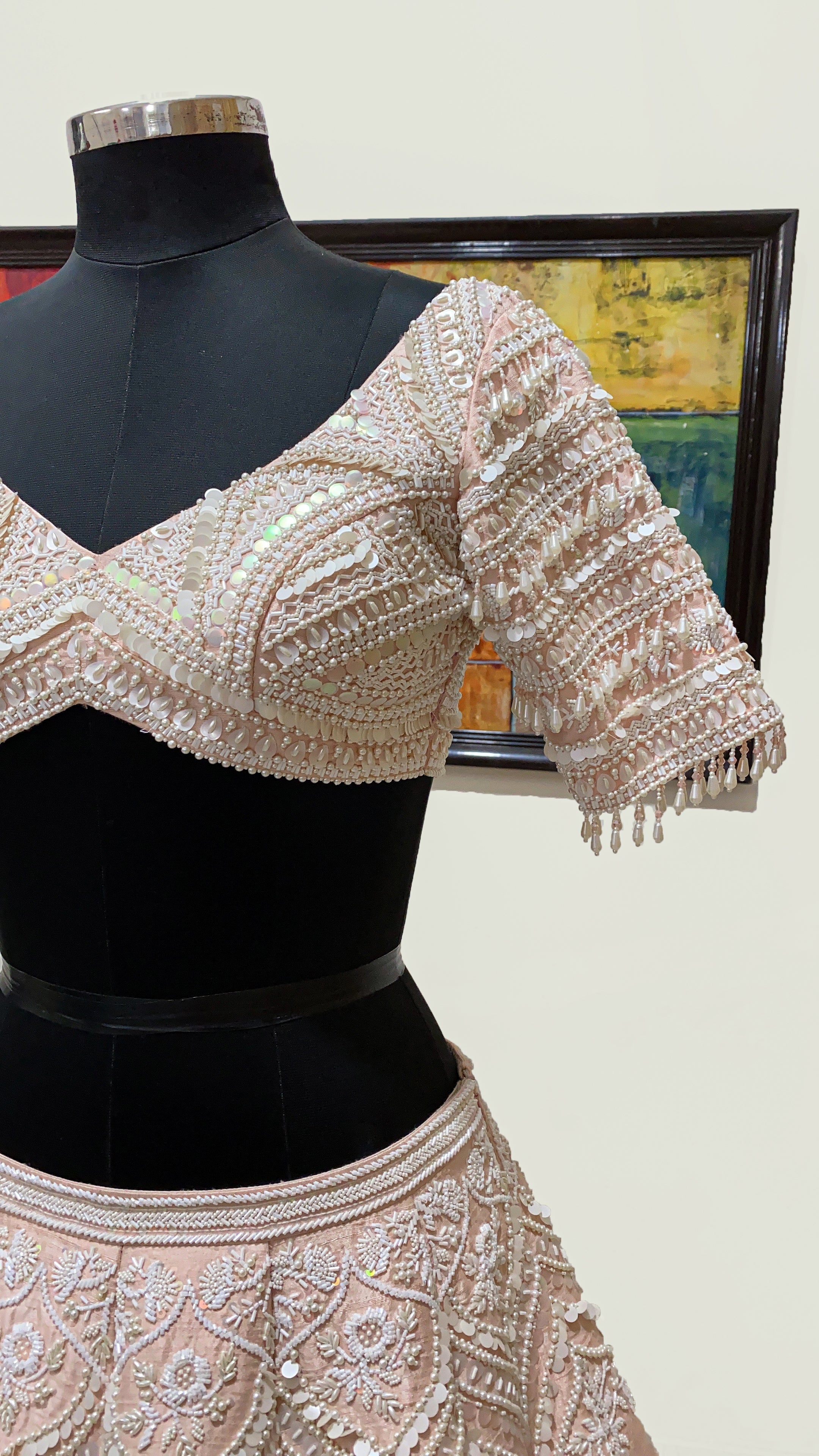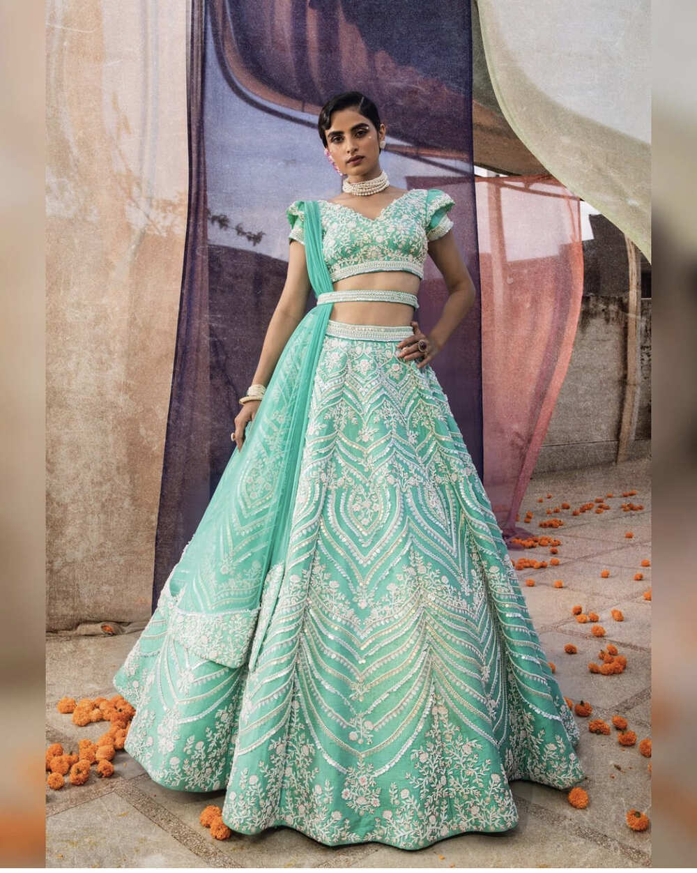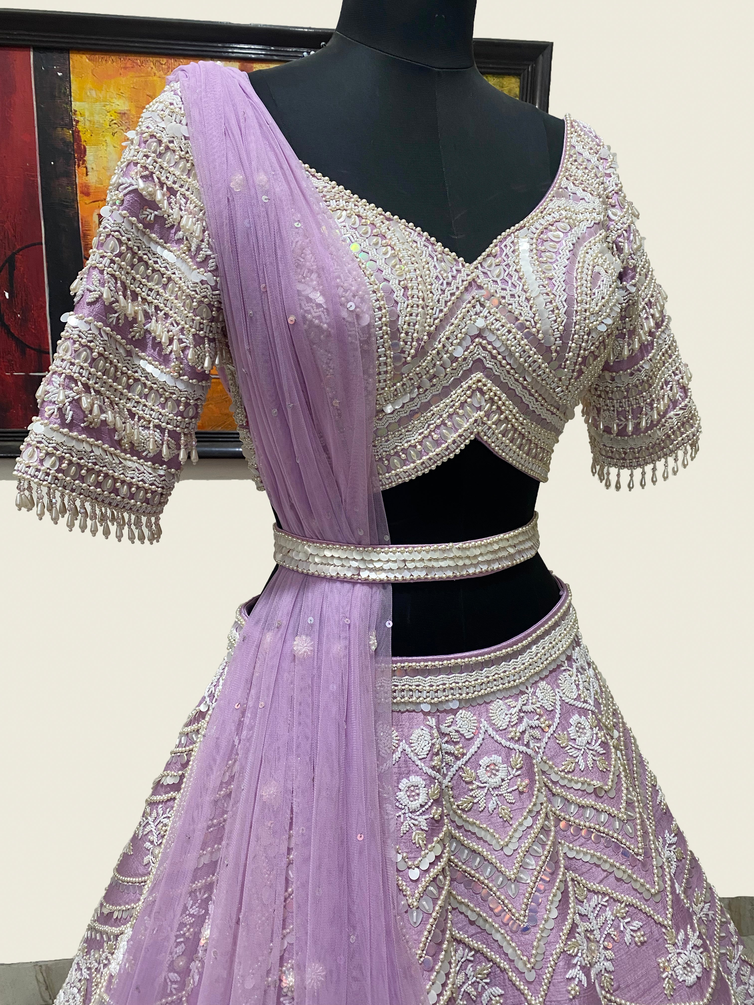 Featuring Sage Green BELLE Lehenga in raw silk With layered pearl shell and glass bead embroidery. Its is paired with a matching heavily embroidered geometric blouse with soft net dupatta