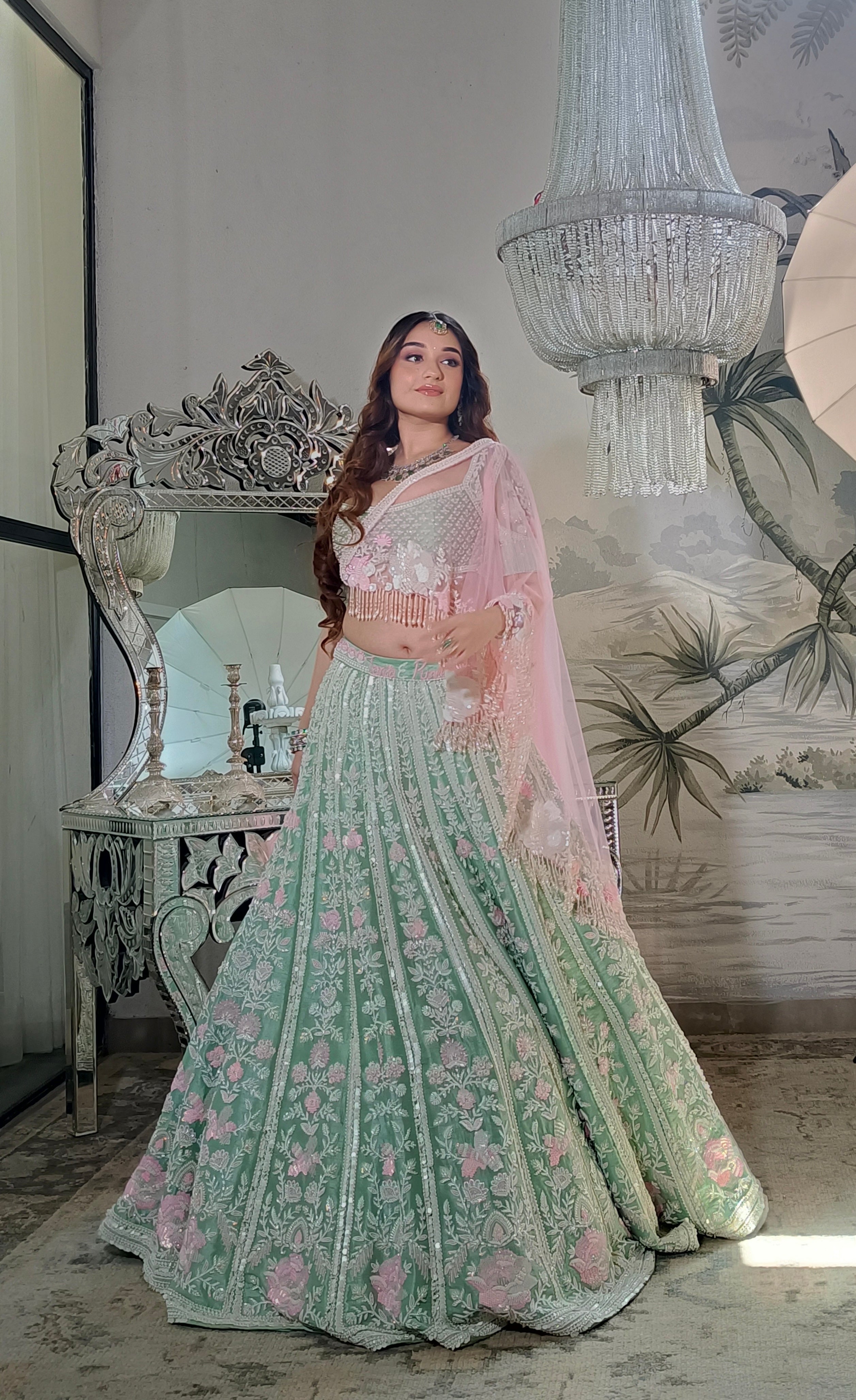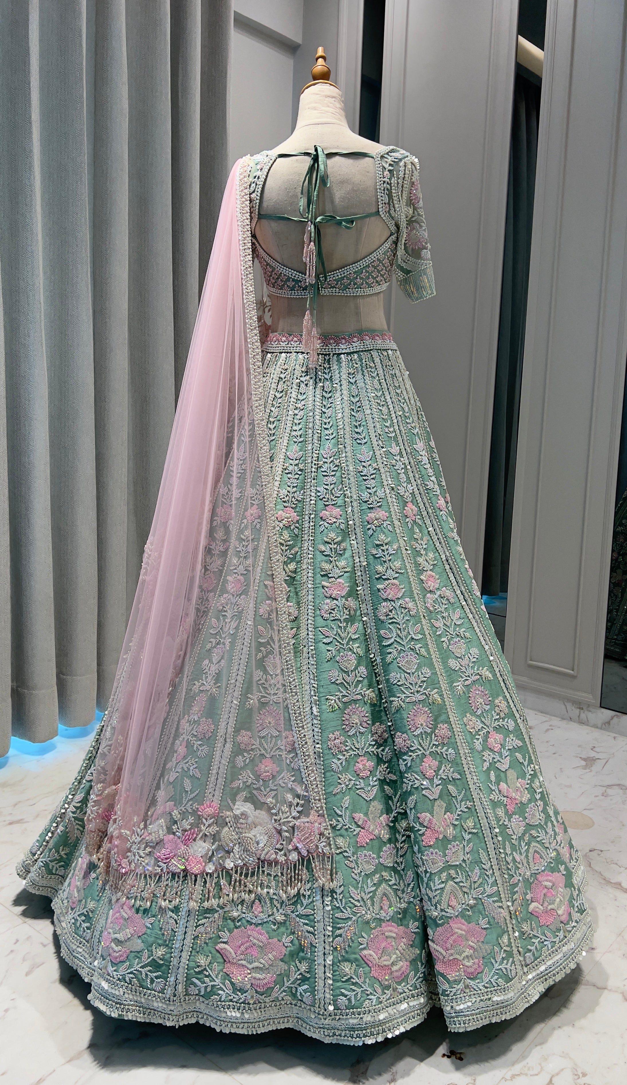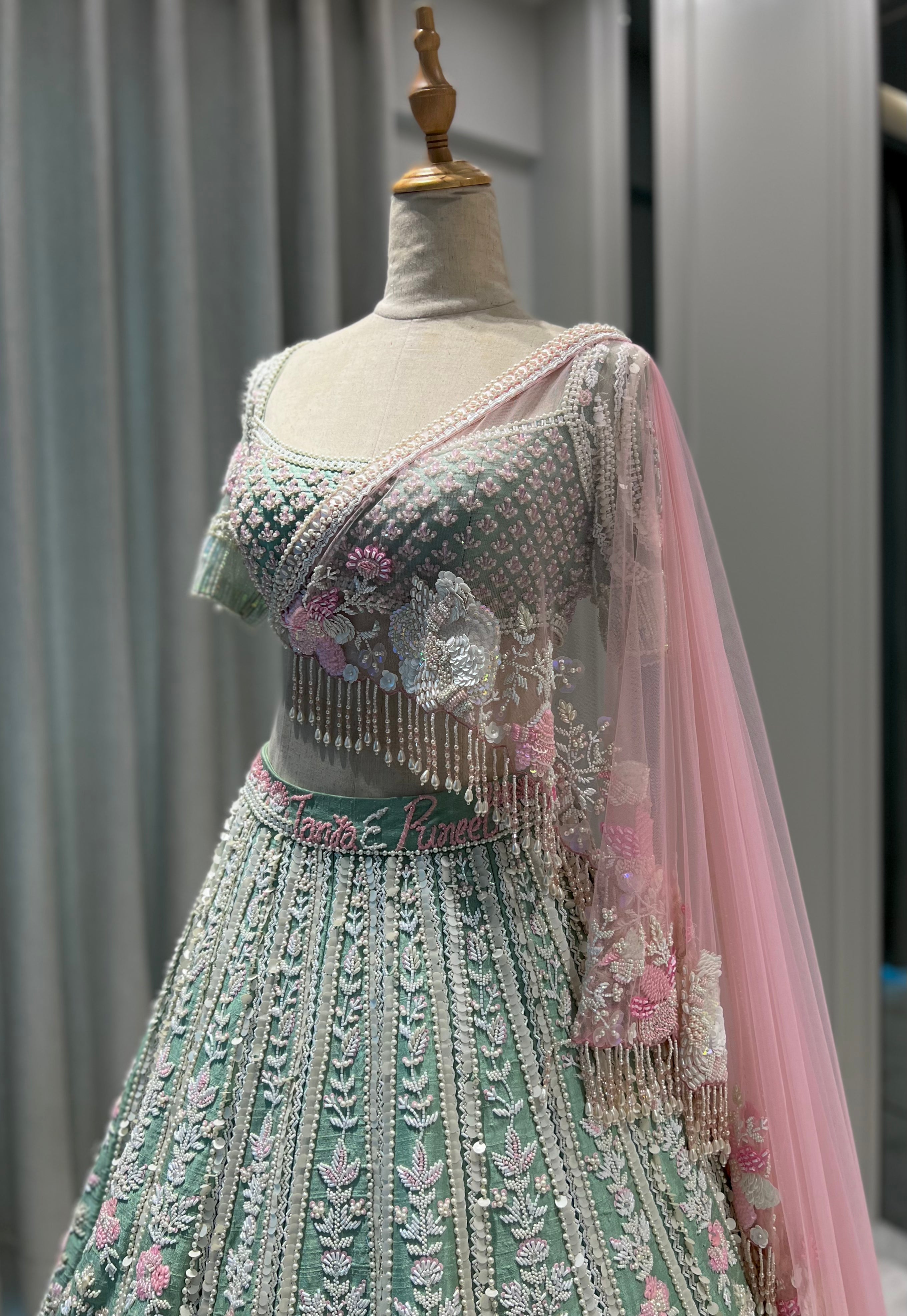 Our Jezebel Lehenga set is a modern yet traditional lehenga .Our sage green lehenga is purely hand embroidered using our signature pearls, glass beads, sequins and beads. It is paired with a pure raw silk blouse with embroidered net sleeves. It comes with a stunning one shoulder drape style dupatta and a blush pink embroidered veil dupatta