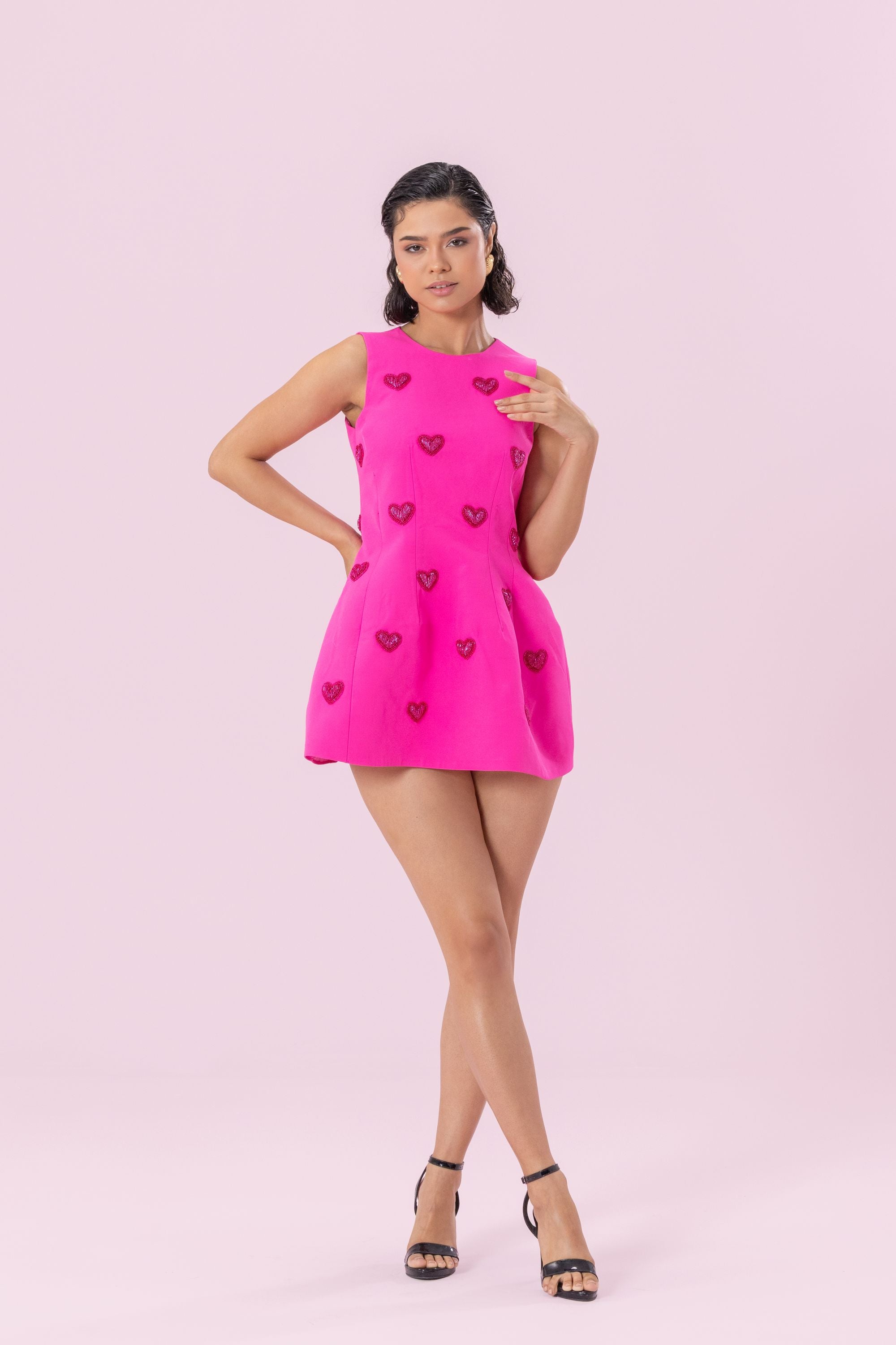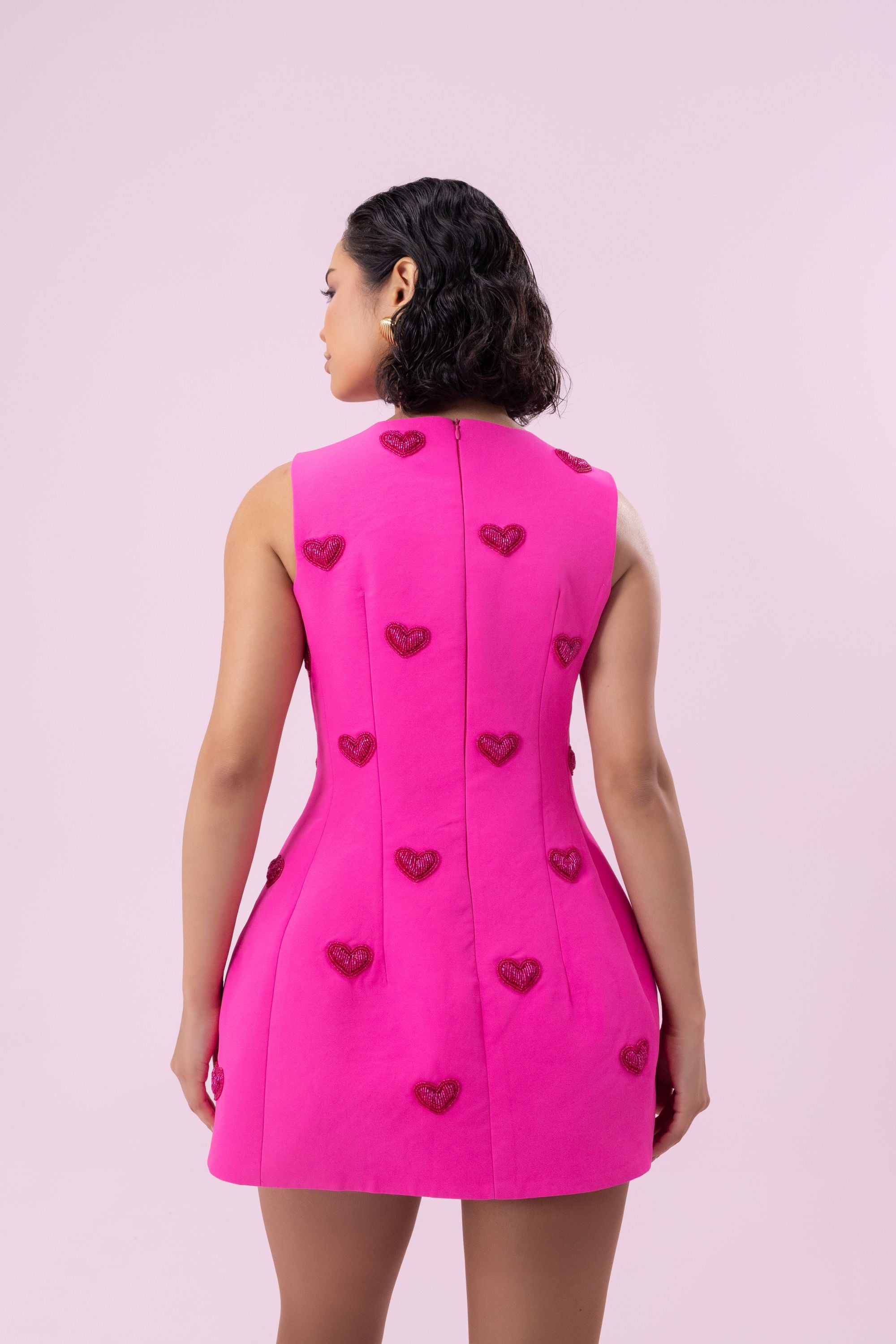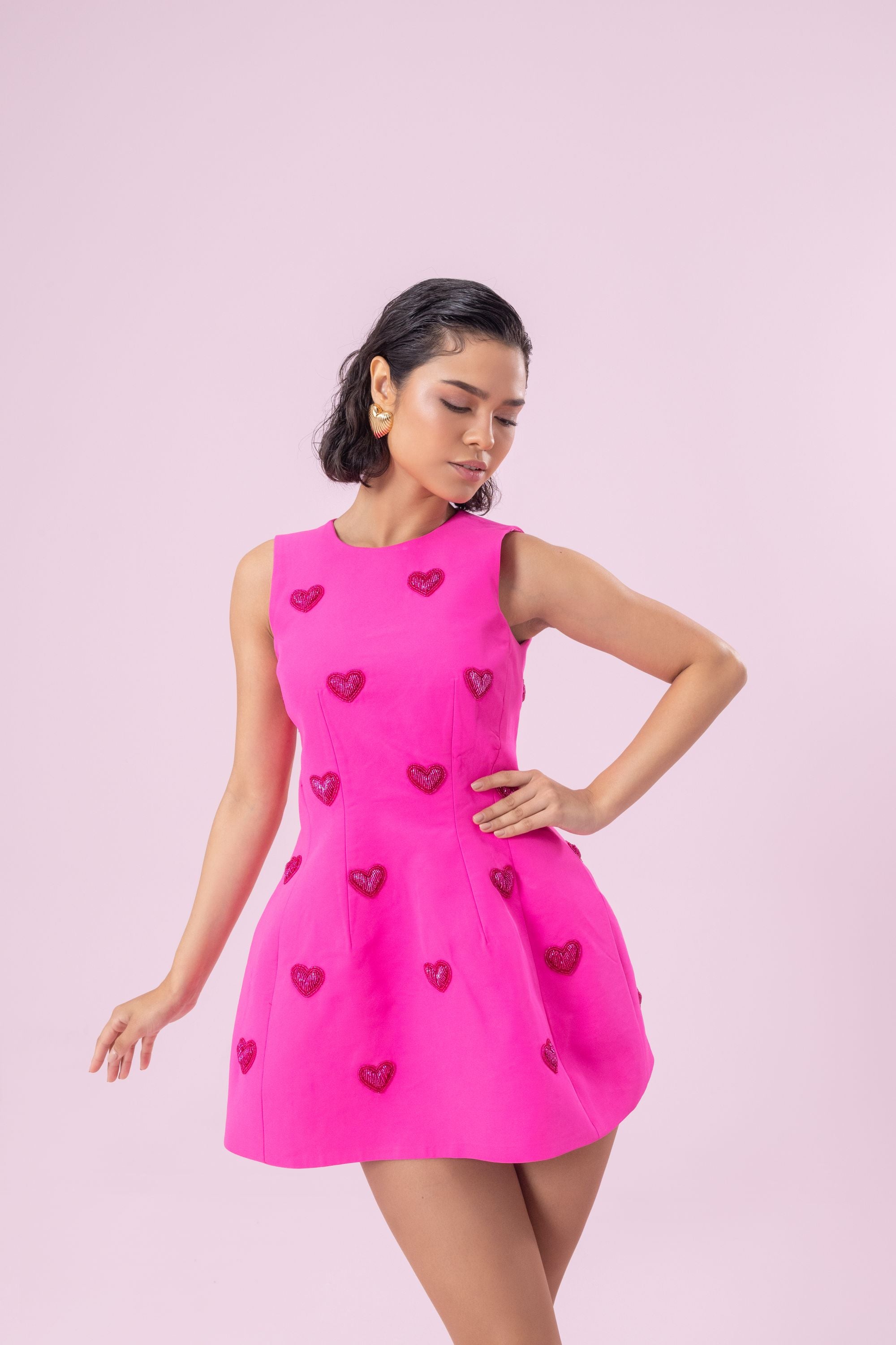 This show-stopping ensemble highlights a 3D-embroidered sugarpop dress in a bold hot pink, capturing the quintessential Barbie-inspired aesthetic. A sleek, zip up bodice shapes a modern silhouette, while the voluminous bottom infuses an air of playful sophistication, ensuring an unforgettable, fashion-forward statement.