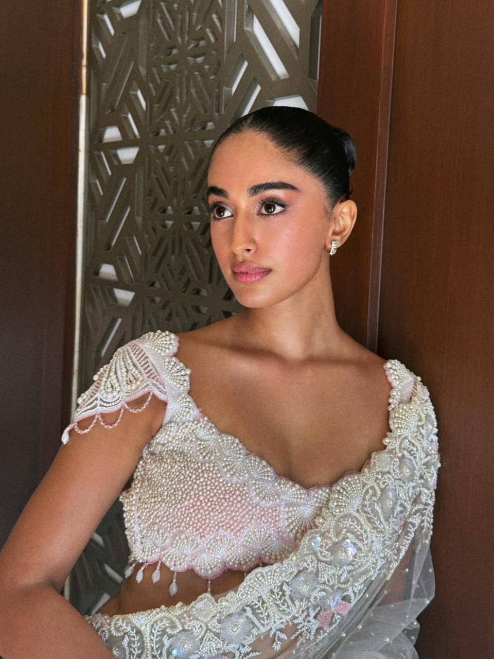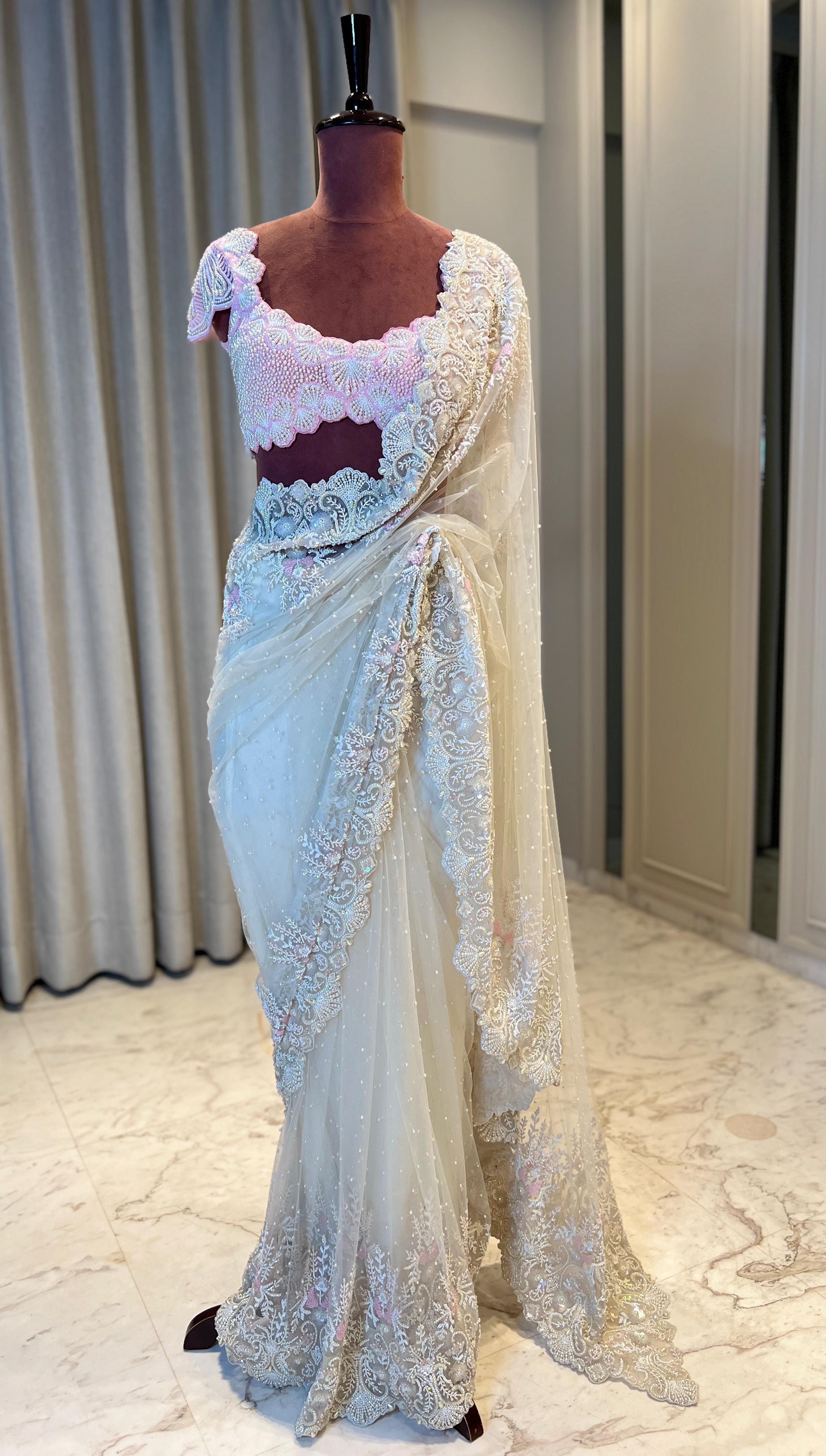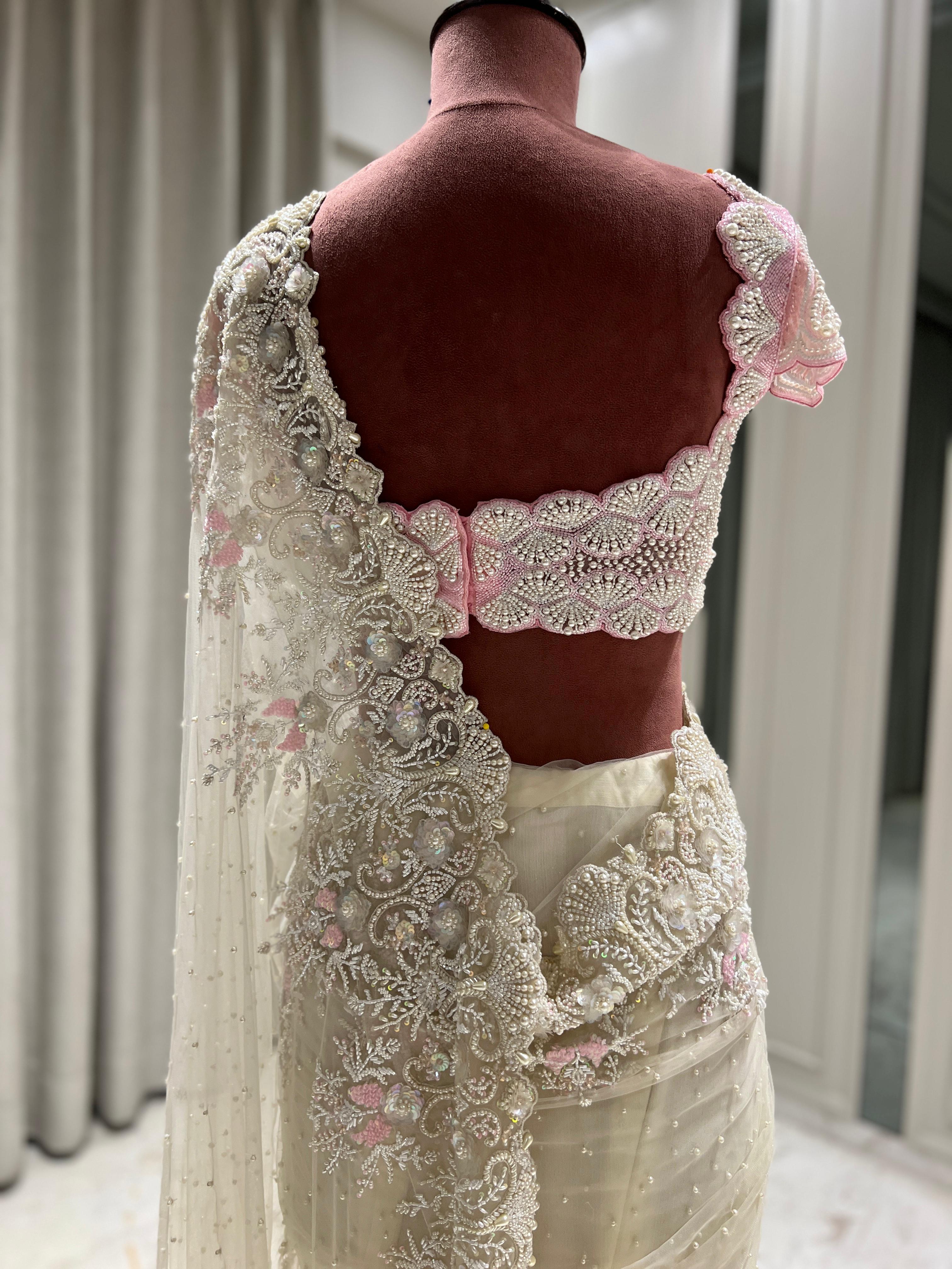 The Enaya Saree exudes a blend of tradition and charm, featuring a soft off-white base with exquisite embroidery that showcases its delicate craftsmanship. Paired with a blush pink blouse adorned with intricate embroidery, this saree offers a harmonious contrast that is both elegant and eye-catching. Ideal for festive occasions and wedding functions, the Enaya Saree embodies a timeless beauty, making it a perfect choice for those who seek a balanced look of grace and color.