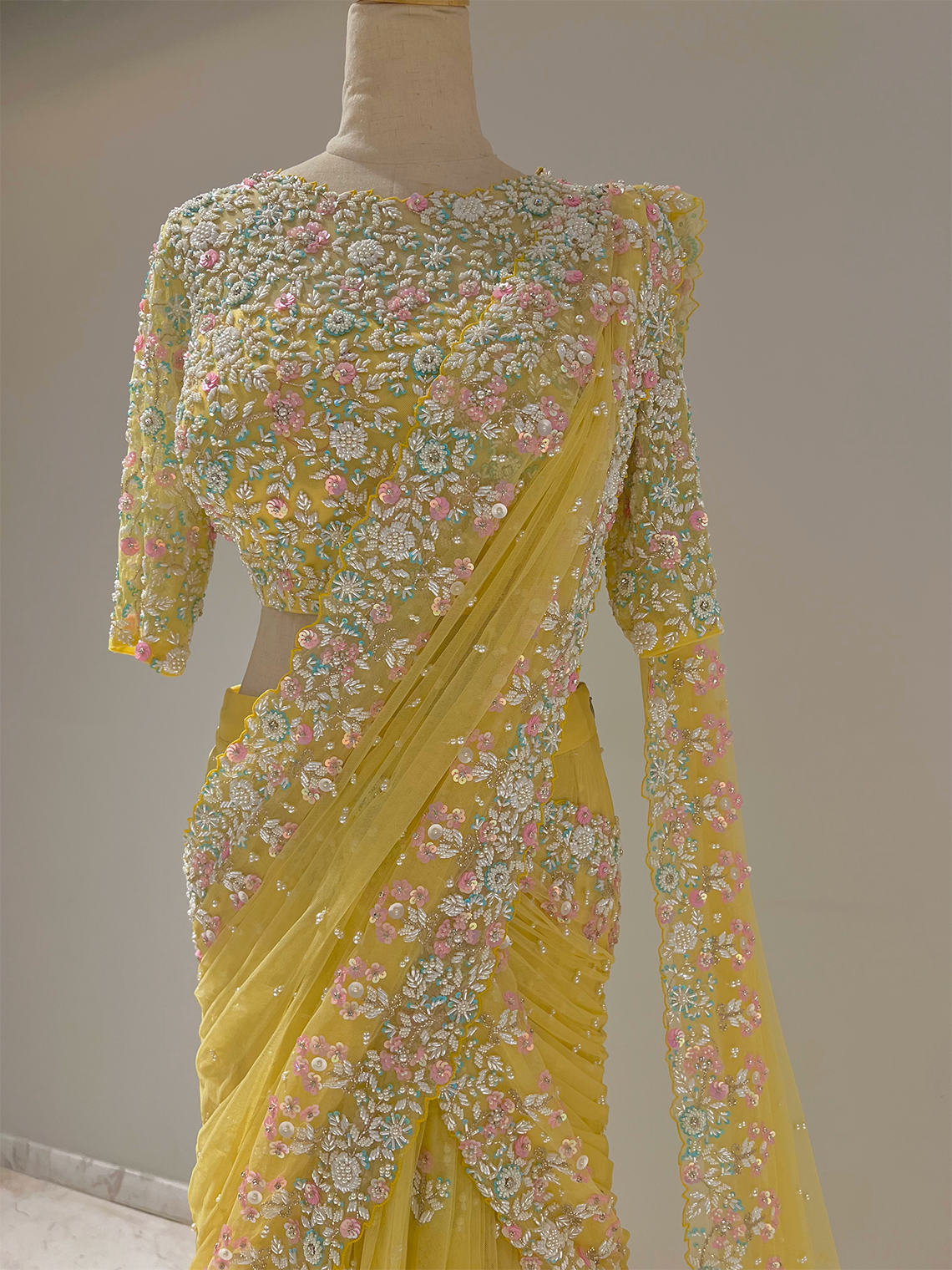 Angela saree set is a lime yellow soft net saree and a pretty blouse. The saree is beautifully hand embroidered with glass beads, sequins and our signature pearls.