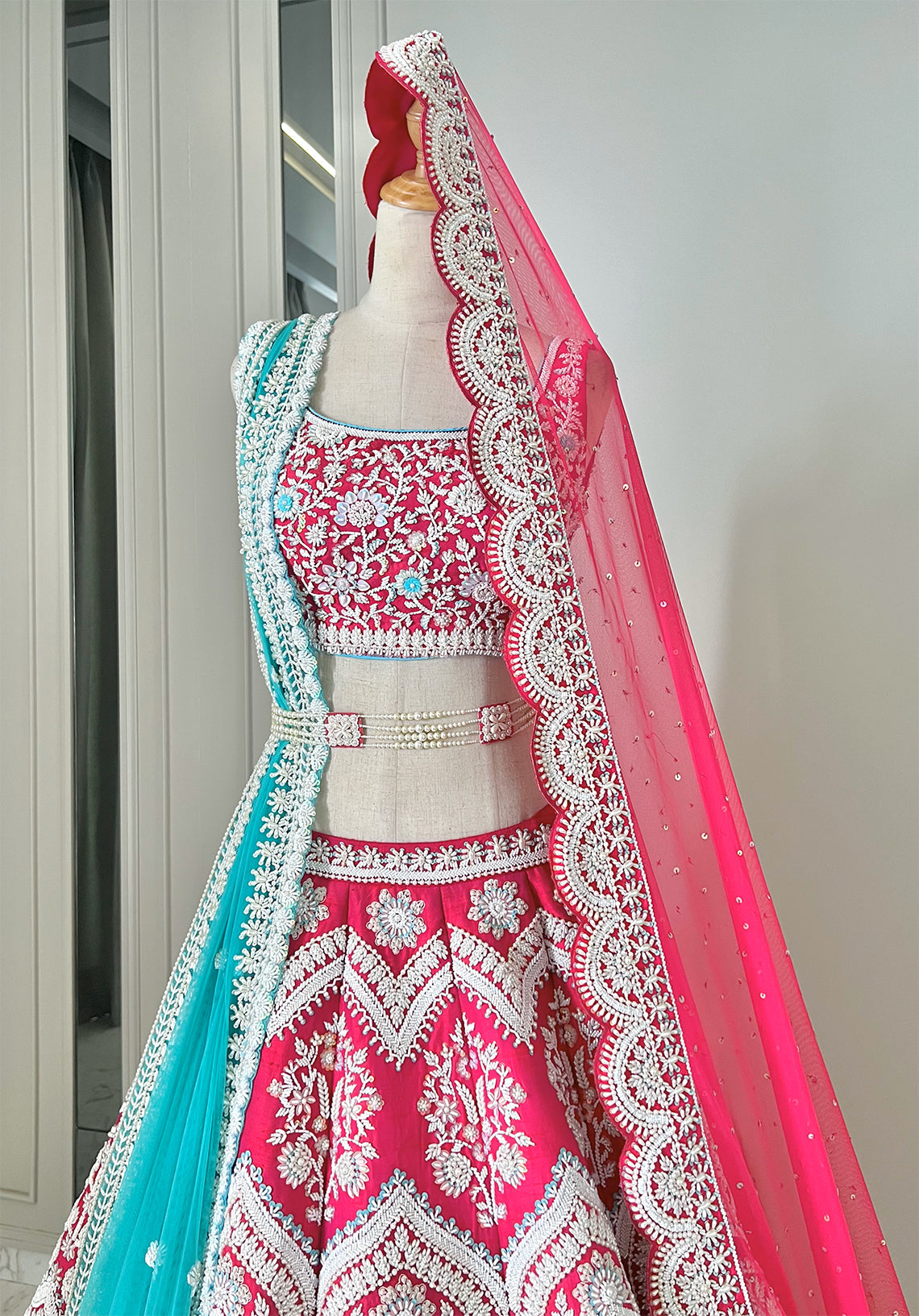 The Arryn set is a fuchsia pure raw silk 120 gms bridal Lehenga Set. The entire set has a signature detailed embroidery using pearls, cutdana, sequins and nalki. It comes with double dupatta one fuchsia and one in an aqua soft net dupatta with white embroidered borders.