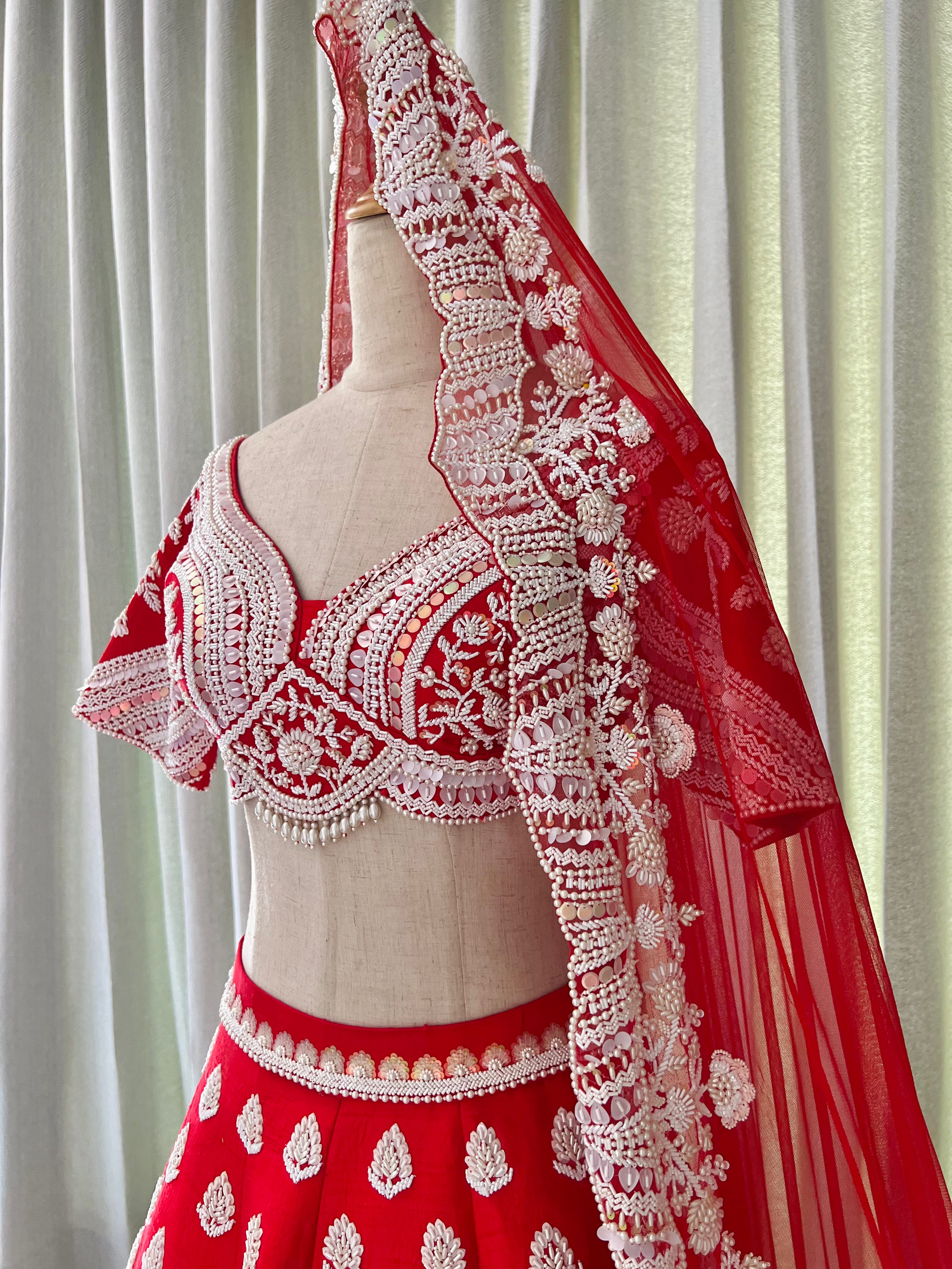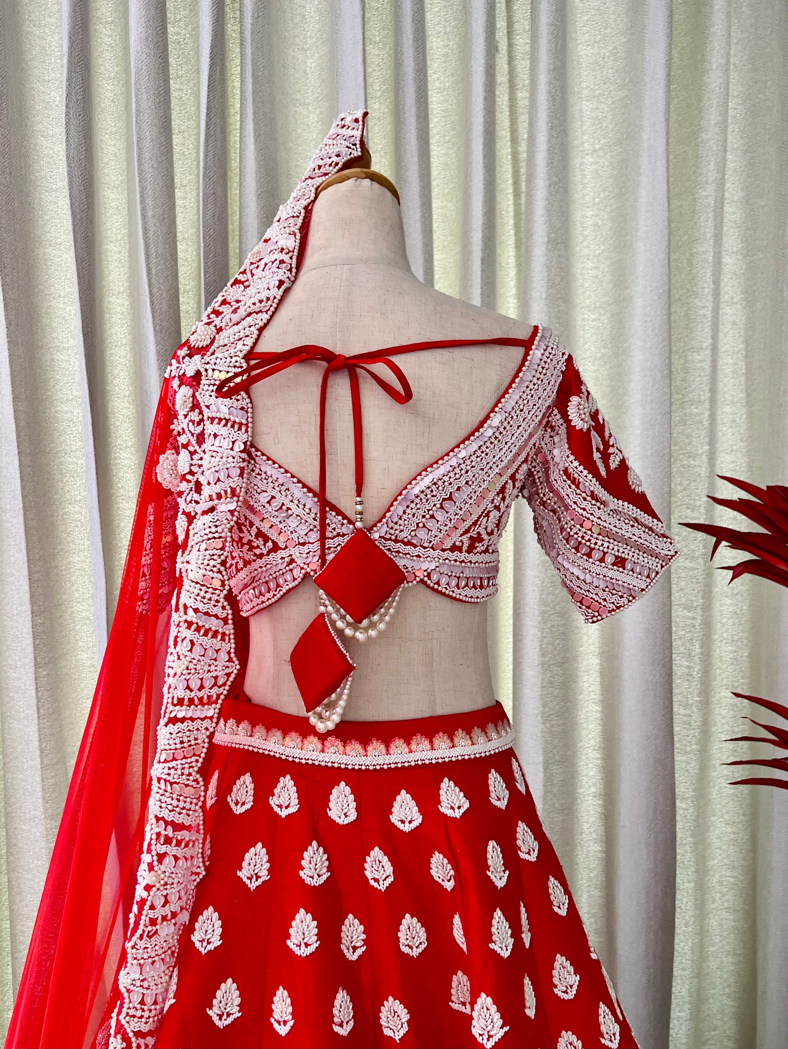 Featuring our Autumn Lehenga set in red color pure raw silk 120 gms with white pearl, sequins and beads embroidery. This Lehenga is paired with soft net dupatta with Pearl and beads embroidered heavy borders.