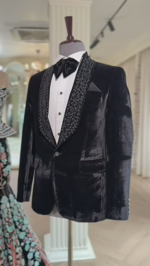 This luxurious black velvet tuxedo exudes timeless sophistication. Featuring an intricately hand-embroidered shawl collar with crystal and bead detailing, the piece blends classic tailoring with couture craftsmanship. Paired with a crisp white pleated shirt and a velvet bow tie, this ensemble is designed for men who appreciate refined elegance and attention to detail. Perfect for black-tie events, receptions, or grand celebrations, this statement tuxedo reflects contemporary opulence while maintaining traditional charm.