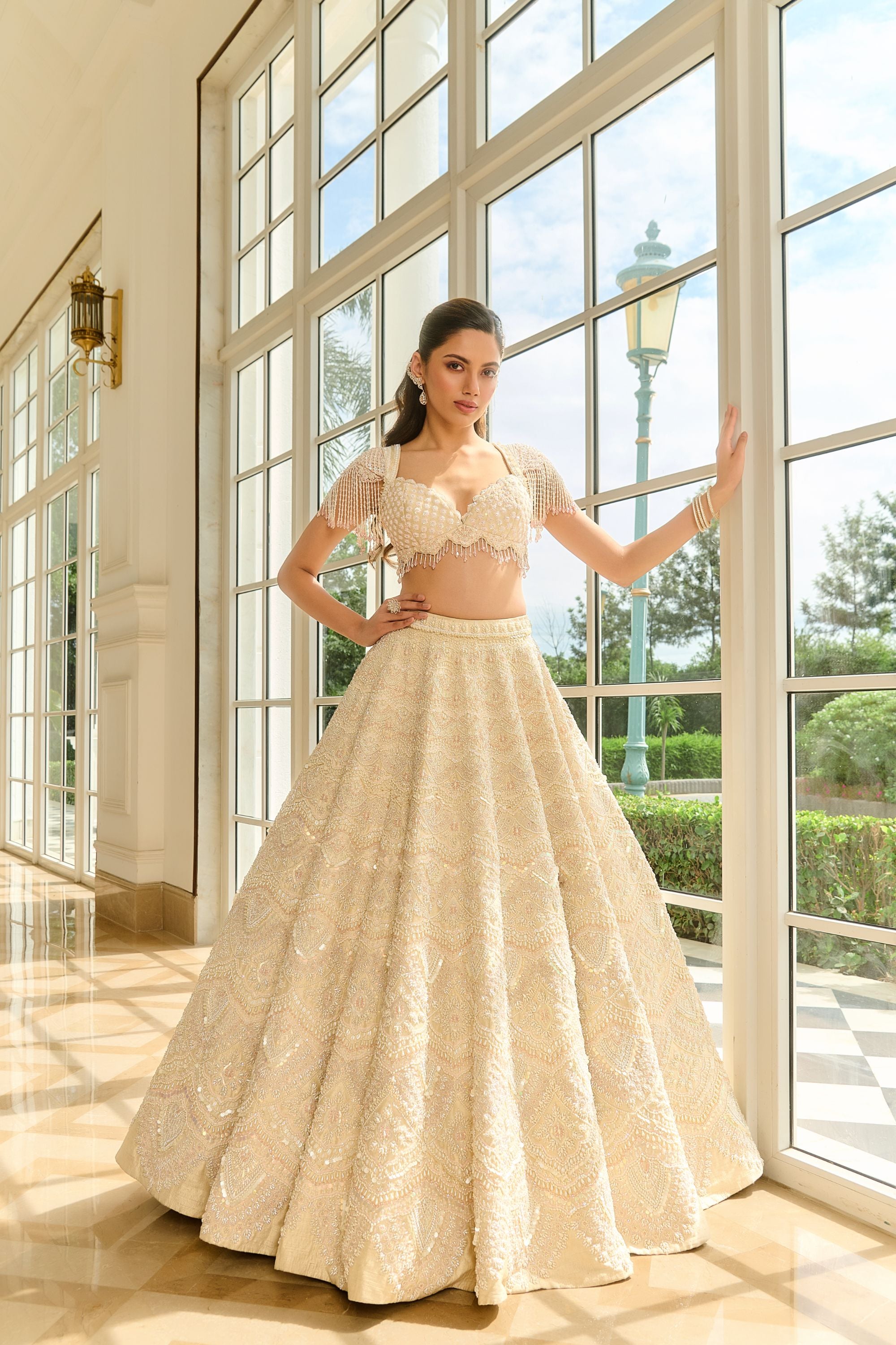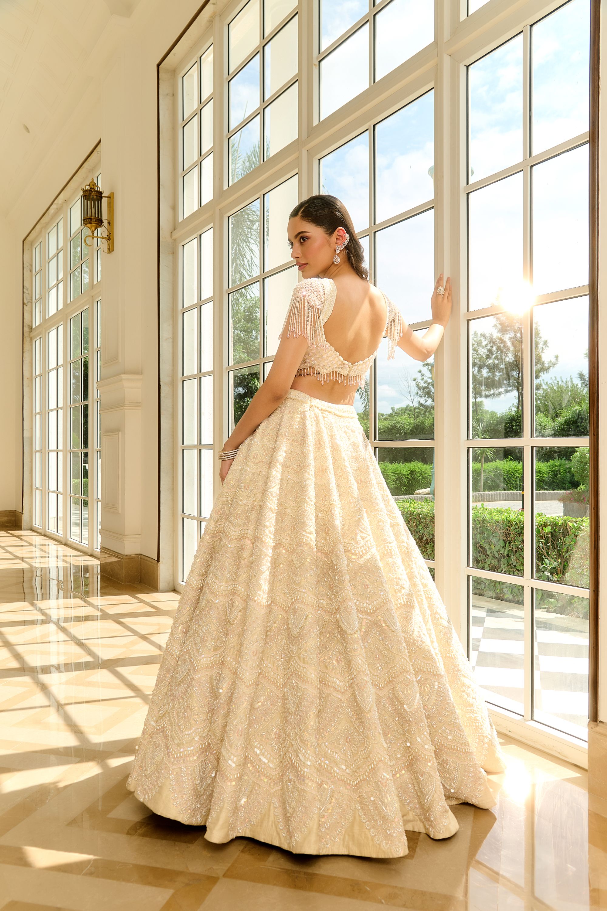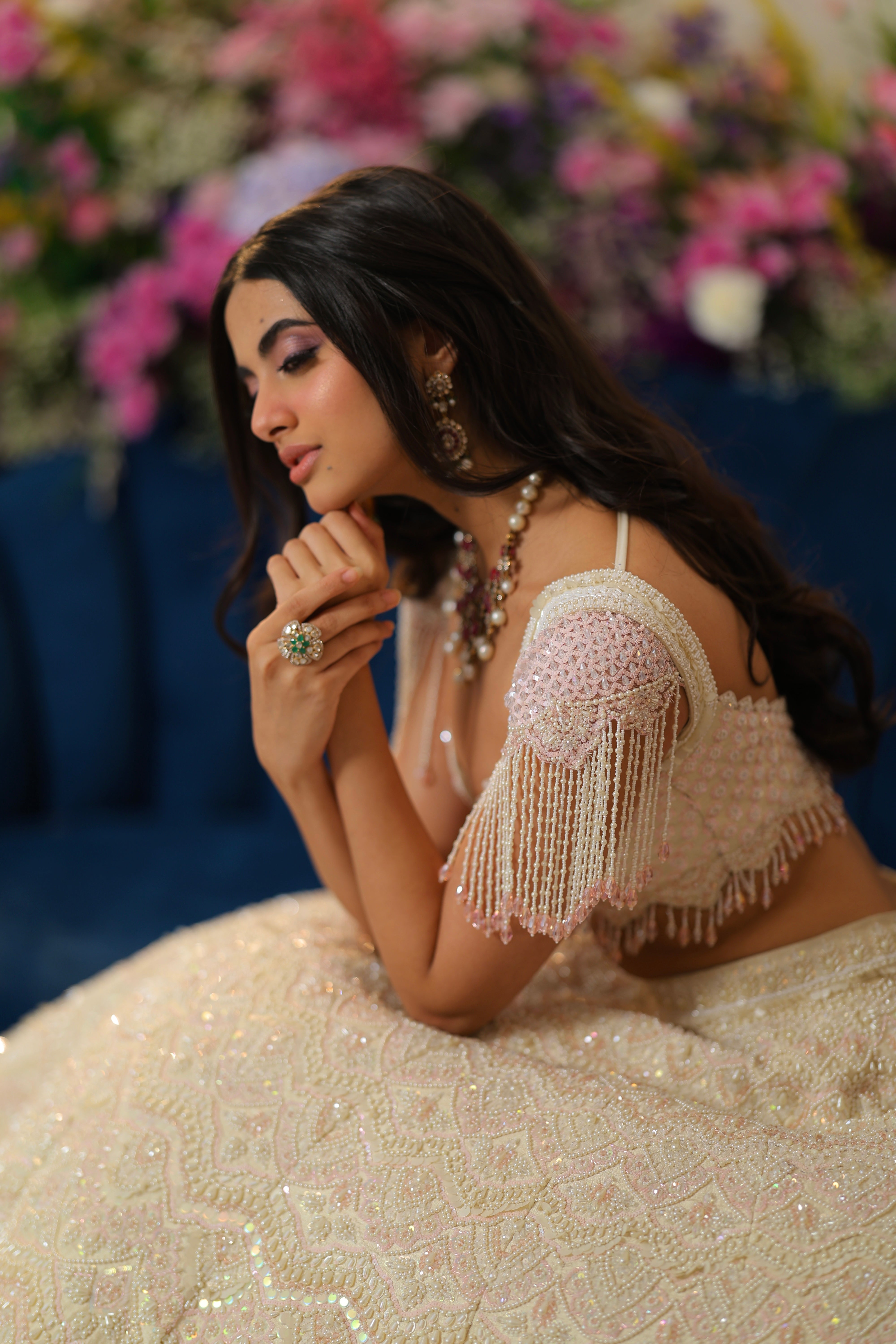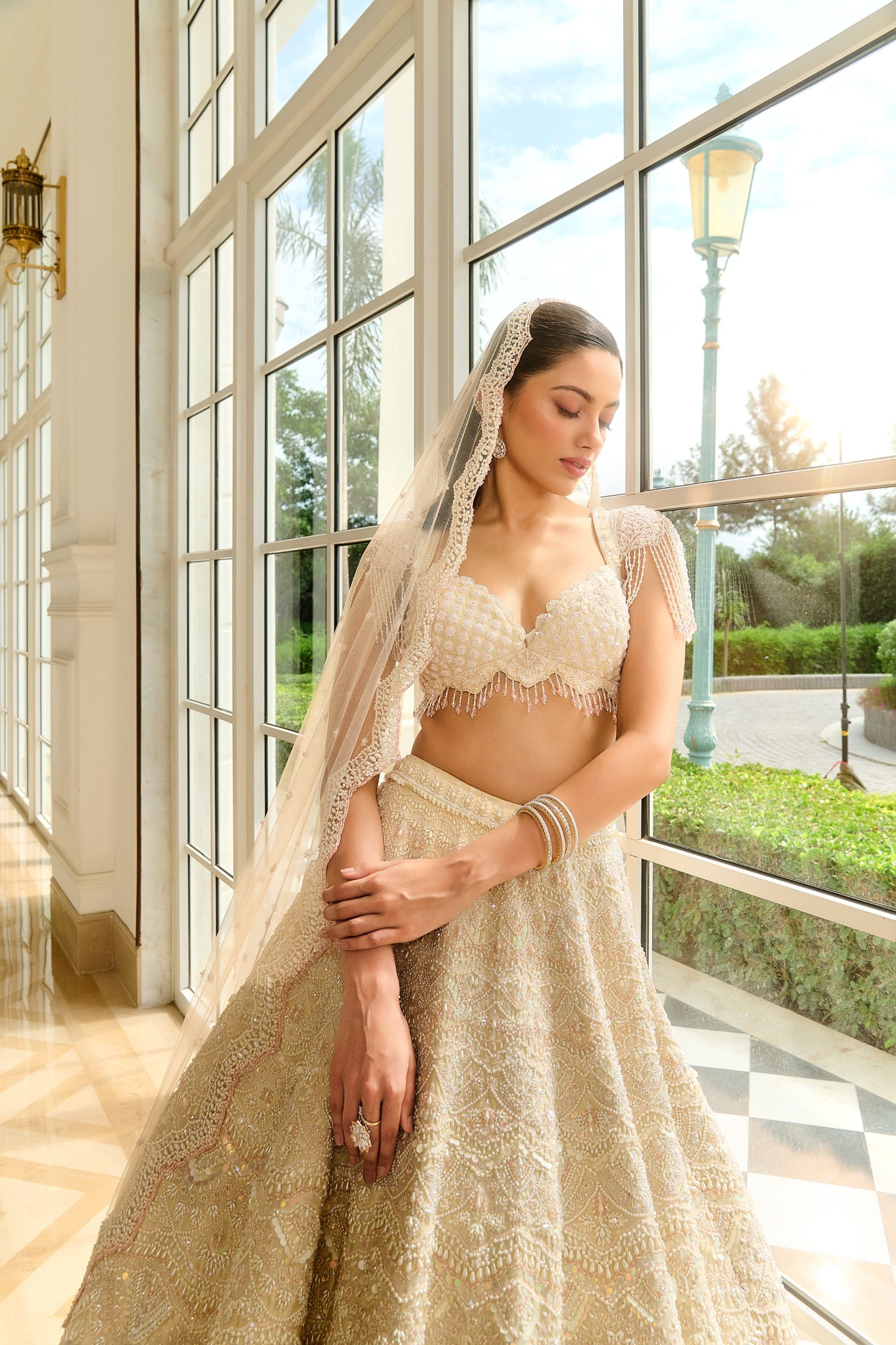 Featuring our stunning BLAIRE lehenga from our NAAYAB collection for our sundower brides. This Ecru color pure raw silk lehenga is purely accented with glass beads, pearls, crystals, cut dana and sequins with hints of soft pink throughout the lehenga. It is paired with this puffed sleeves elegant cut hand embroidered blouse that adds up the glamour to this beautiful lehenga. The entire set is highlighted with impactful surface embellishments perfect for your D- Day. Blaire comes with a gorgeous cutwork soft net veil to attain a must- have status in every bride’s wardrobe this season