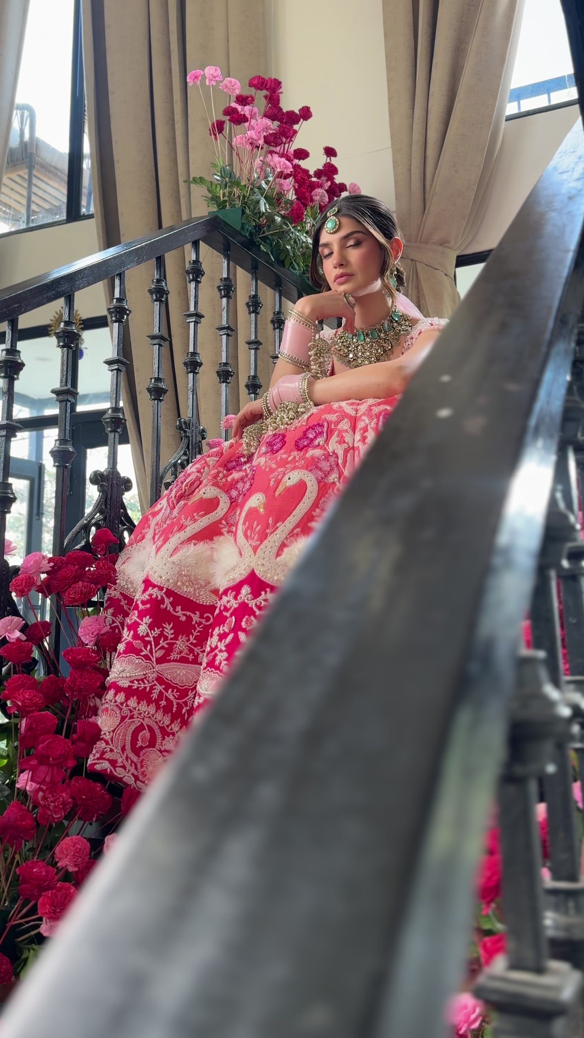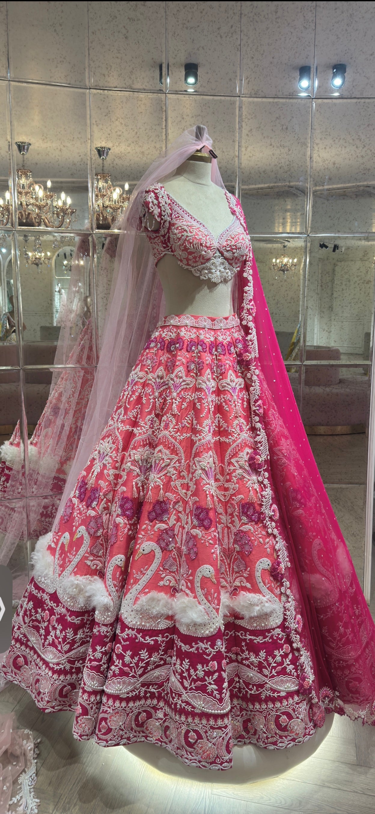 A poetic expression of love and grace, the Blushing Swans Lehenga is crafted in a warm blush hue and adorned with delicately hand-embroidered swan motifs—symbols of eternal togetherness. Intricate pearl work, fine thread embroidery, and soft tassel detailing bring movement and quiet opulence to the silhouette. Paired with a sculpted blouse and a sheer blush dupatta, this ensemble is designed for the bride who chooses timeless elegance and understated luxury.