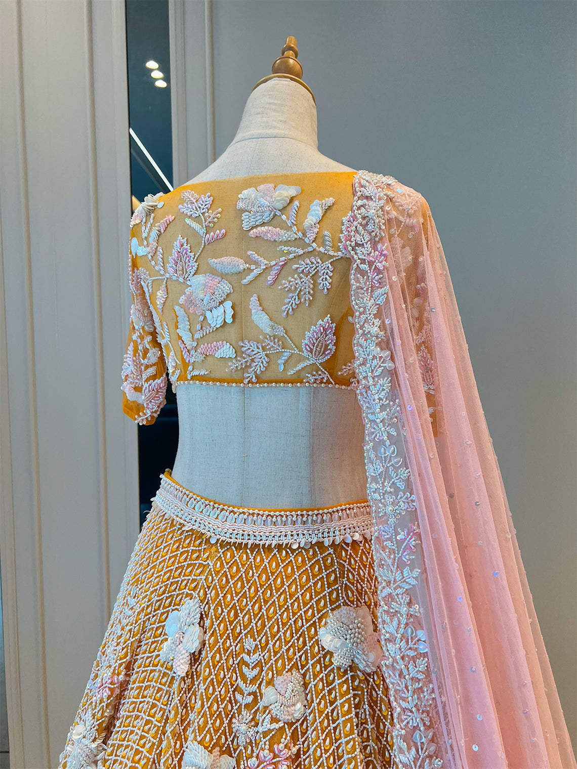 The Tangerine Carnation Lehenga set is a lovely hand embroidered orange net with our signature pearls, beads and sequins all over the lehenga. The skirt comes with a gorgeous flower embroidered mesh top and a blush pink sequinned net dupatta.