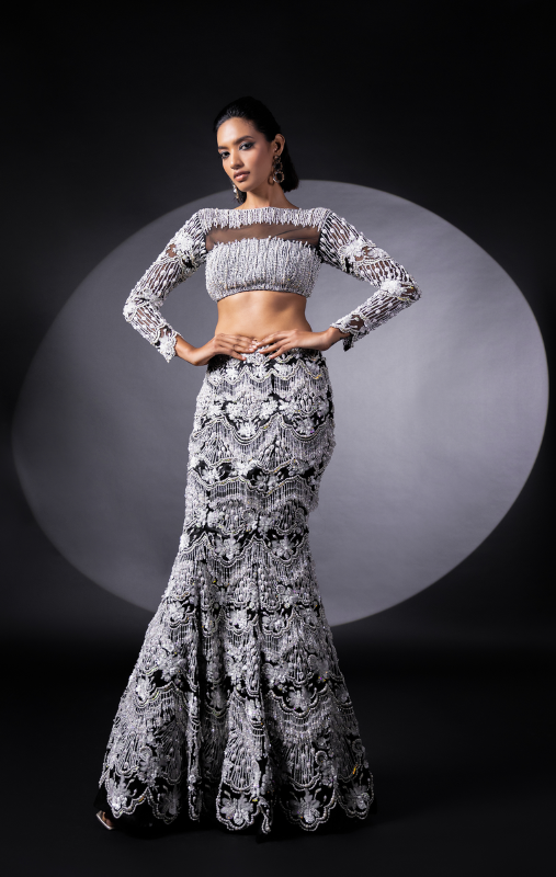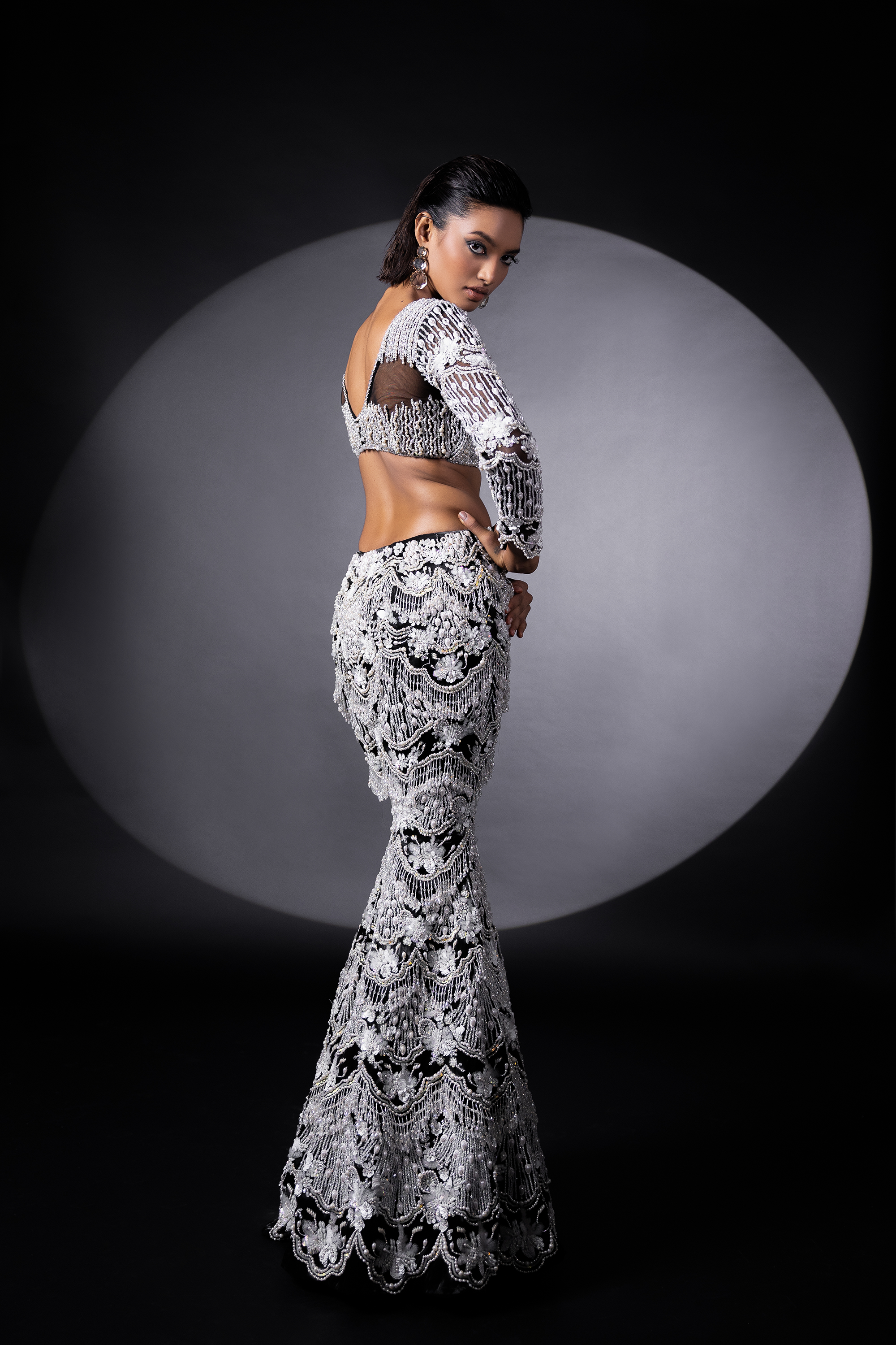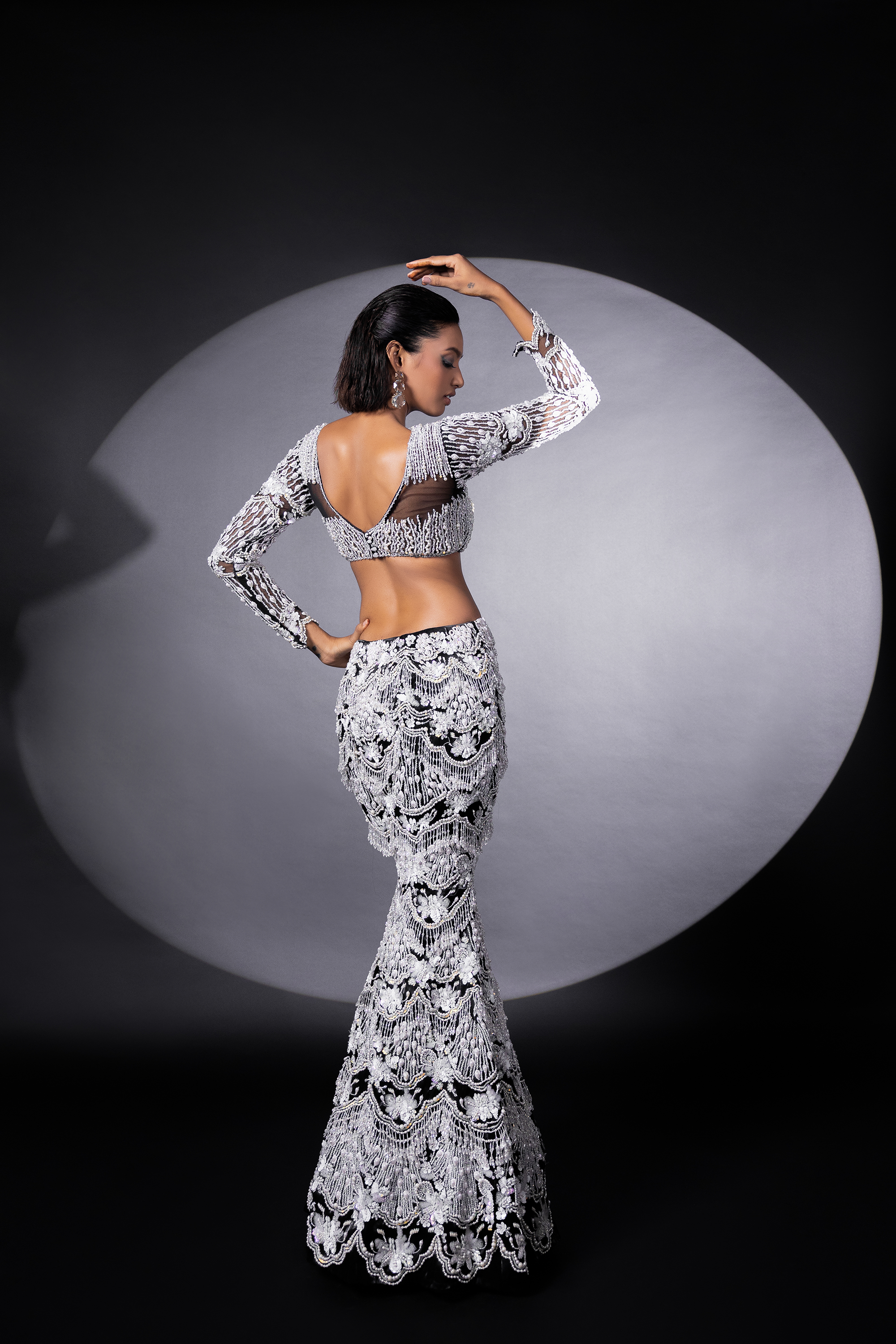 Featuring our breath taking mermaid set Diora perfect for a cocktail event. The set is purely hand embroidered with pearls, glass beads and crystals with hanging tassels to enhance the look. The skirt is paired with a stunning pearl blouse. This pearl outfit is the epitome of sophisticated evening glamour.