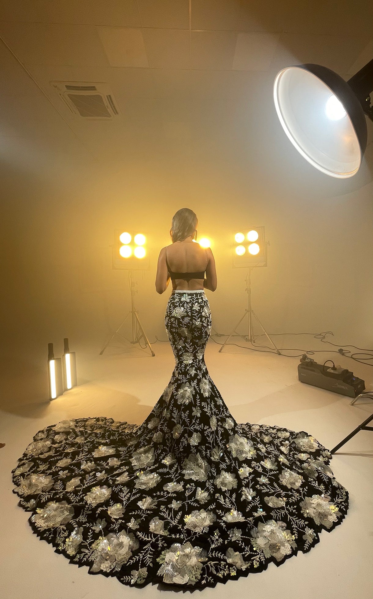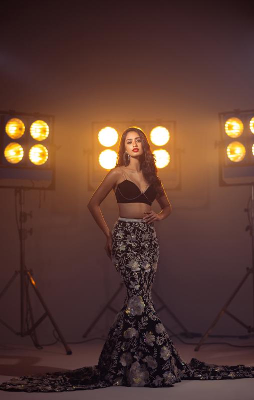 Featuring our gorgeous mermaid set ELINOR with entwined floral vines running throughout the skirt. This skirt is paired with a stunning bustier with crystal detailing. The skirt is purely hand embroidered with sequins, cutdana and pearls on a metallic organza fabric. Elinor set come with a huge trail perfect for your cocktail.