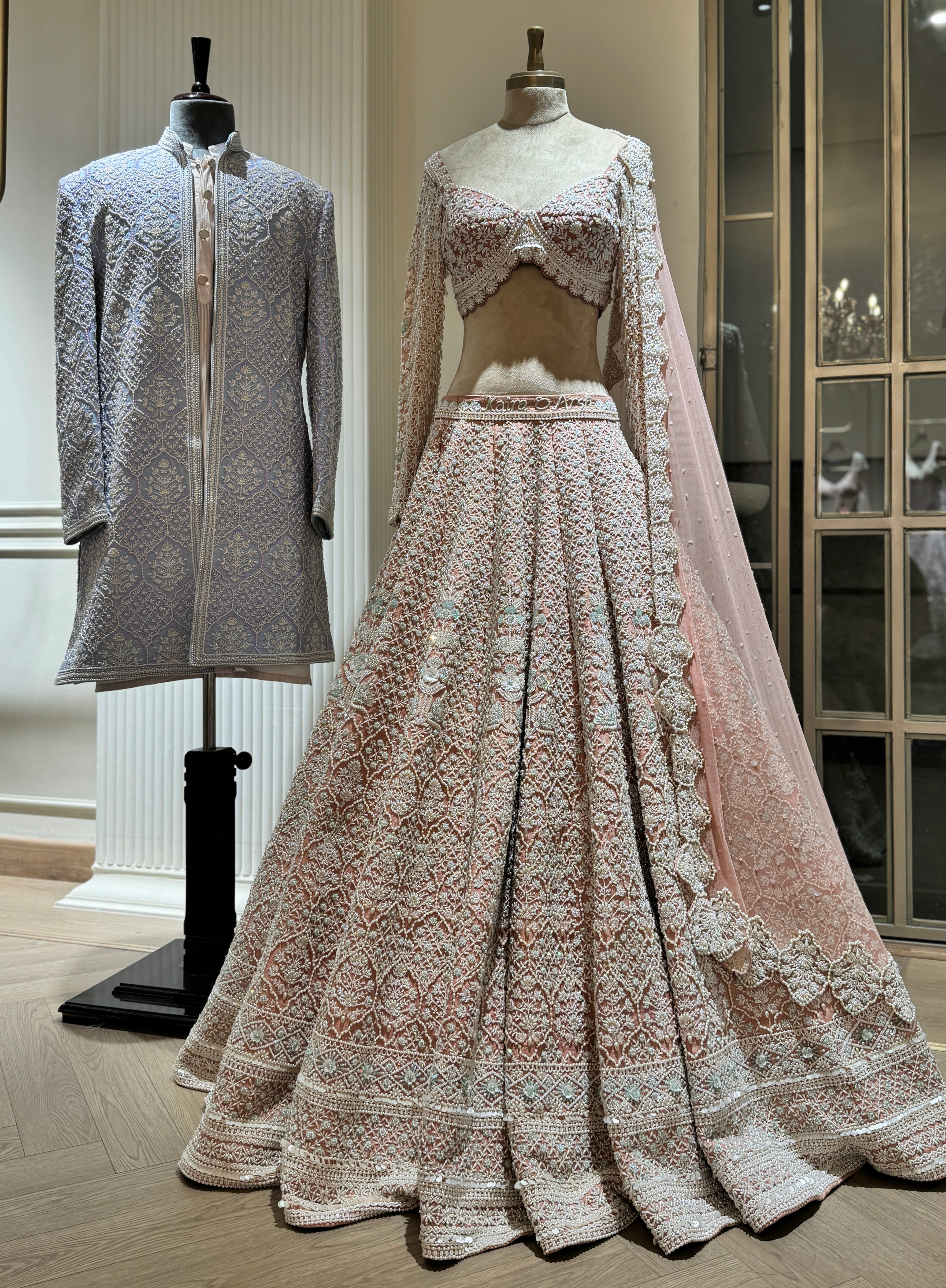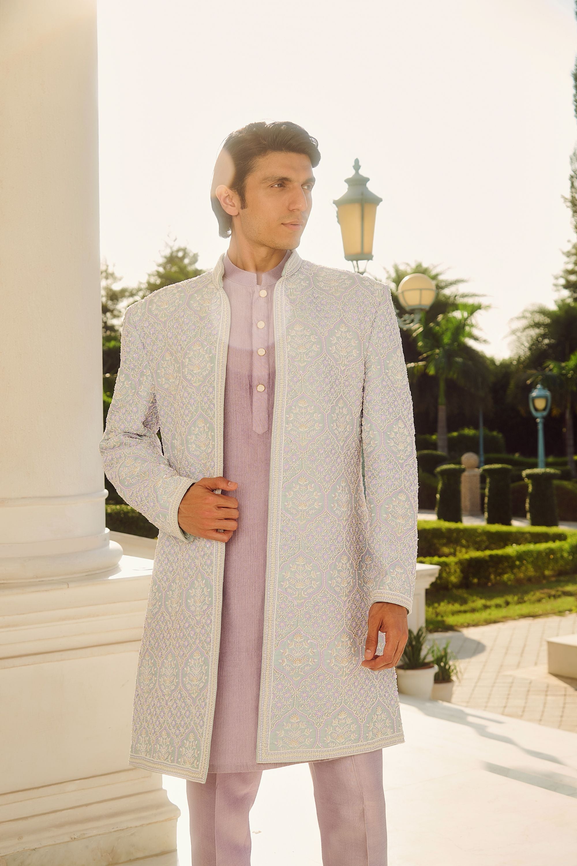 Introducing the Emery Sherwani from our Naayab collection. This opulent sherwani is adorned with delicate hand-embroidered glass beads, pearls, crystals, cut dana, and sequins. Soft hints of pink add a subtle charm, creating a harmonious blend of elegance and refinement. A true masterpiece for those with a discerning eye for detail.