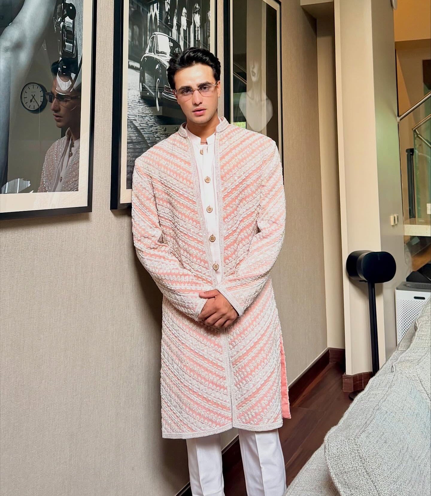 Introducing the Estelle Sherwani from our Marjorie collection. This elegant sherwani, in a soft caramel hue, is intricately embellished with delicate hand-embroidered glass beads, crystals, cut dana, and sequins. A stunning combination of subtlety and sophistication, perfect for those who appreciate refined craftsmanship.