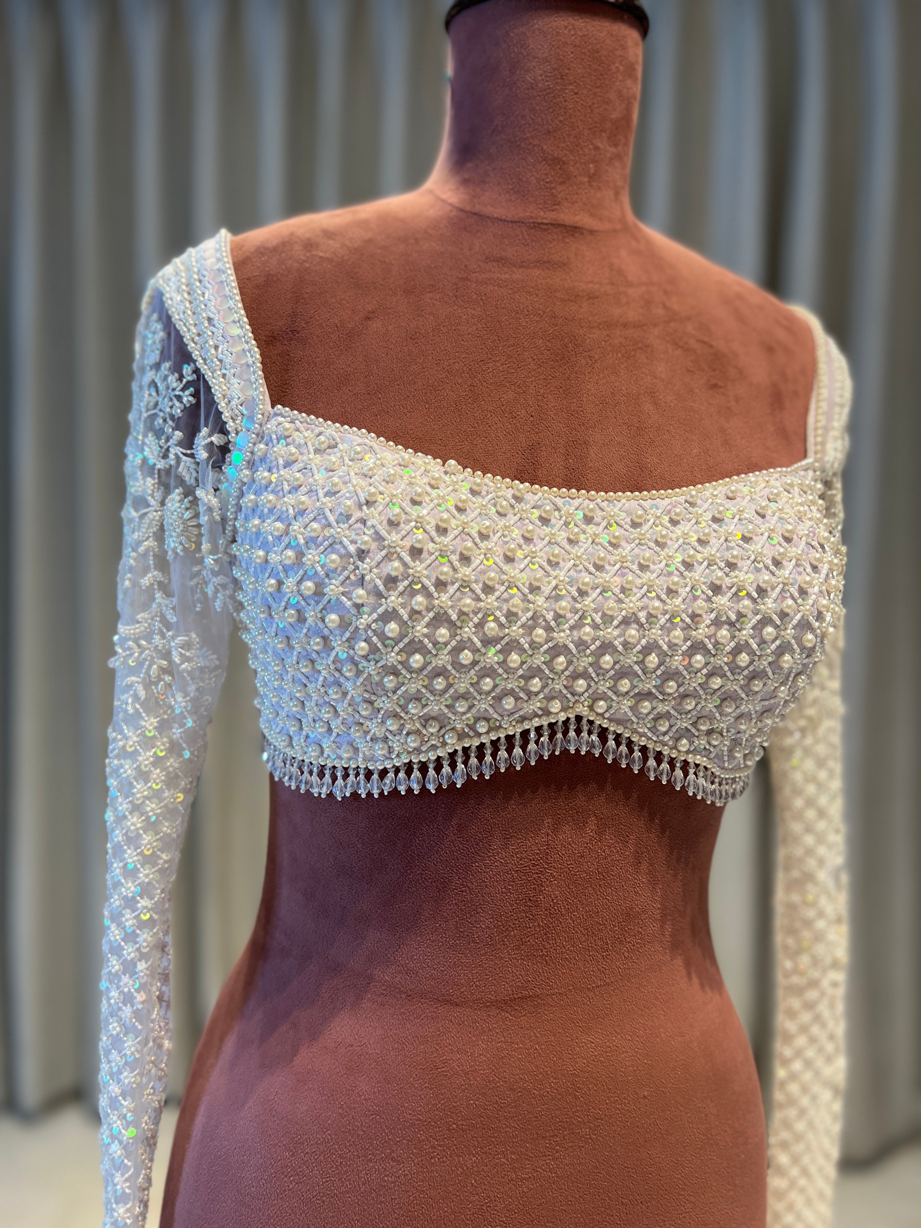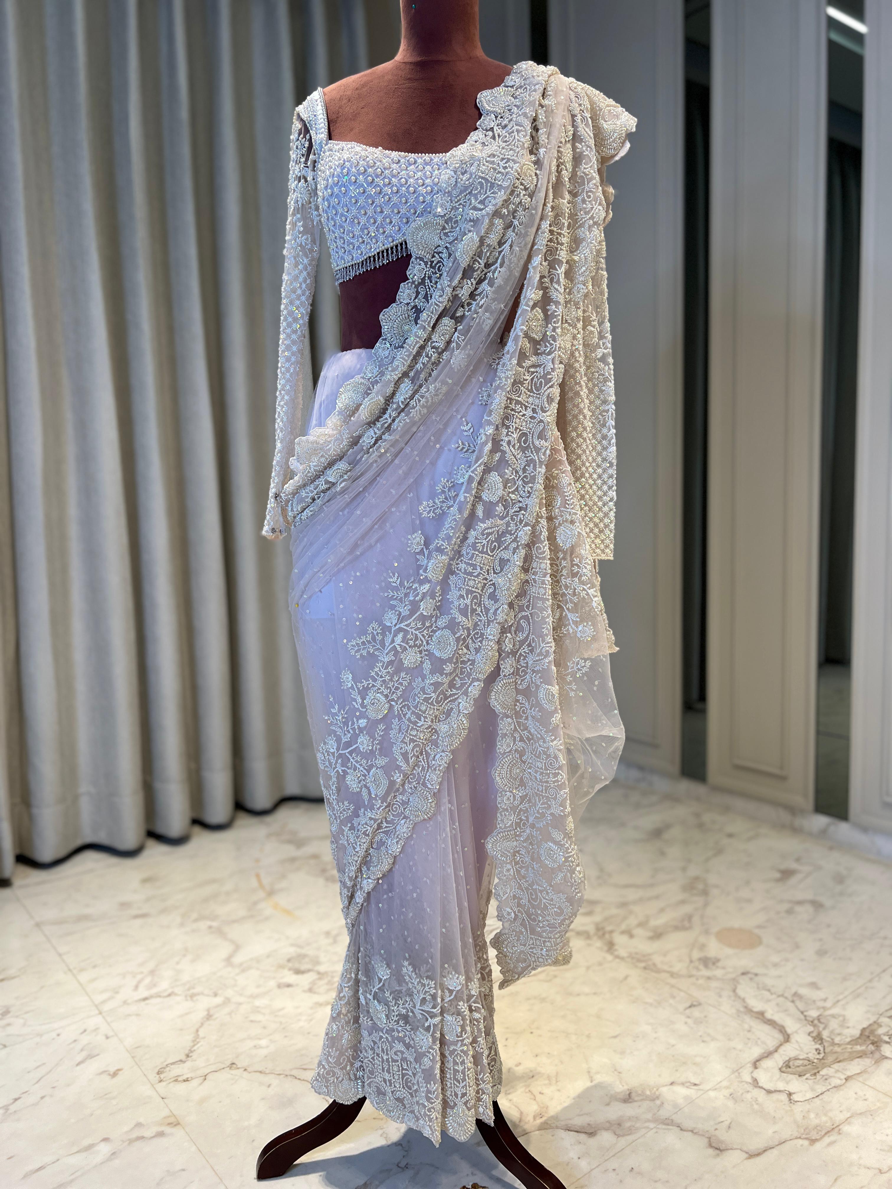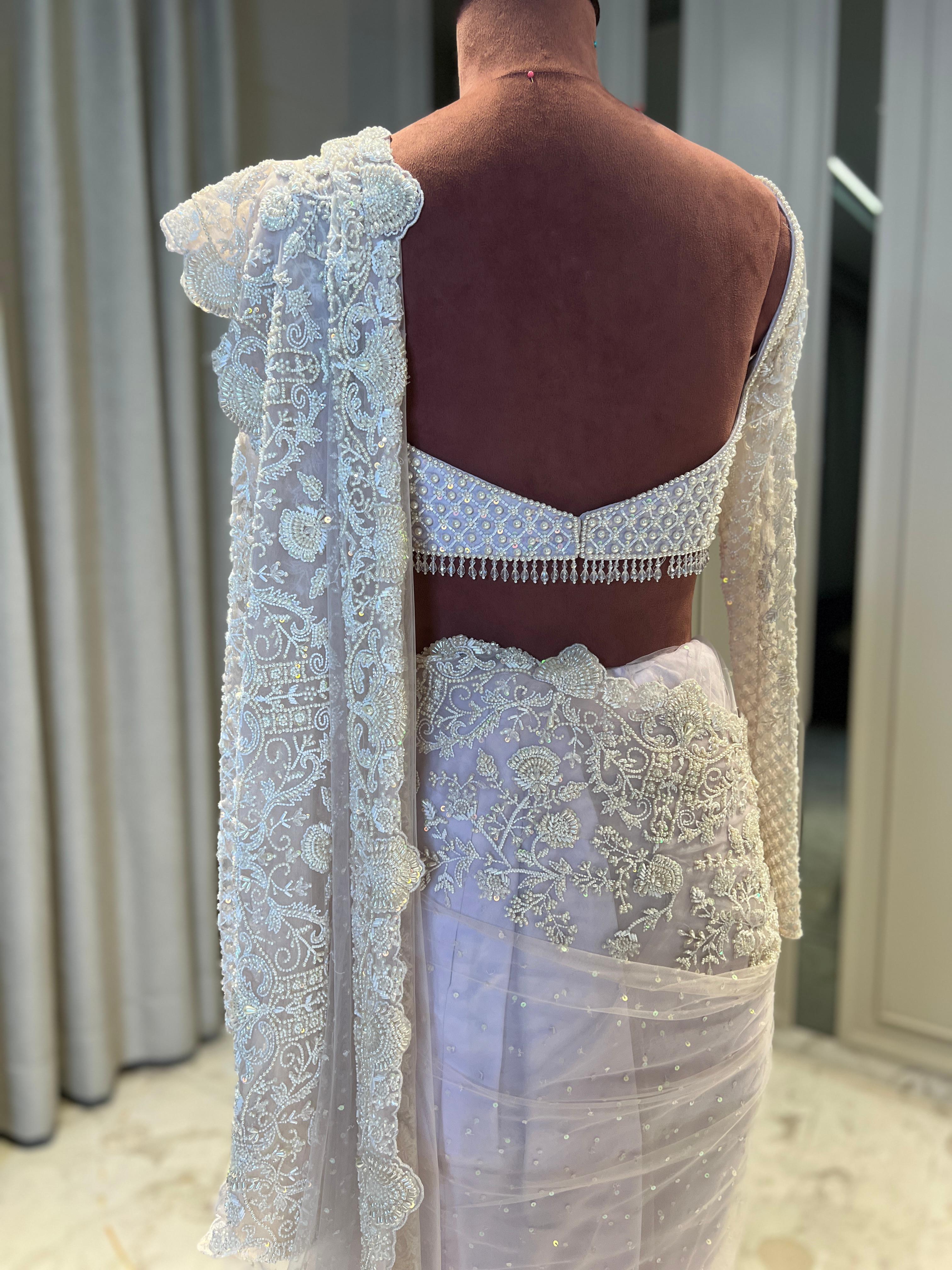 The Inari Saree is a symbol of timeless elegance, rendered in a classic off-white shade adorned with intricate pearl embroidery. The subtle shimmer of pearls creates a graceful effect, enhancing the saree’s simplicity with a touch of opulence. This saree is ideal for intimate celebrations and ceremonial gatherings, seamlessly combining minimalism with sophistication. The Inari Saree’s understated yet radiant design is perfect for those who appreciate refined style with a gentle elegance.