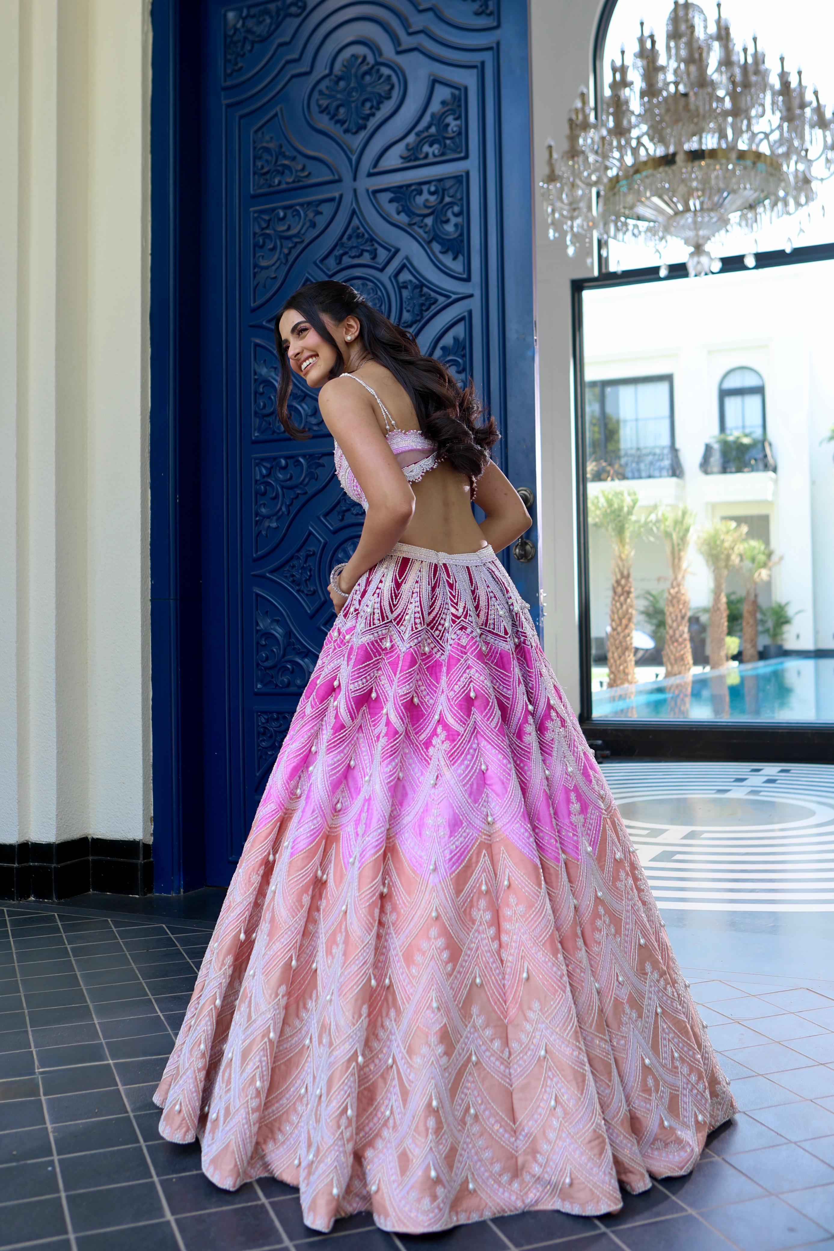 The Jasmine Lehenga begins with a sculpted, butterfly-inspired blouse, its delicate wings defined by hand-embroidered pearls that shimmer with every breath. Below, the skirt unfolds in a soft ombré wash—hues melting from pale blush to deeper rose—each panel traced with crystal and pearl embroidery. At the hem, fine pearl-tassel fringe dances with every step, lending an ethereal grace to your movement. Together, these elements create a vision both whimsical and refined, perfect for a bride seeking understated drama.