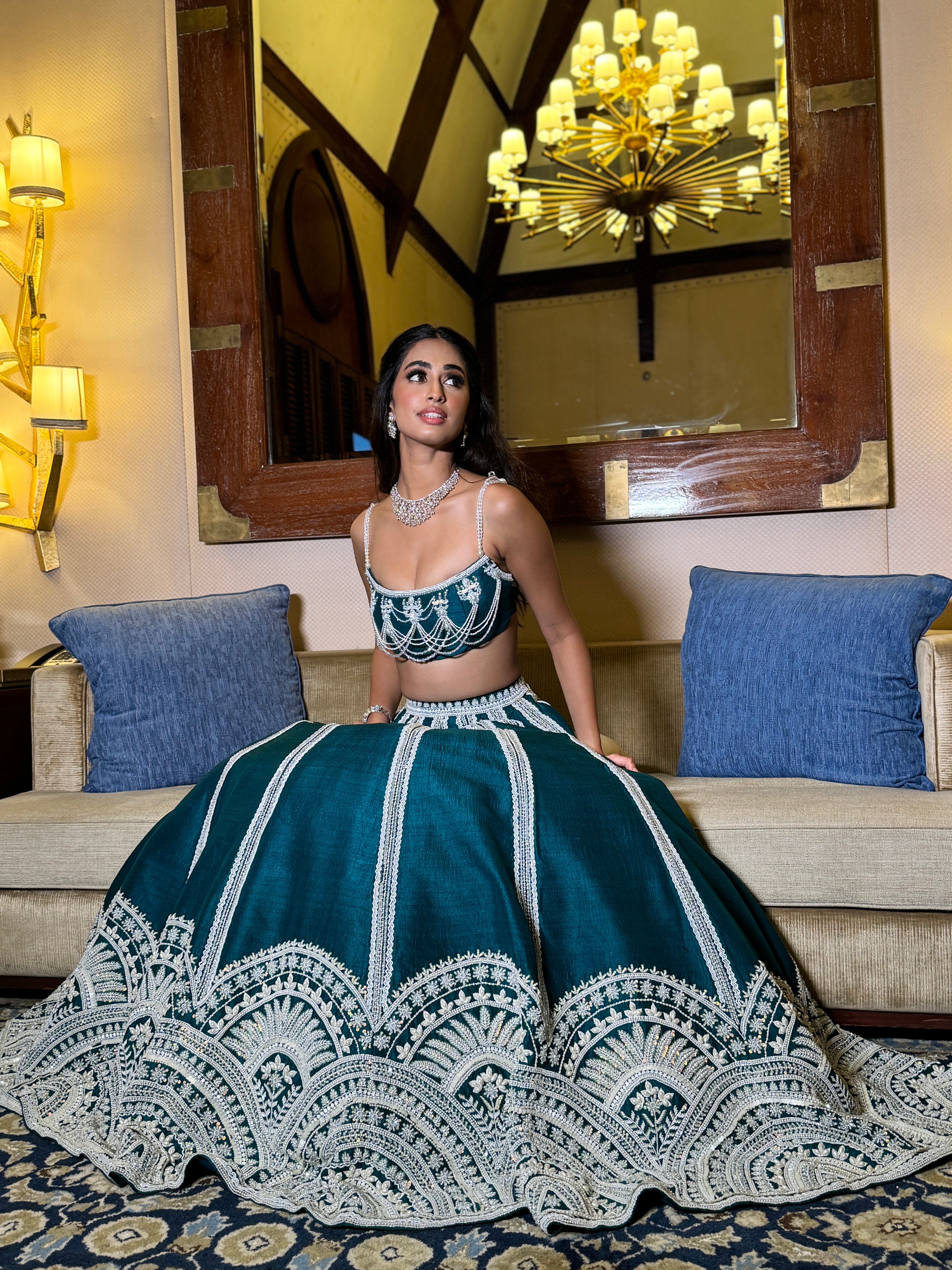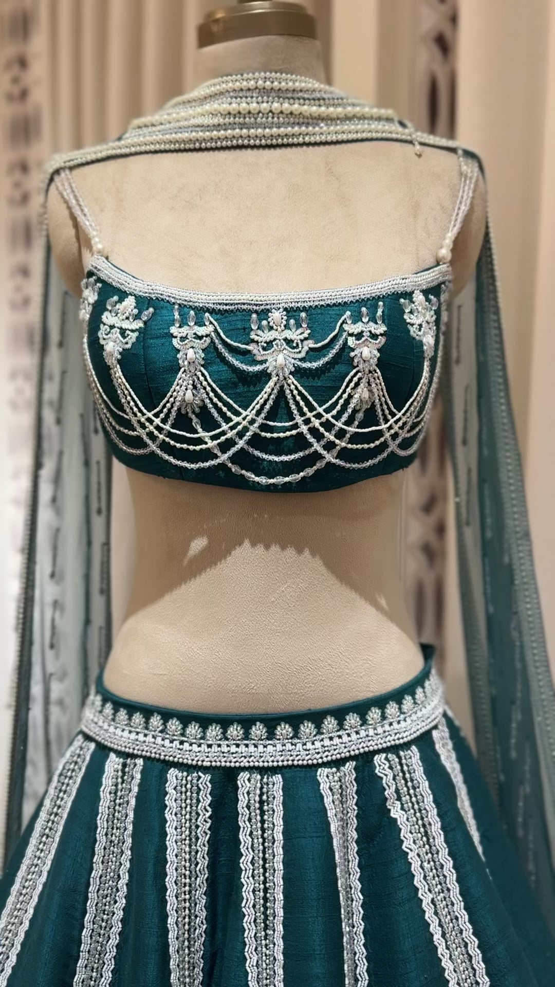 This teal blue raw silk lehenga is a true masterpiece, featuring graceful scalloped embroidery elevated with delicate pearl and thread work. The ensemble is paired with a tassel-adorned blouse, showcasing a crystal-tasseled back for an added touch of glamour. The dupatta, adorned with playful tassels, adds movement and charm to the look. Perfect for special occasions, the Leia Lehenga seamlessly blends timeless craftsmanship with a contemporary flair.