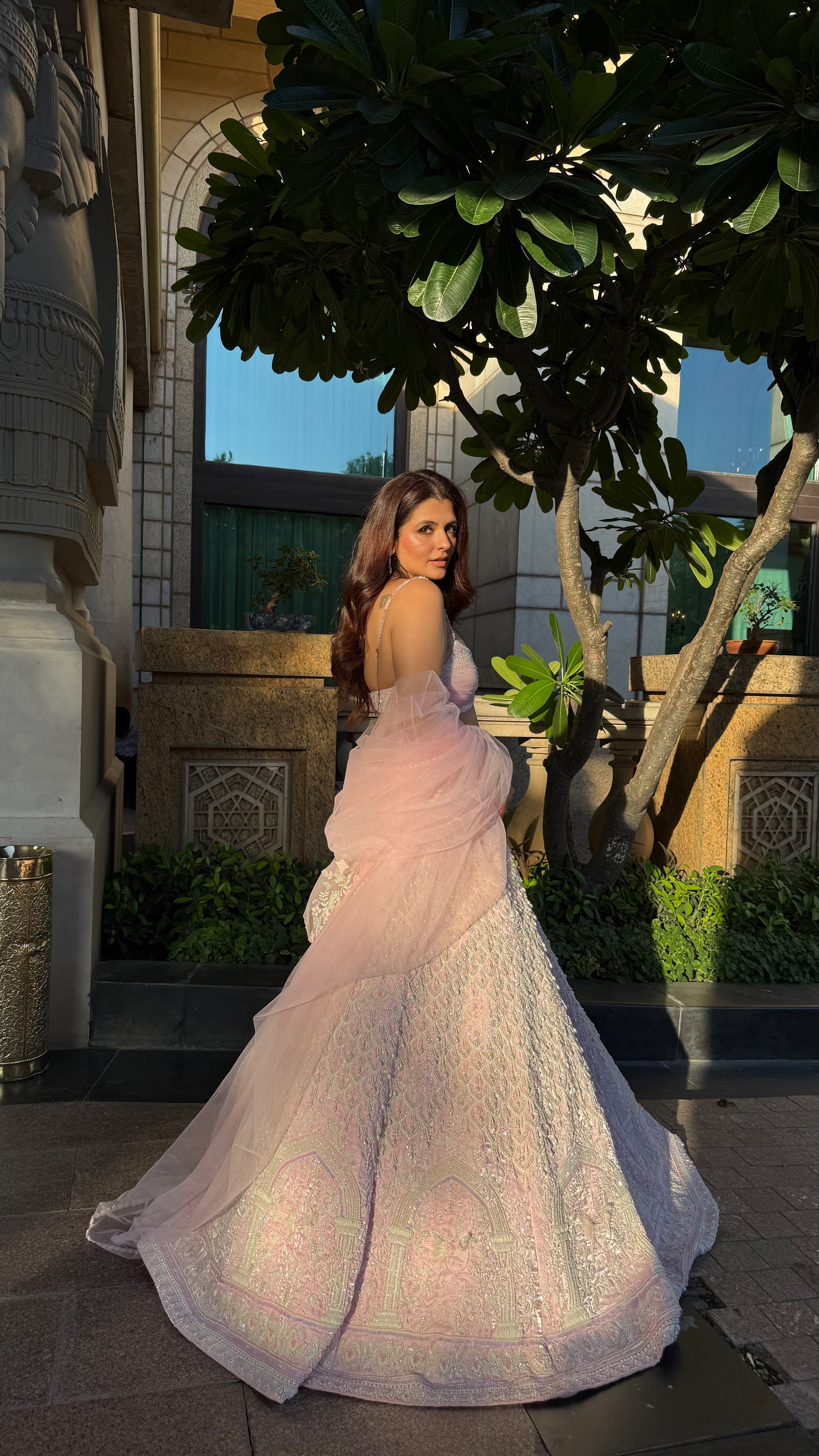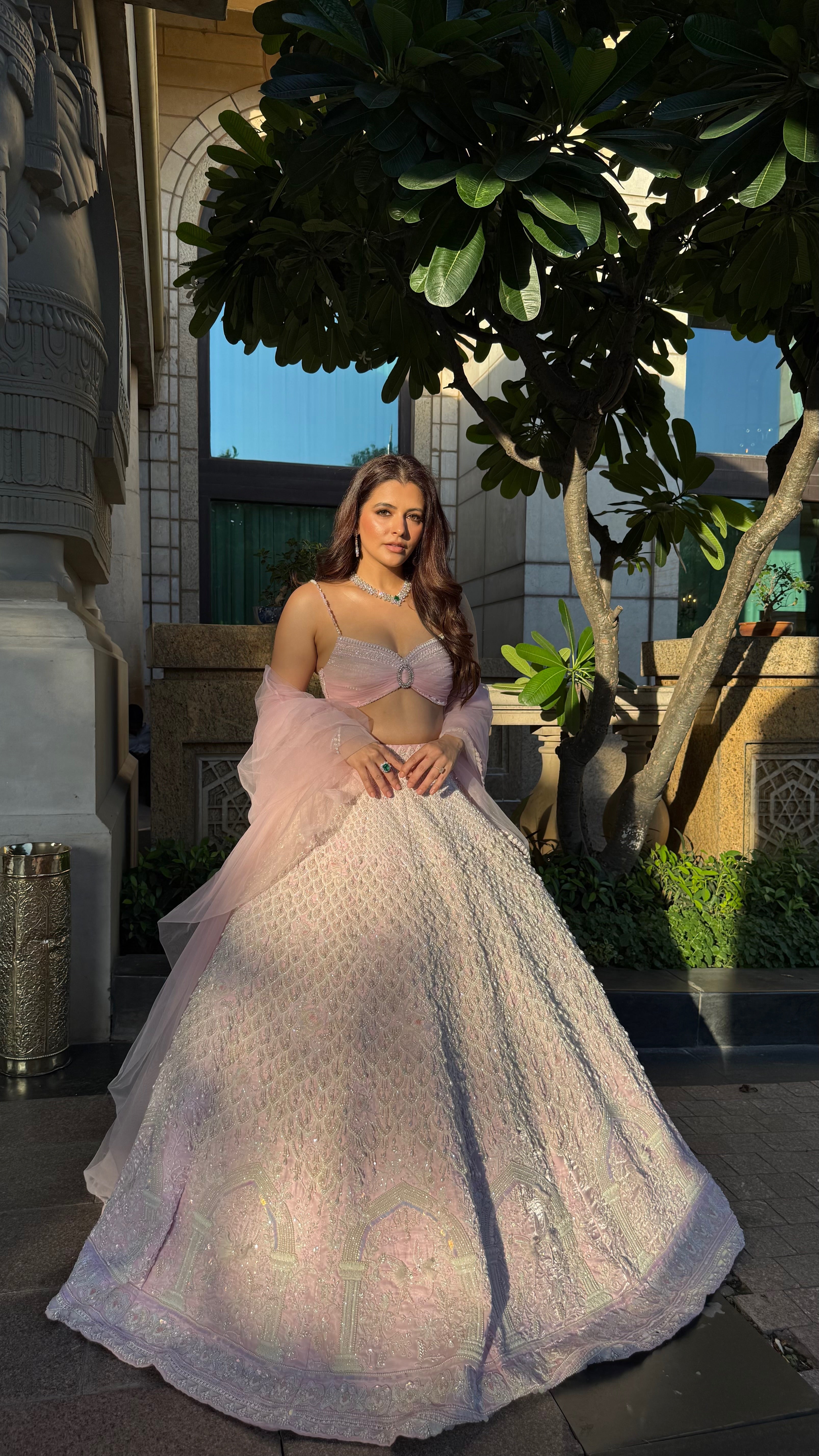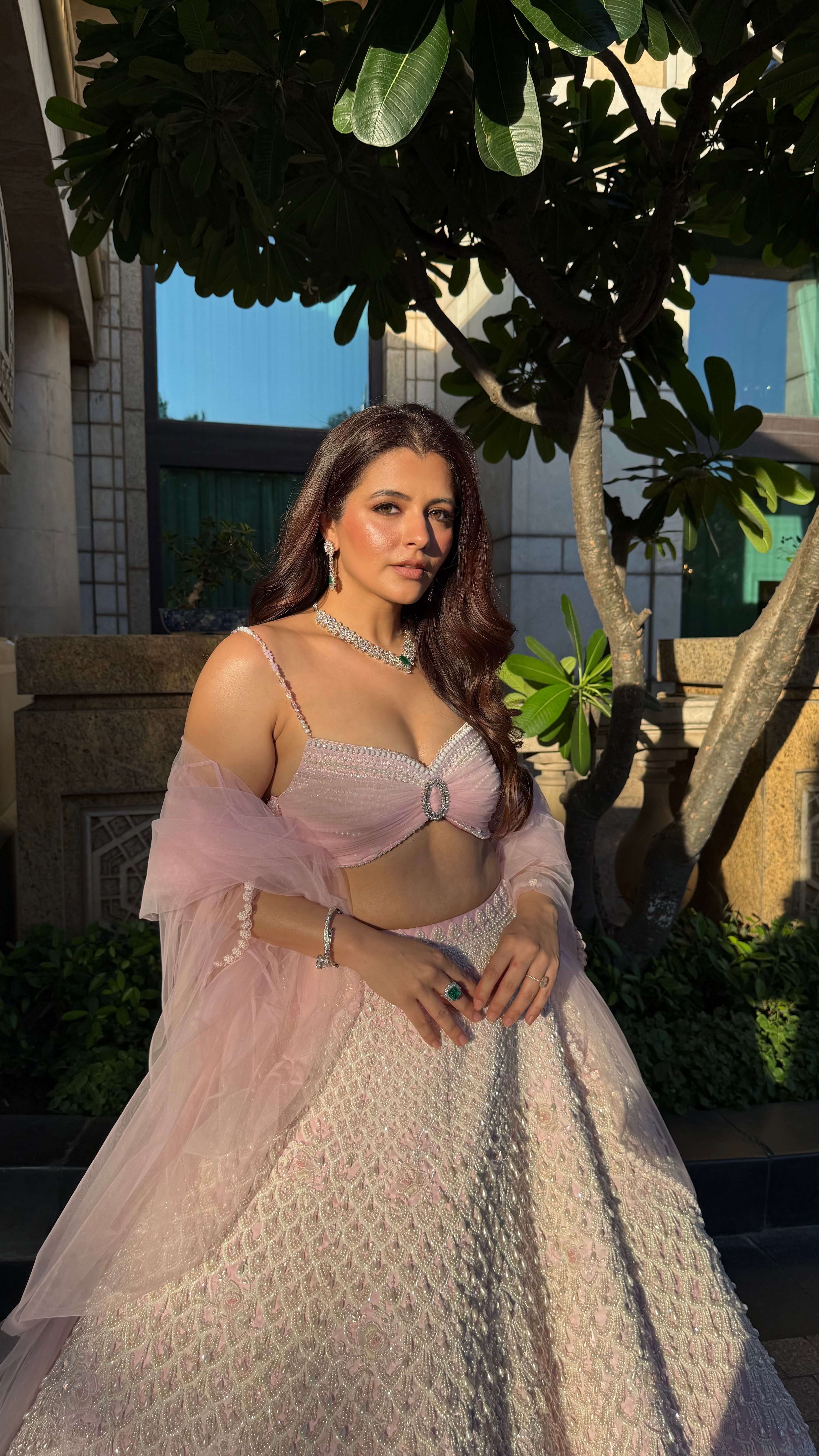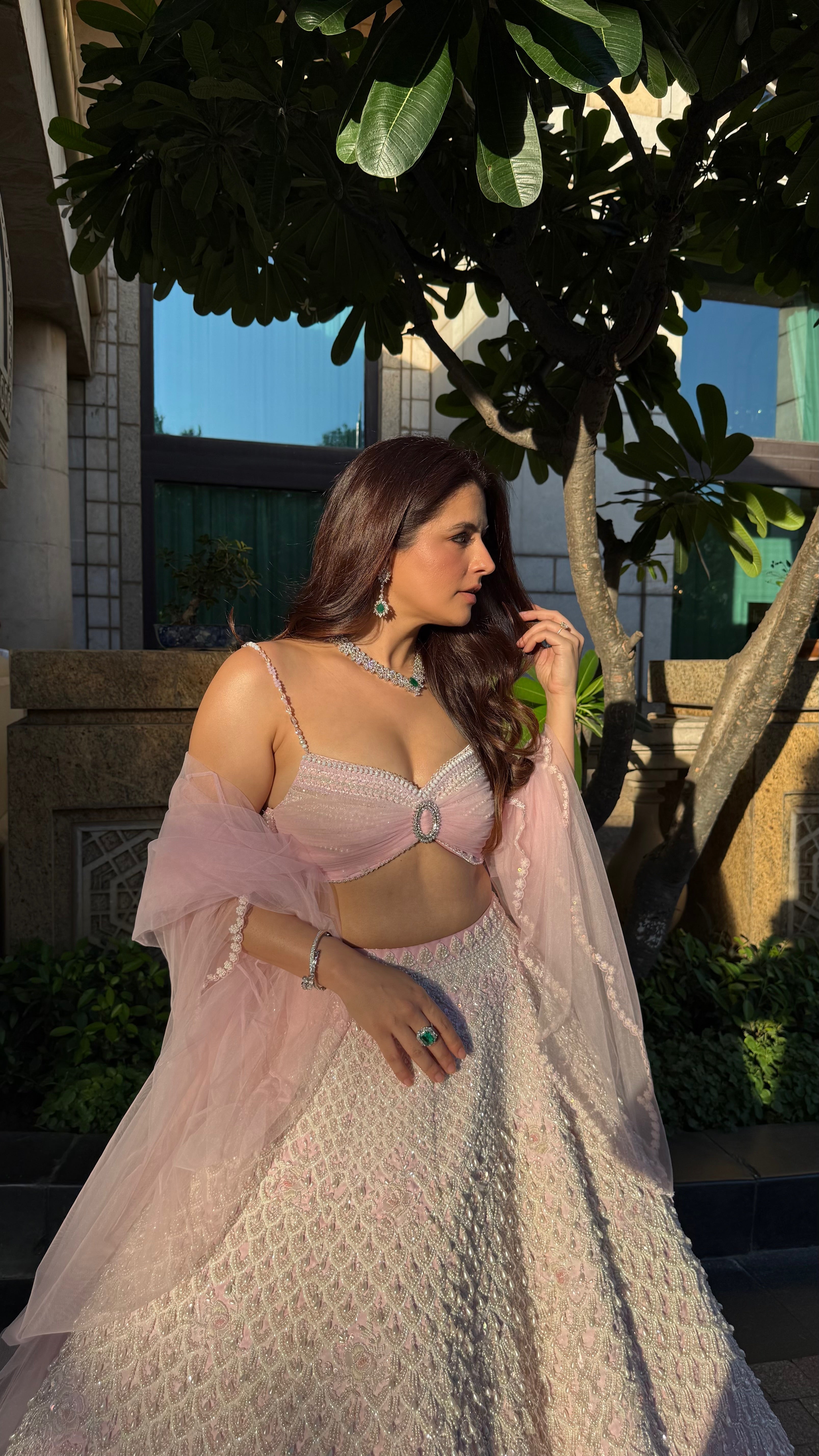 The Love Birds Lehenga is a dreamy ode to romance, crafted in a soft Barbie pink hue that exudes elegance and charm. Adorned with delicate pearl embellishments and intricate embroidery, this ensemble captures the perfect blend of modern sophistication and timeless tradition. The flowing skirt features exquisite detailing that catches the light beautifully, while the chic, knotted blouse adds a contemporary flair. Ideal for daytime celebrations or enchanting evening soirées, this lehenga brings together grace, style, and a touch of whimsical allure—making it a statement piece for the modern muse.