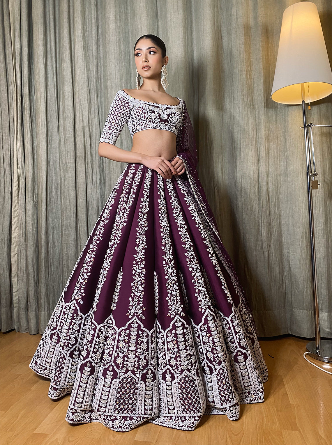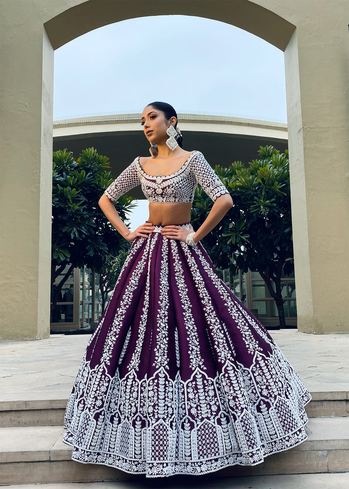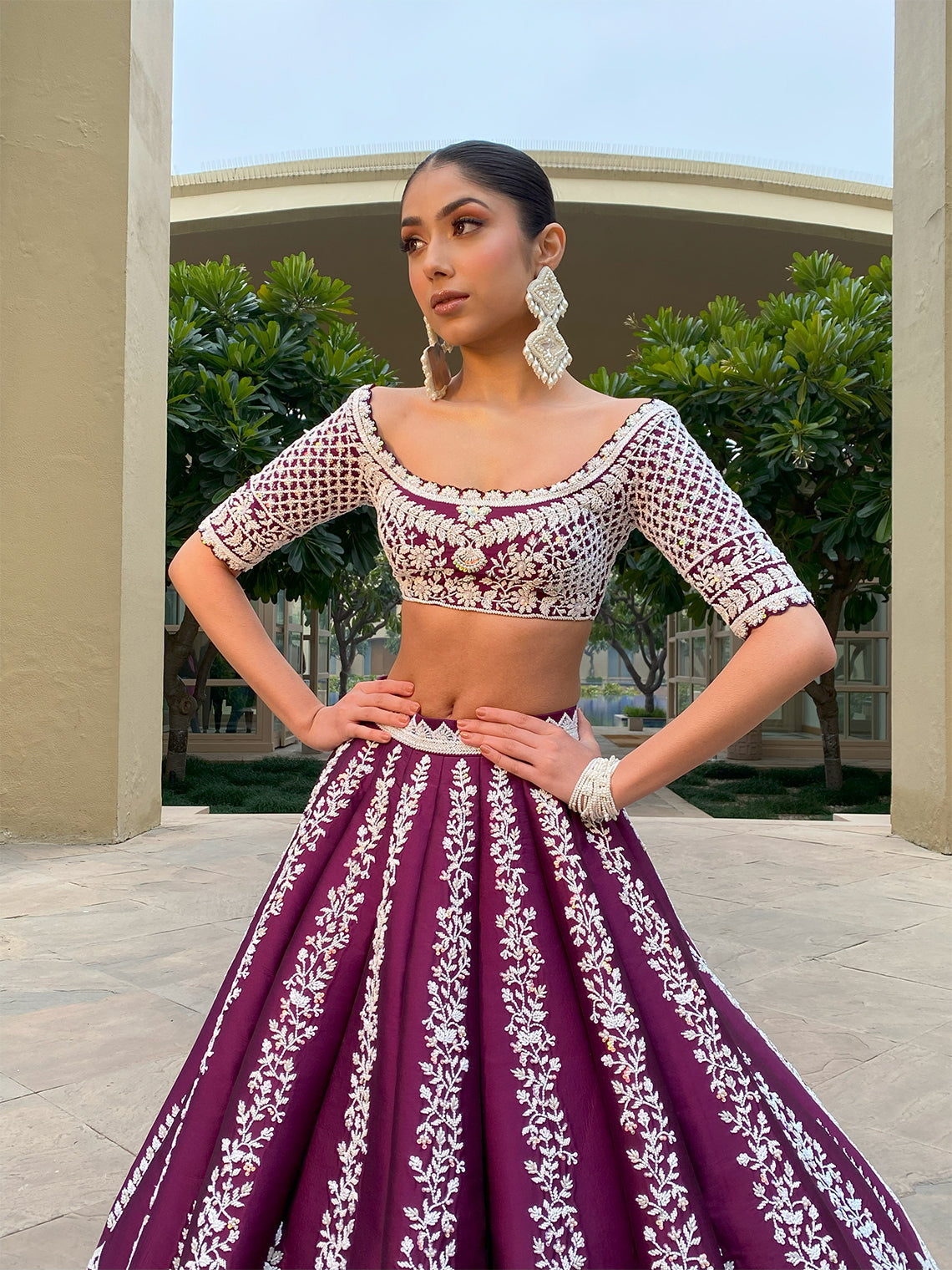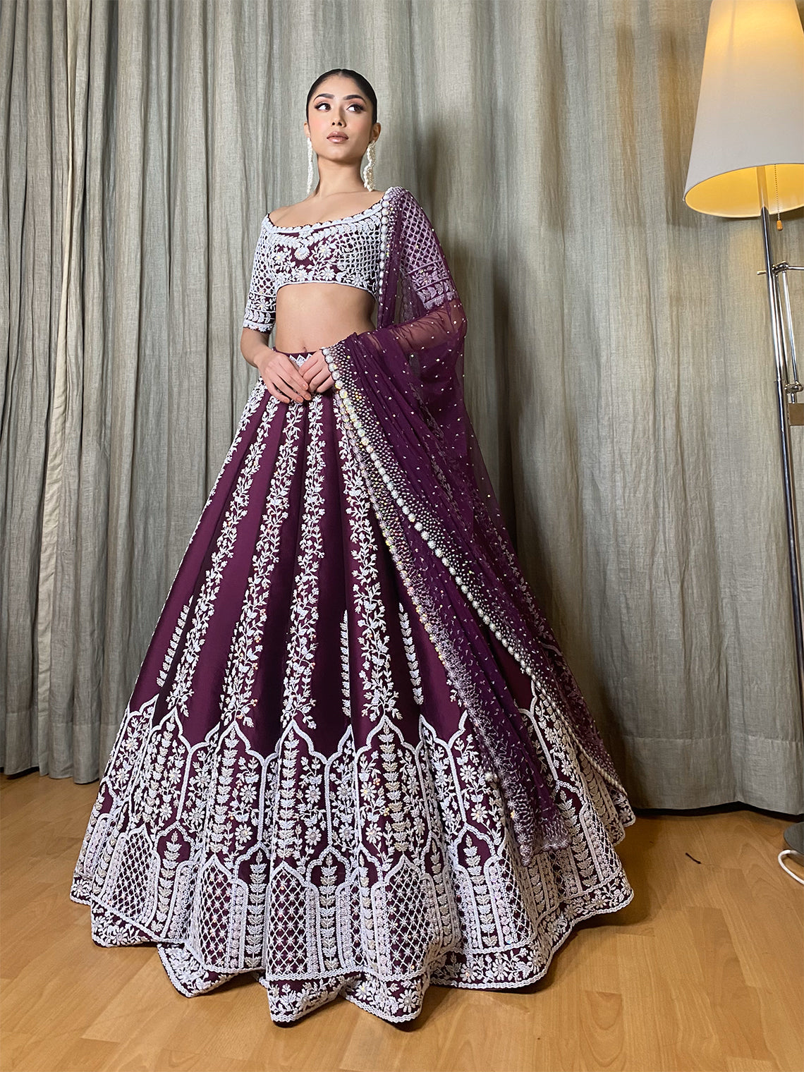 The Milani lehenga set is a Maroon taffeta base Lehenga skirt paired with soft net dupatta with golden embroidered borders. And top is detailed with golden pearls, sequins, cut dana, beads and nalki. The blouse hem and sleeves has beautiful golden tassels to enhance the look.