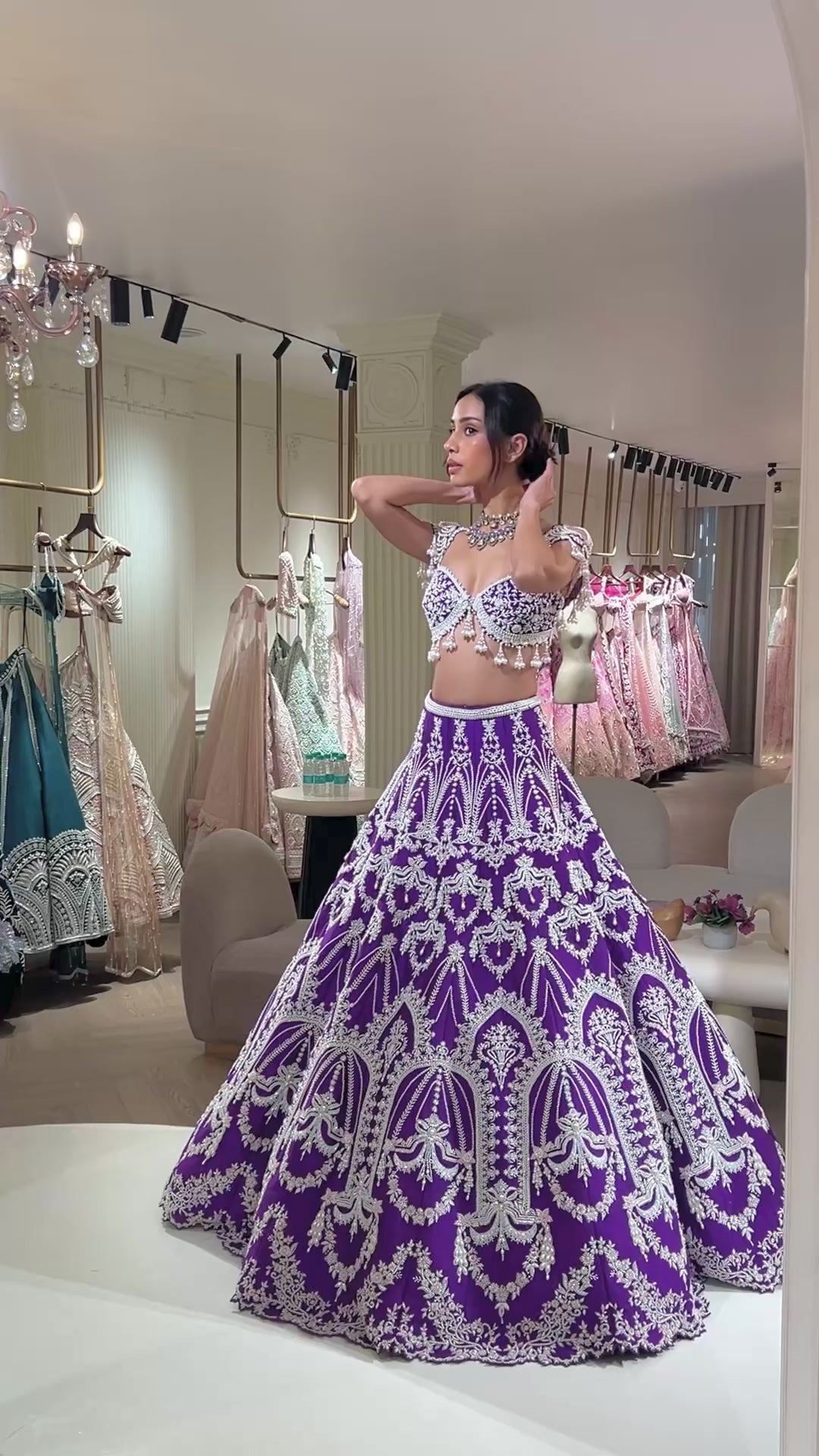 Step into regal elegance with this royal purple lehenga, intricately hand-embroidered with silver thread and sequin work. The structured corset-style blouse is adorned with pearl tassels and delicate bead details, adding a touch of contemporary allure to its traditional grandeur. The voluminous skirt features architectural motifs inspired by palace arches and vintage baroque artistry, creating a mesmerising interplay of craftsmanship and design. Paired with a matching dupatta edged in ornate embroidery, this ensemble captures the essence of luxury bridal couture—perfect for receptions, sangeet nights, or statement occasions.