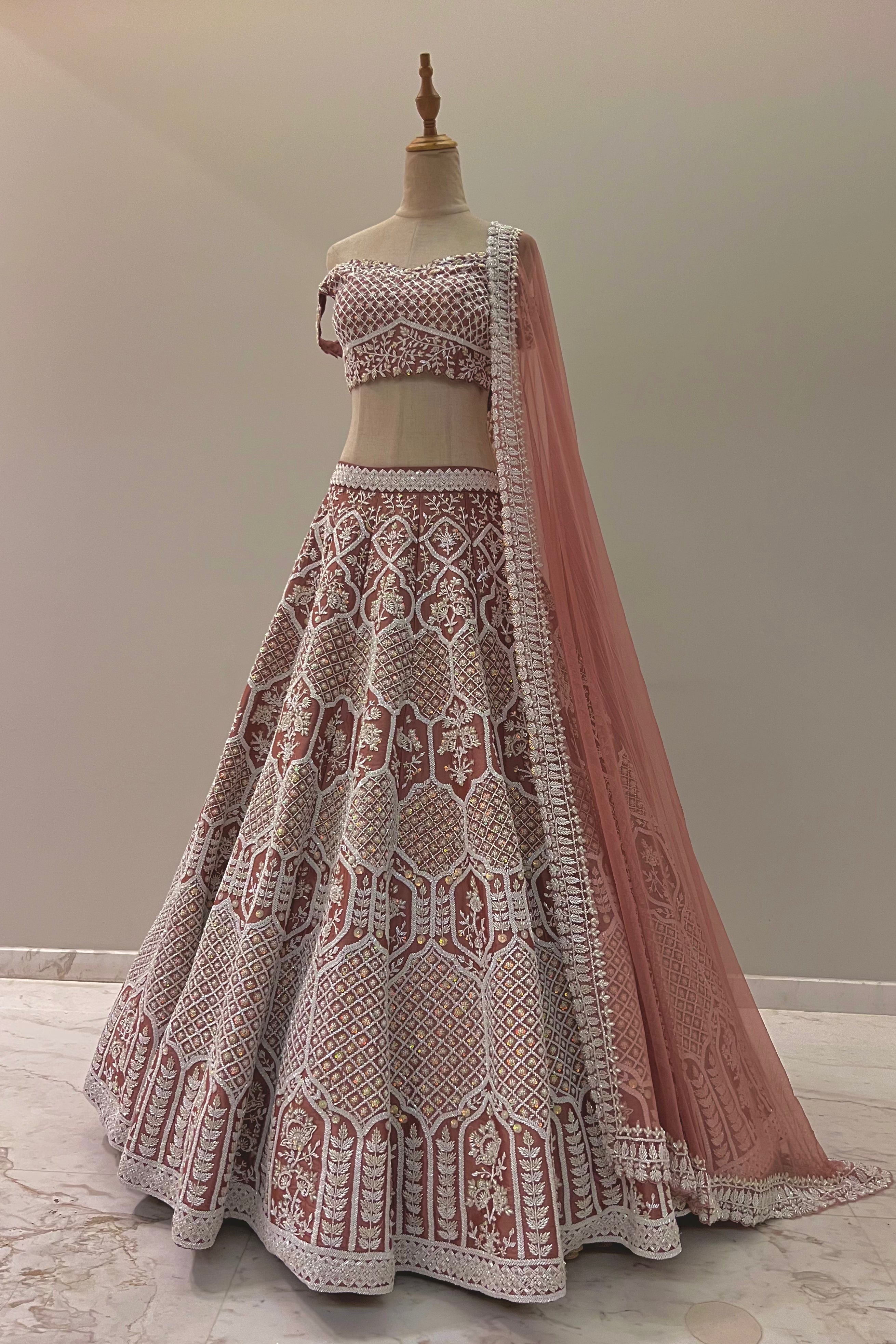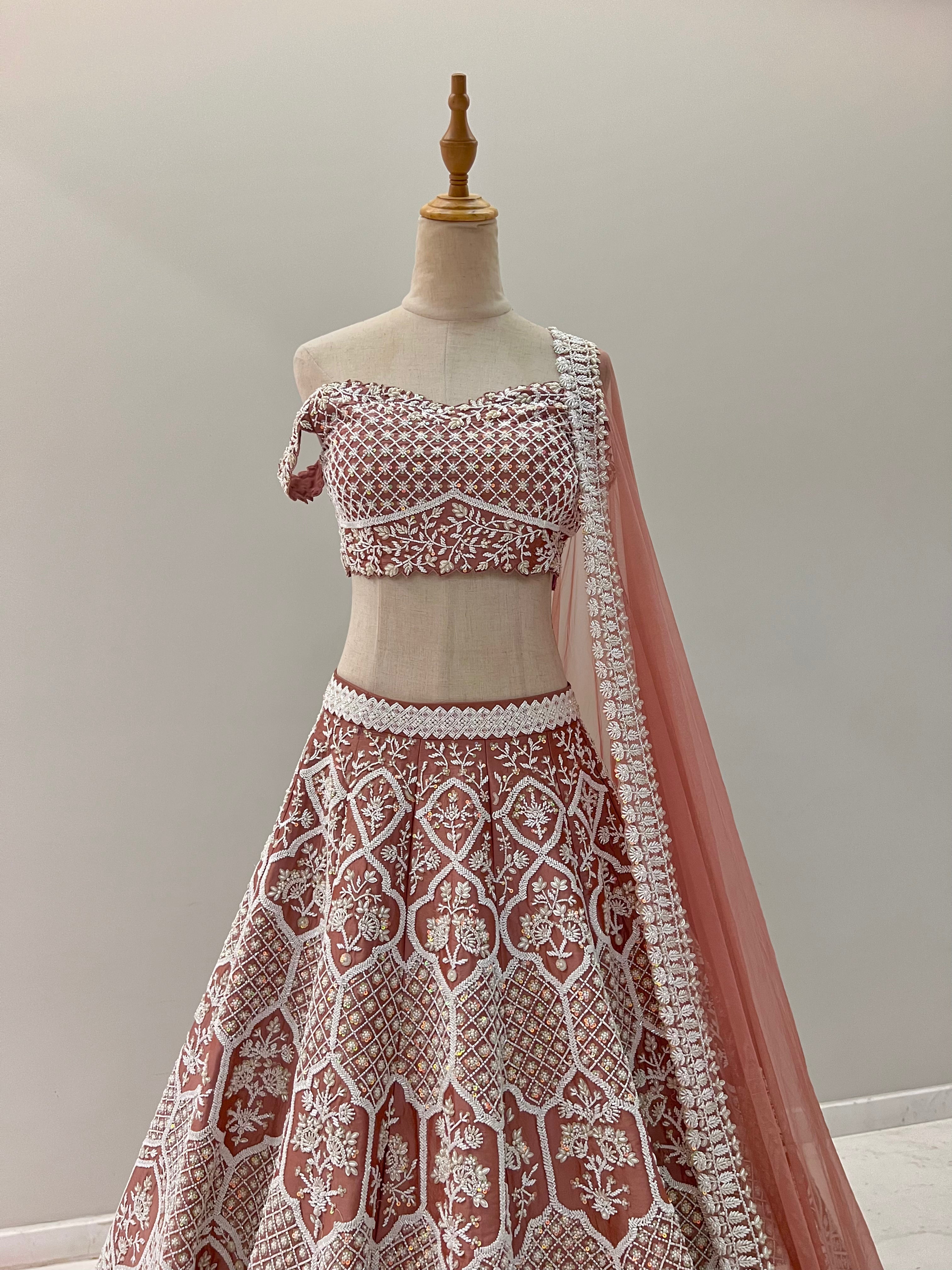 Our Nimran lehenga set is a perfect combination of floral and geometrical embroidery. The lehenga is purely hand embroidered with our classic pearls, cut dana, glass beads and sequins on an onion pink silk taffeta fabric. The lehenga is paired with a beautiful off hsoulder blouse and a soft net dupatta.