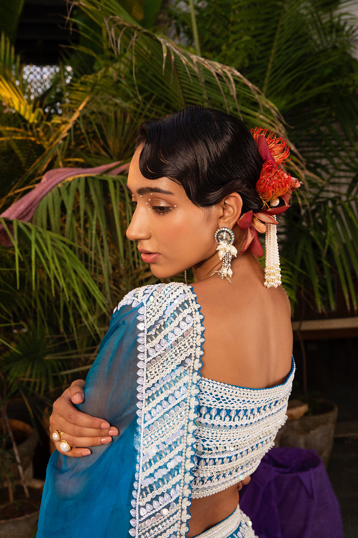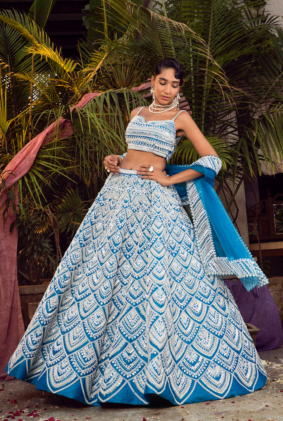 The Noemi is a beautifully hand embroidered lehenga set on pure raw silk base. The set is hand embroidered with sequins, pearls and cutdanas. The lehenga is paired with a pure organza dupatta with a beautiful embroidered border.