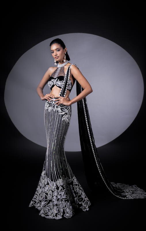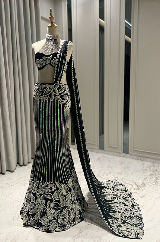 Our scintillating Priscilla from our Ebony and Ivory collection is an elegant concept saree to make a statement and yet lean on something effortless to carry on with your celebrations. Priscilla saree is a metallic georgette saree purely hand embroidered with sequins, pearls, crystals, glass beads and cut dana. The saree is paired with a really stunning halter neck blouse tucked with pearls, crystals and sequins.