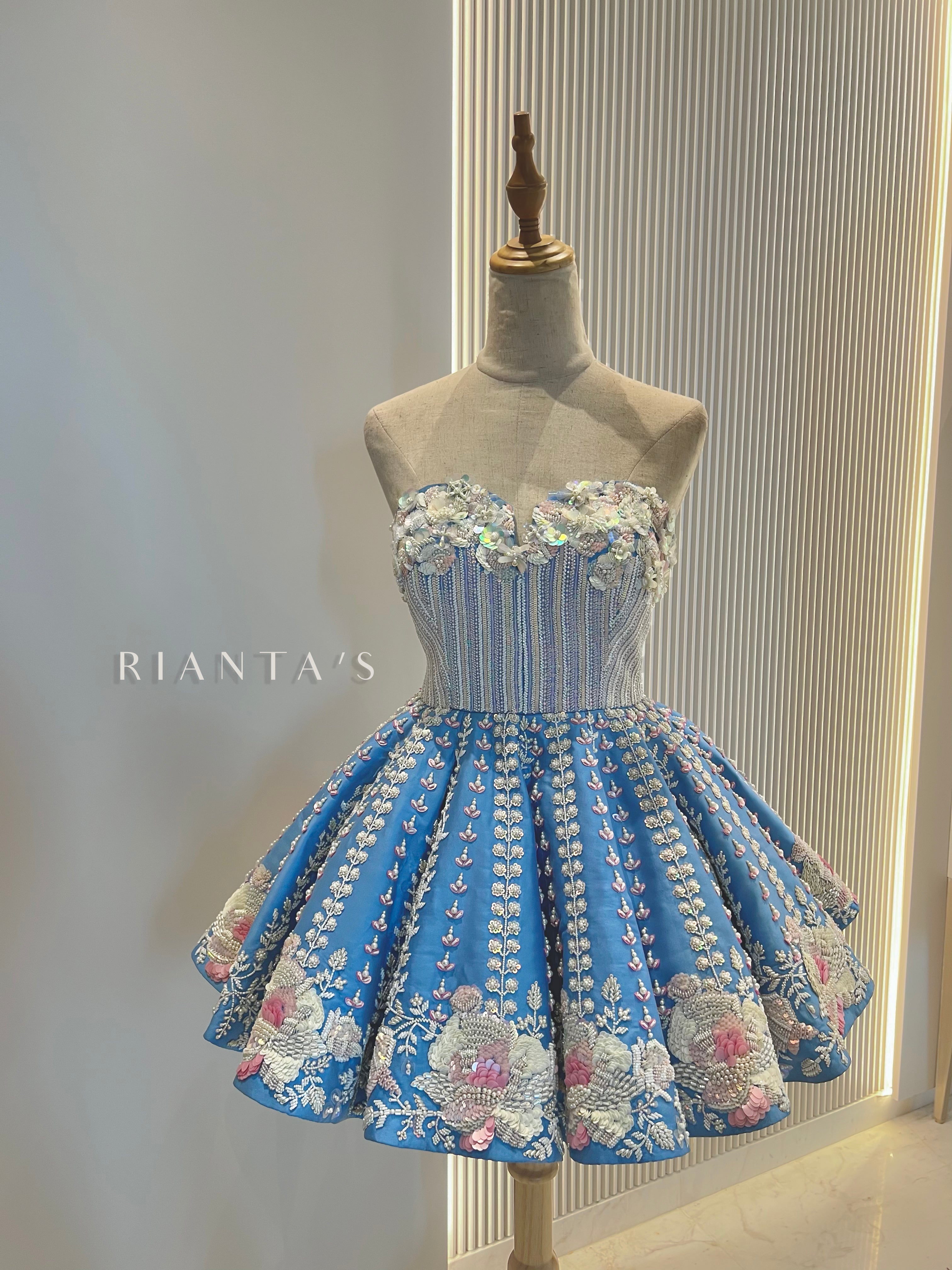 Reva Dress is a dreamy Ceramic blue taffeta dress with our signature pearls, stunning colourful sequins, beads, glass beads