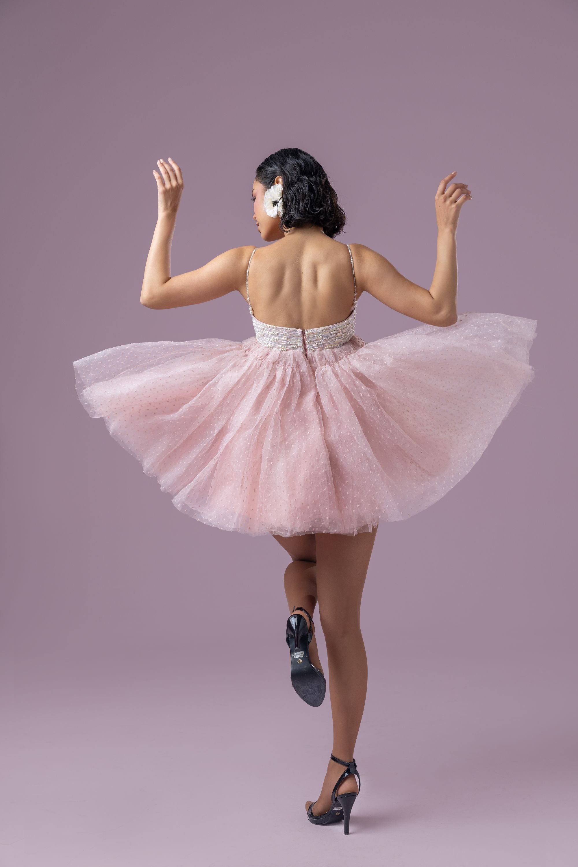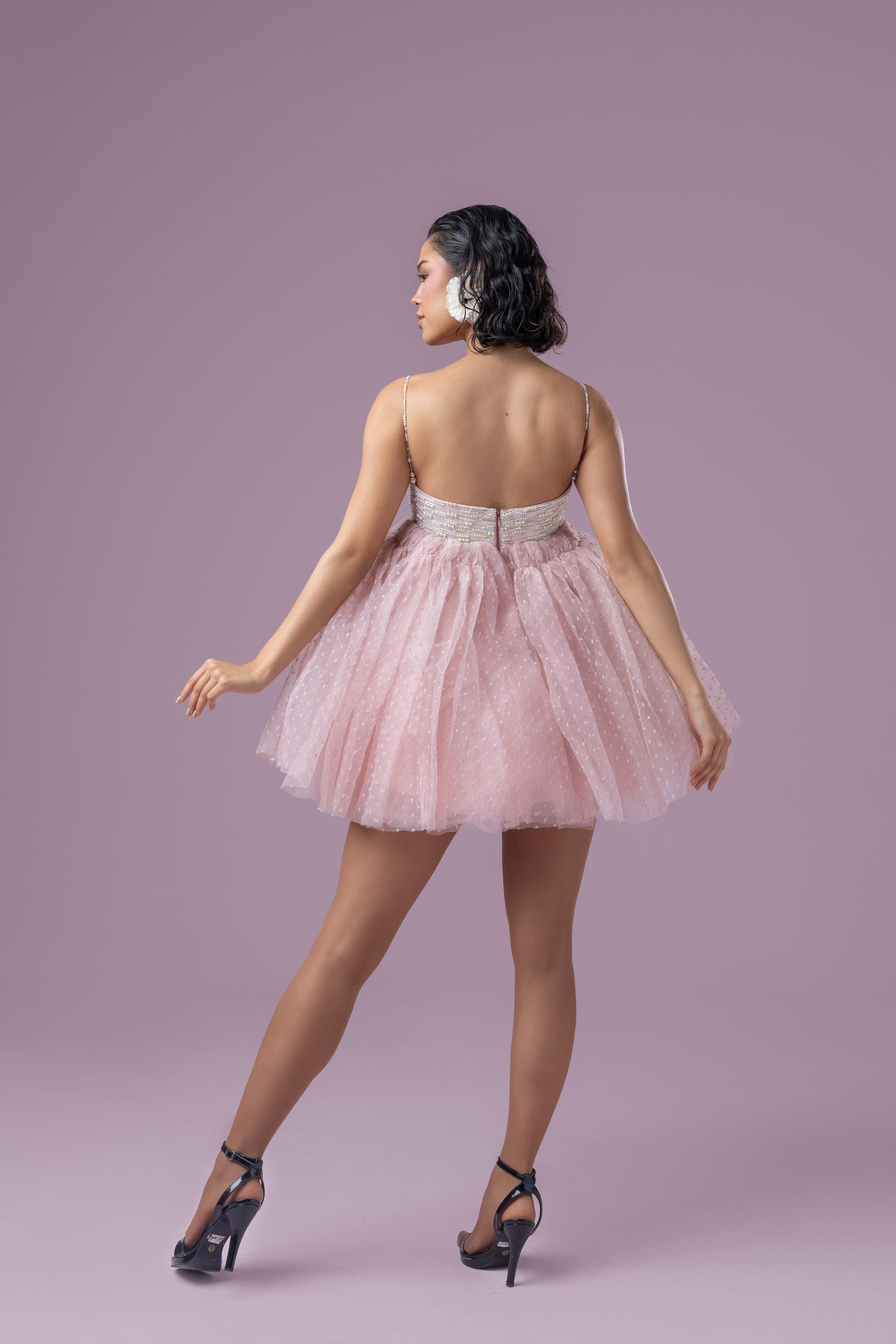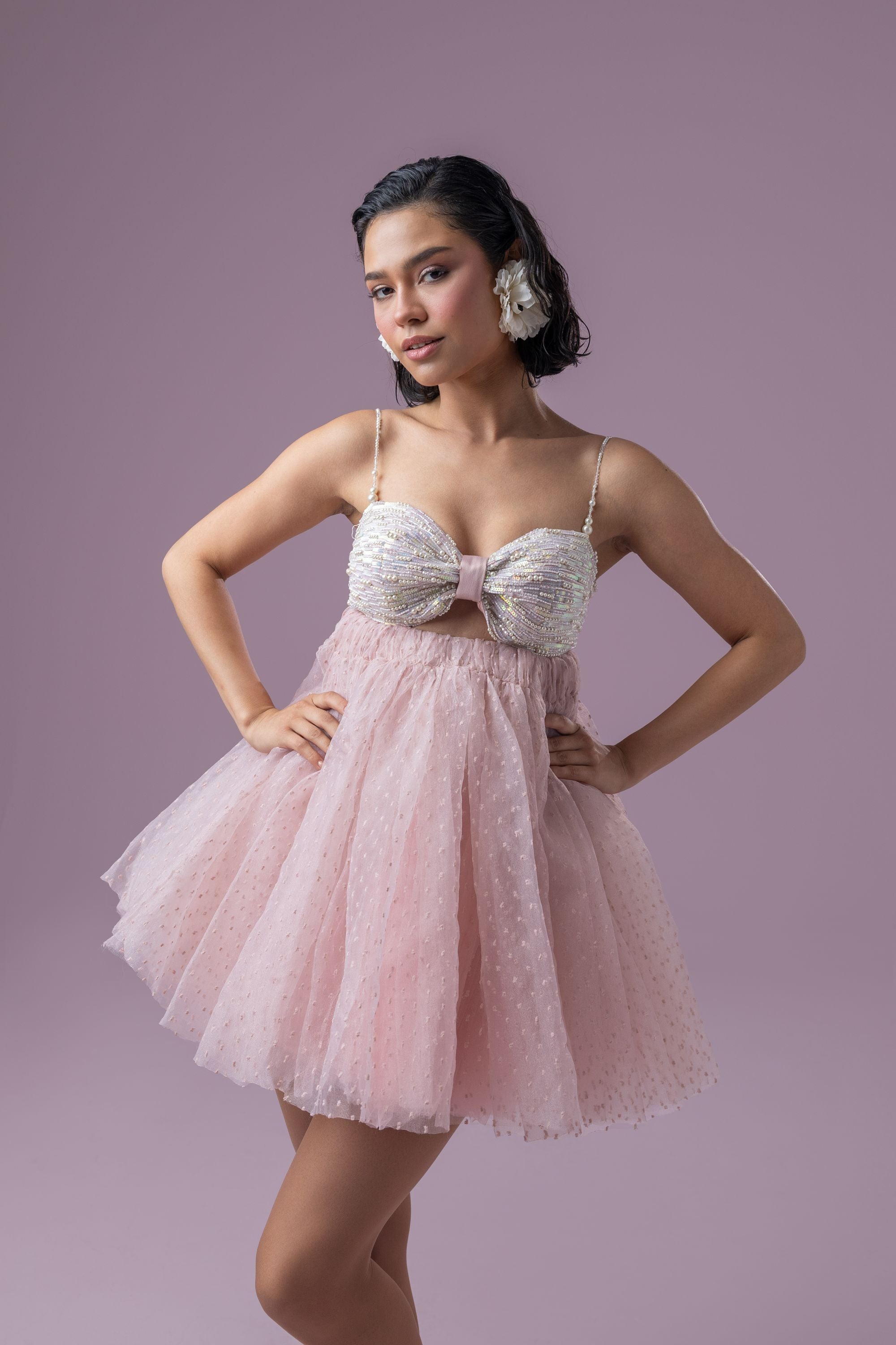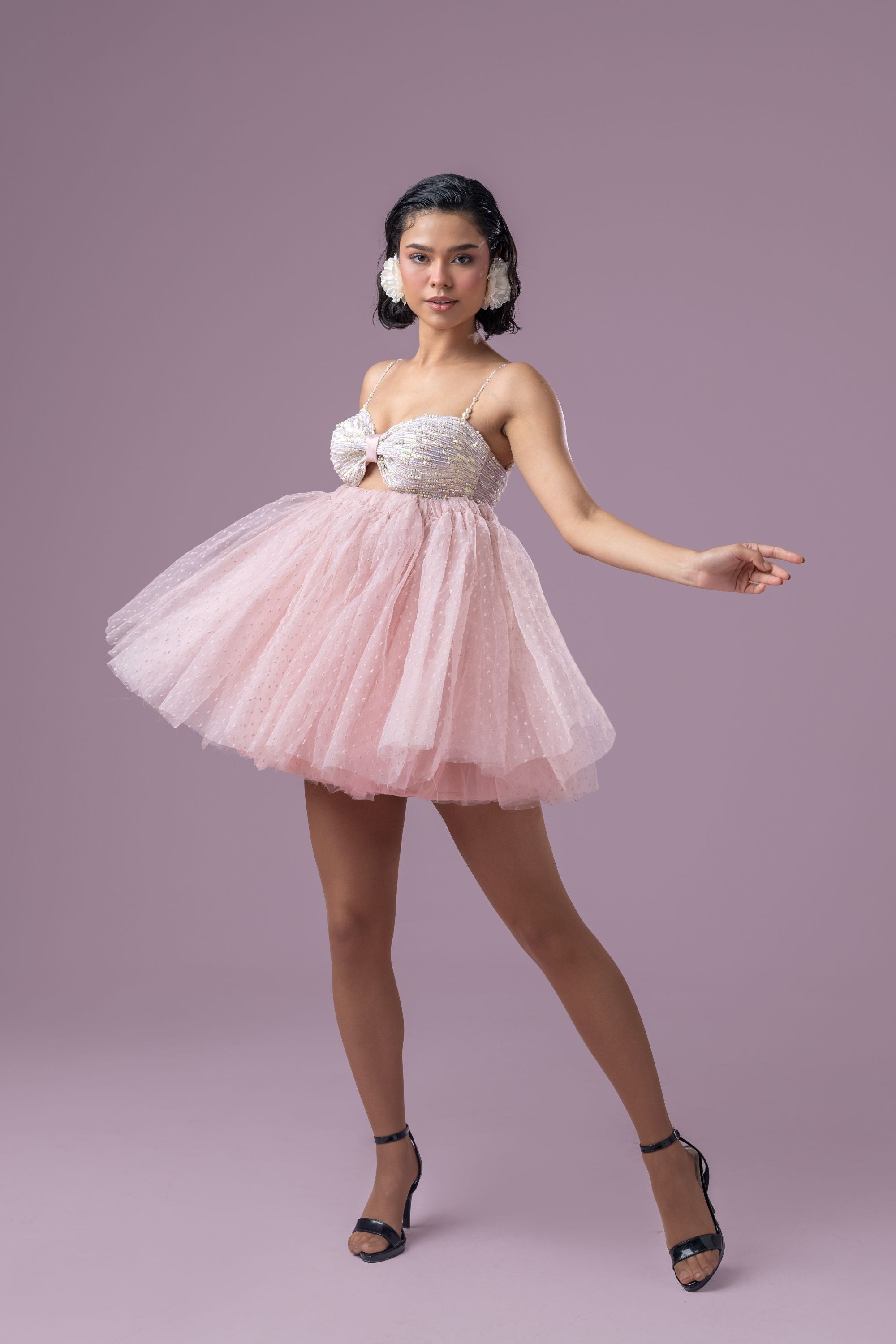 This dreamy dusty rose pink rosette tutu dress exudes elegance and charm. The bustier is adorned with intricate hand embroidery featuring pearls and sequins, adding a touch of opulence. Delicate pearly straps enhance its ethereal appeal, while the voluminous skirt showcases layered textured organza and soft tulle for a graceful, flowing silhouette. Finished with a zip enclosure, this dress is a perfect blend of sophistication and whimsy.