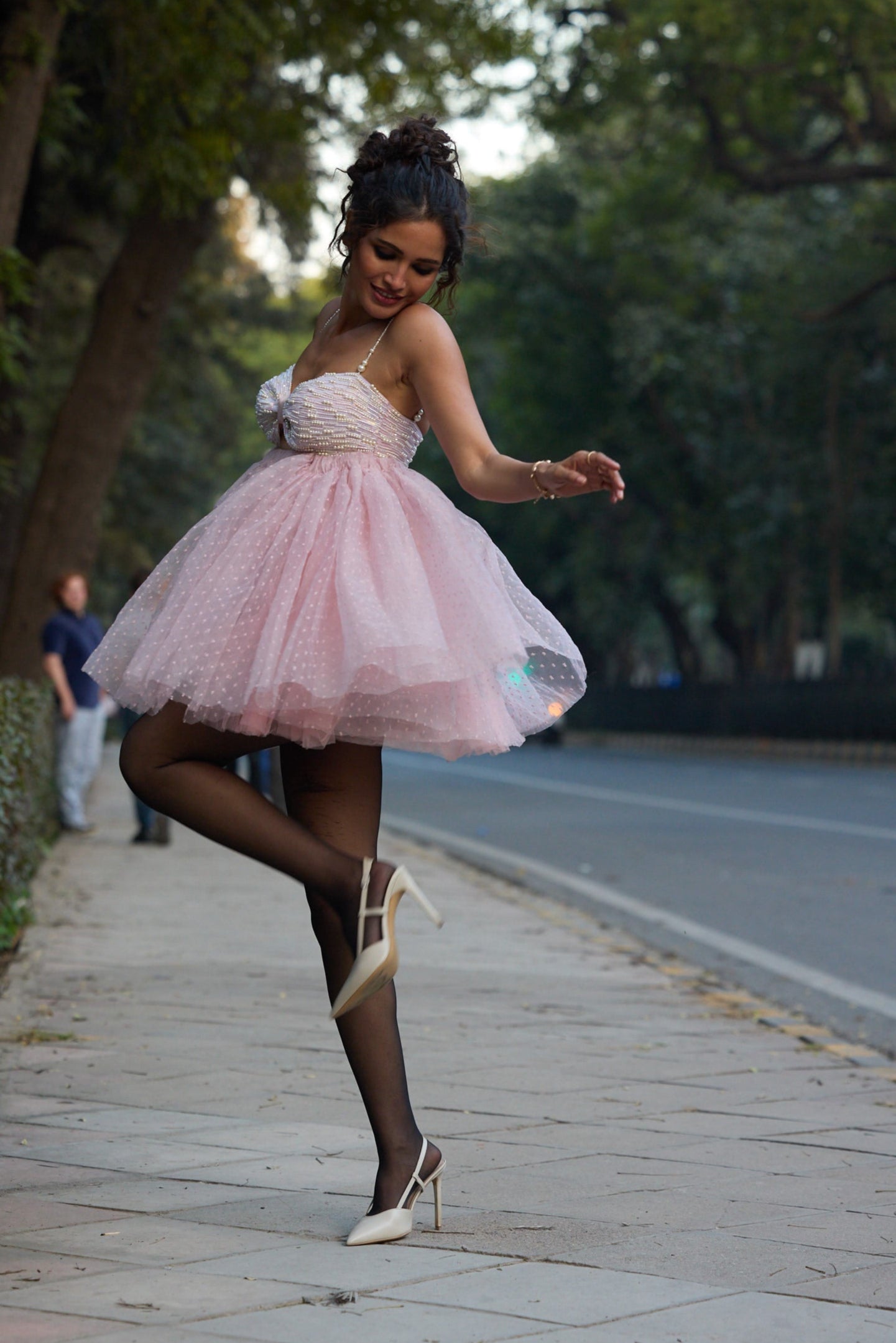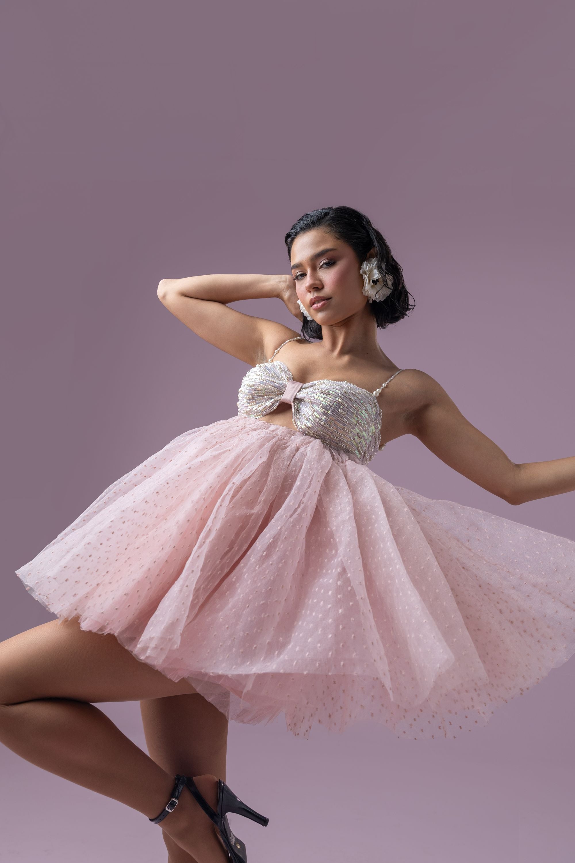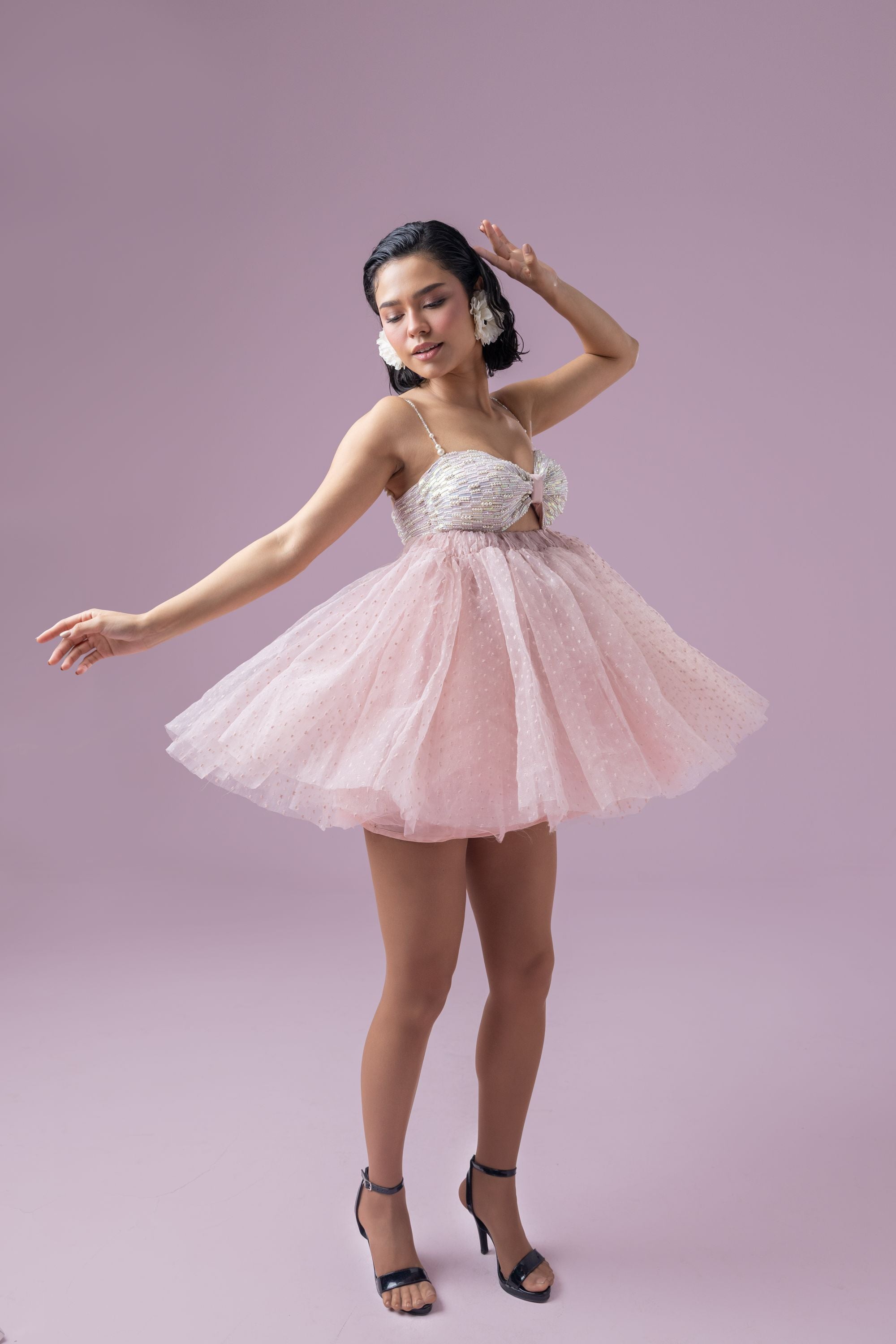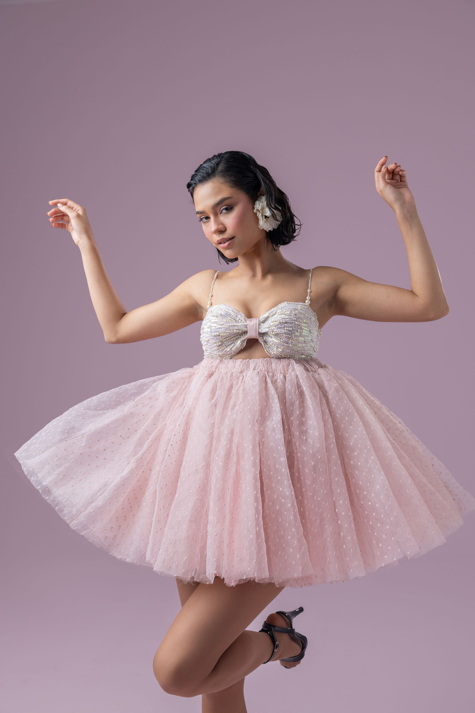 This dreamy dusty rose pink rosette tutu dress exudes elegance and charm. The bustier is adorned with intricate hand embroidery featuring pearls and sequins, adding a touch of opulence. Delicate pearly straps enhance its ethereal appeal, while the voluminous skirt showcases layered textured organza and soft tulle for a graceful, flowing silhouette. Finished with a zip enclosure, this dress is a perfect blend of sophistication and whimsy.