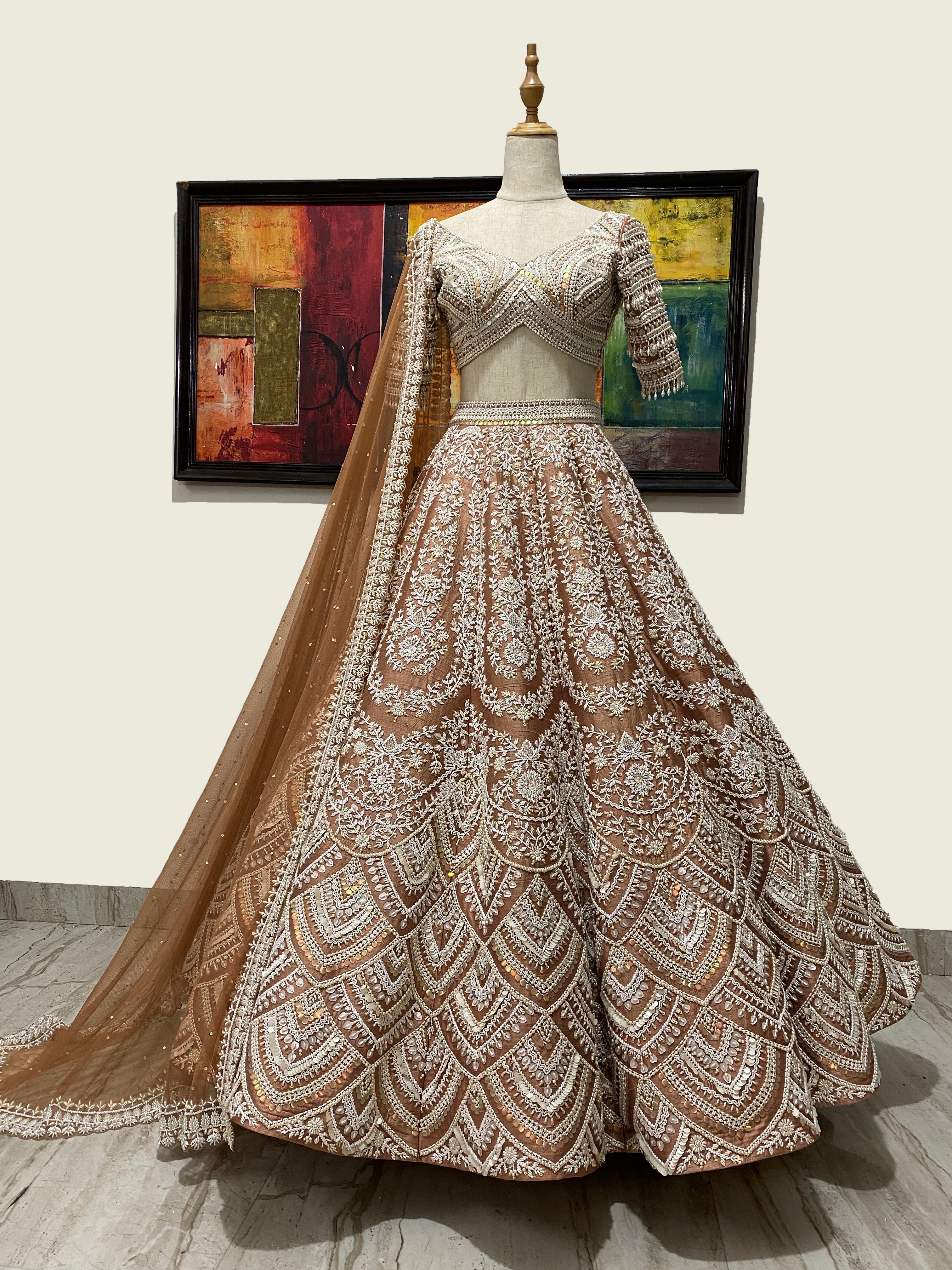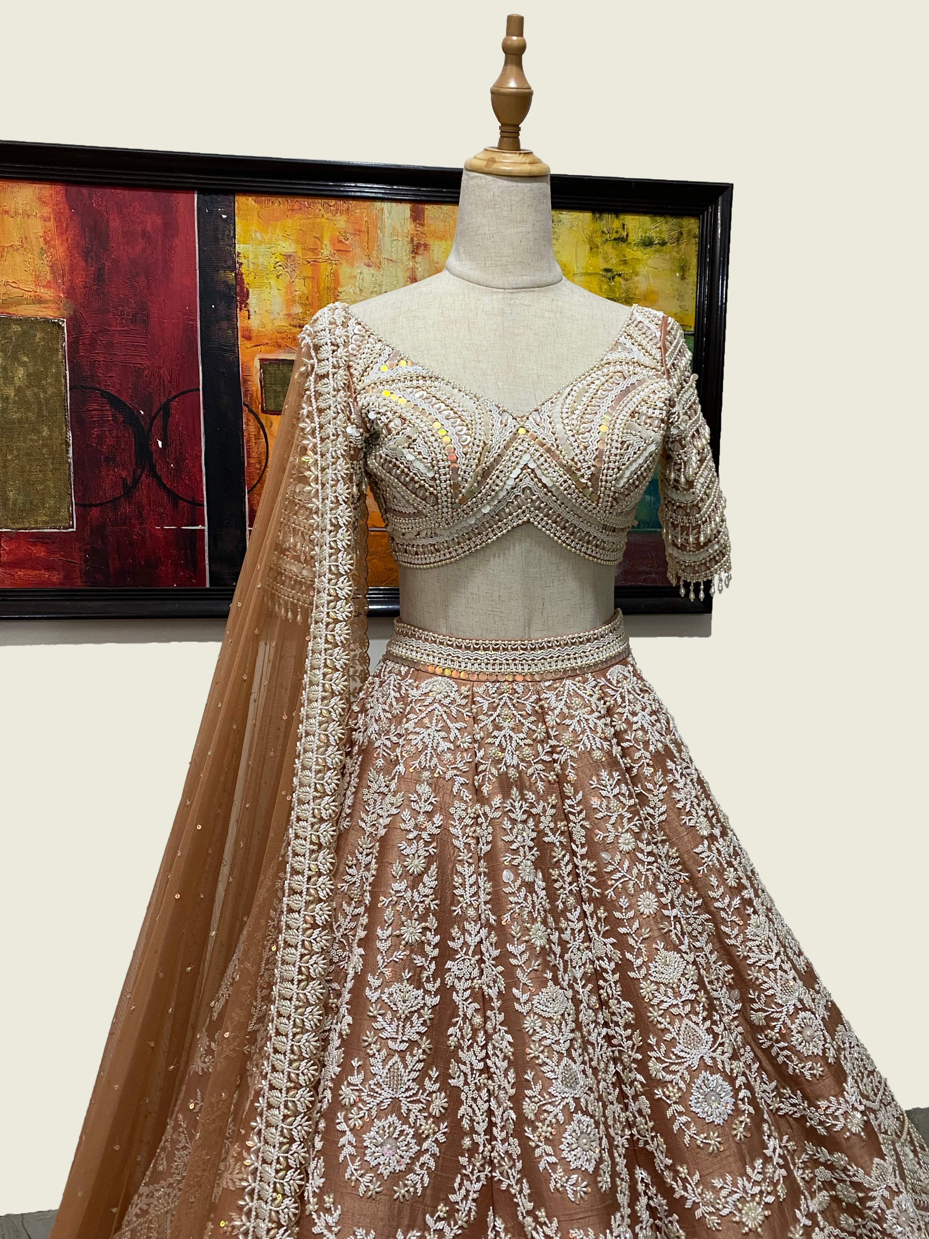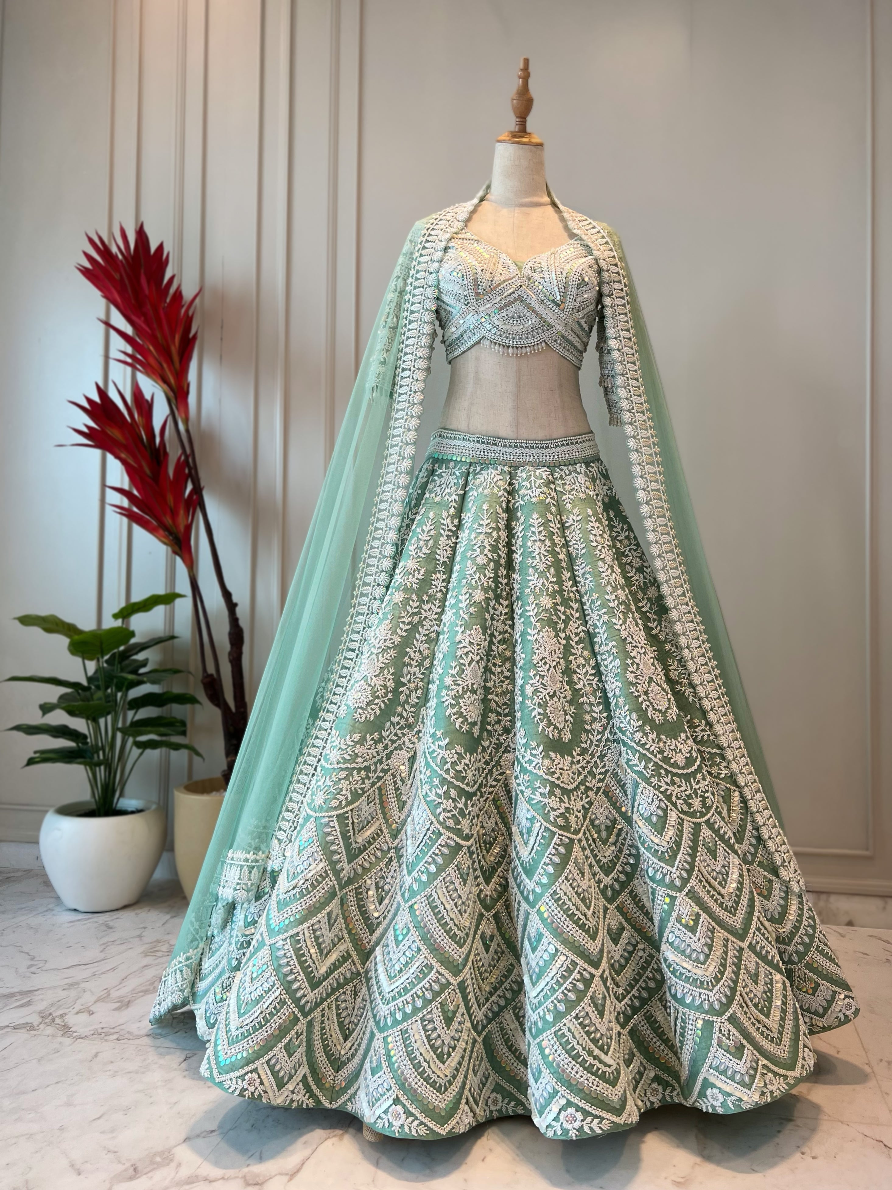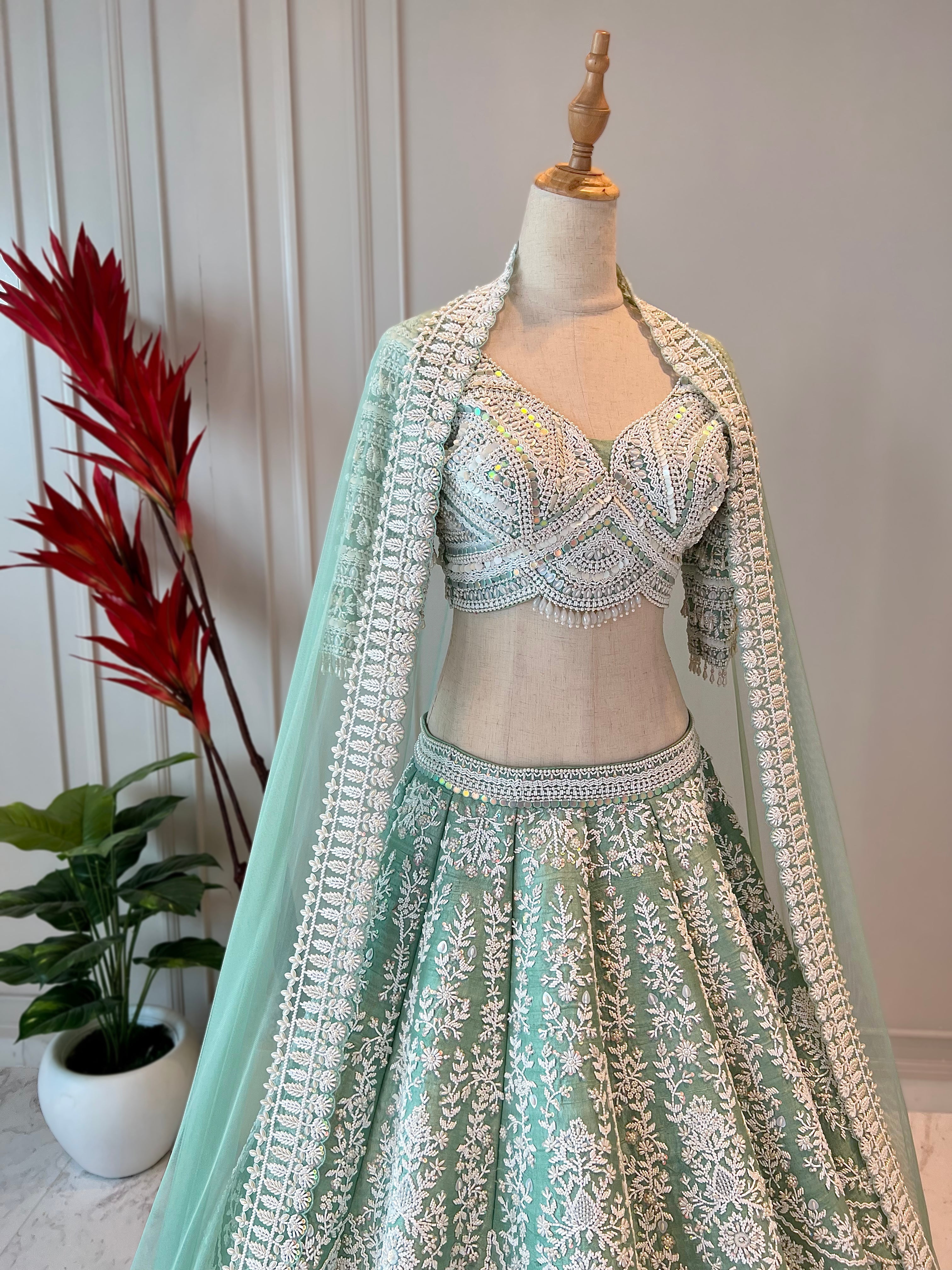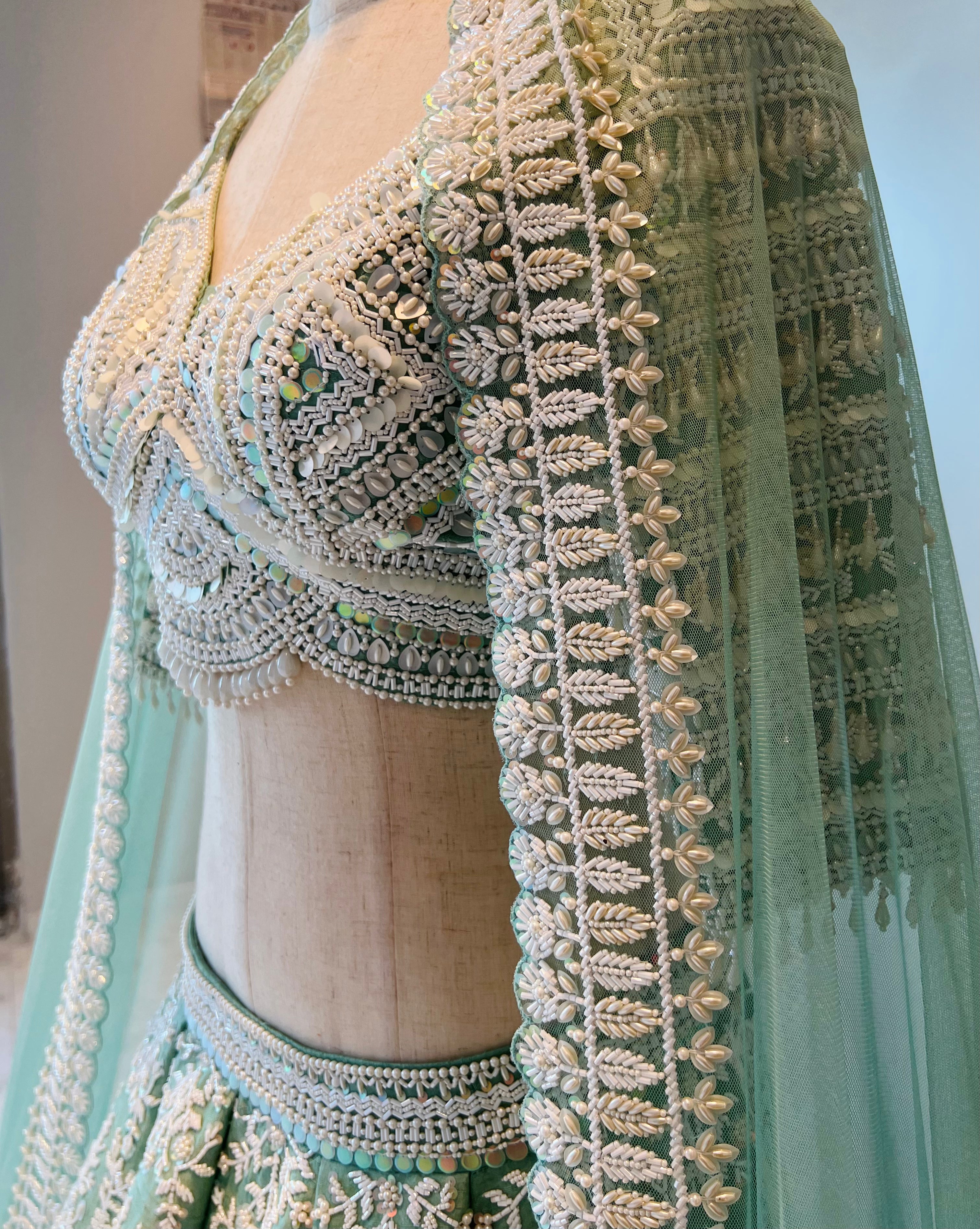The Ariel lehenga set is intricately hand embroidered raw silk with pearls, sequins and glass beads. The top is detailed with pearls, sequins, and tassels at the bottom. It comes with a soft net dupatta with embroidered pearl border.