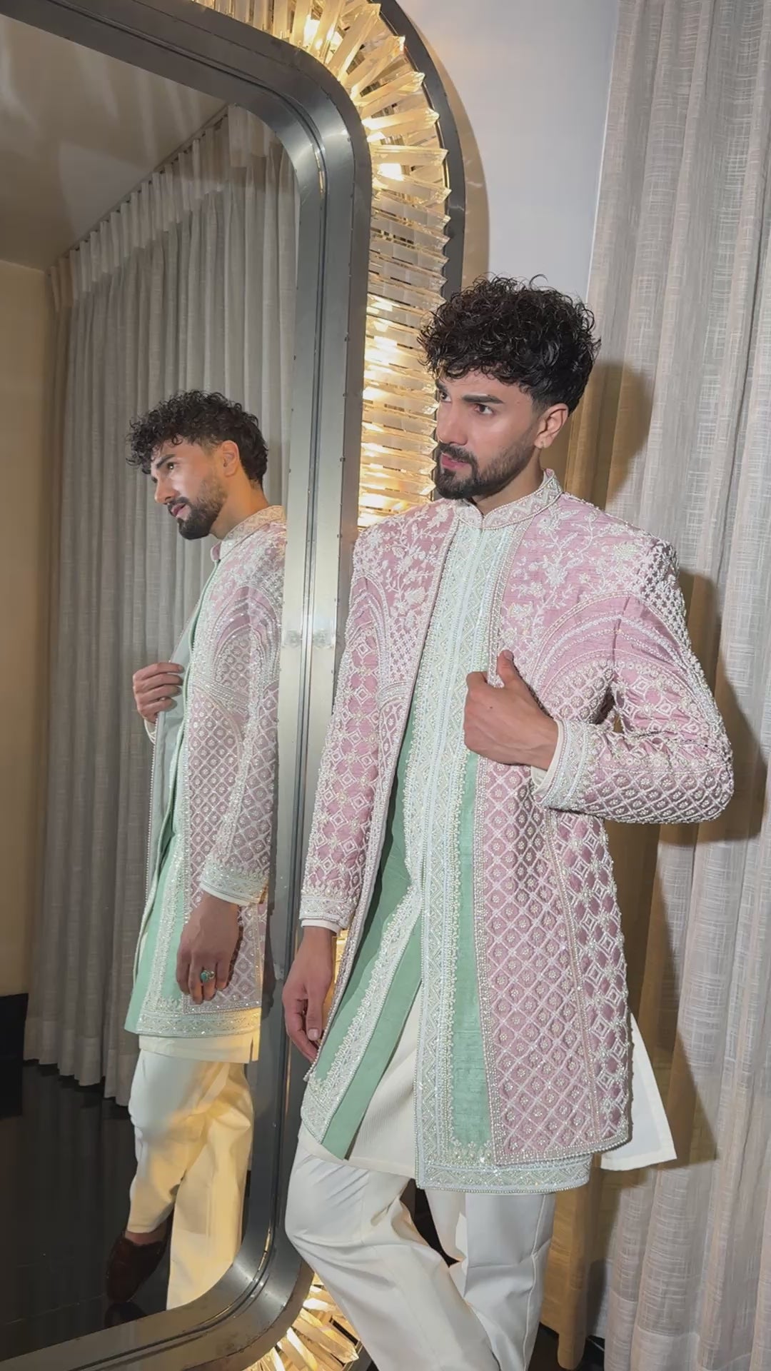 The Elysian Gate Sherwani is an ode to regal finesse, blending pastel artistry with meticulous craftsmanship. Drenched in soft blush tones with a serene mint inner panel, this statement piece features intricate threadwork, geometric textures, and delicate embroidered detailing that create a harmonious balance of tradition and modernity. Its structured silhouette, paired with refined layering and tailored trousers, exudes effortless sophistication. Elegant, ethereal, and impeccably crafted, the Elysian Gate Sherwani is designed for the groom who seeks timeless grandeur with a contemporary edge.