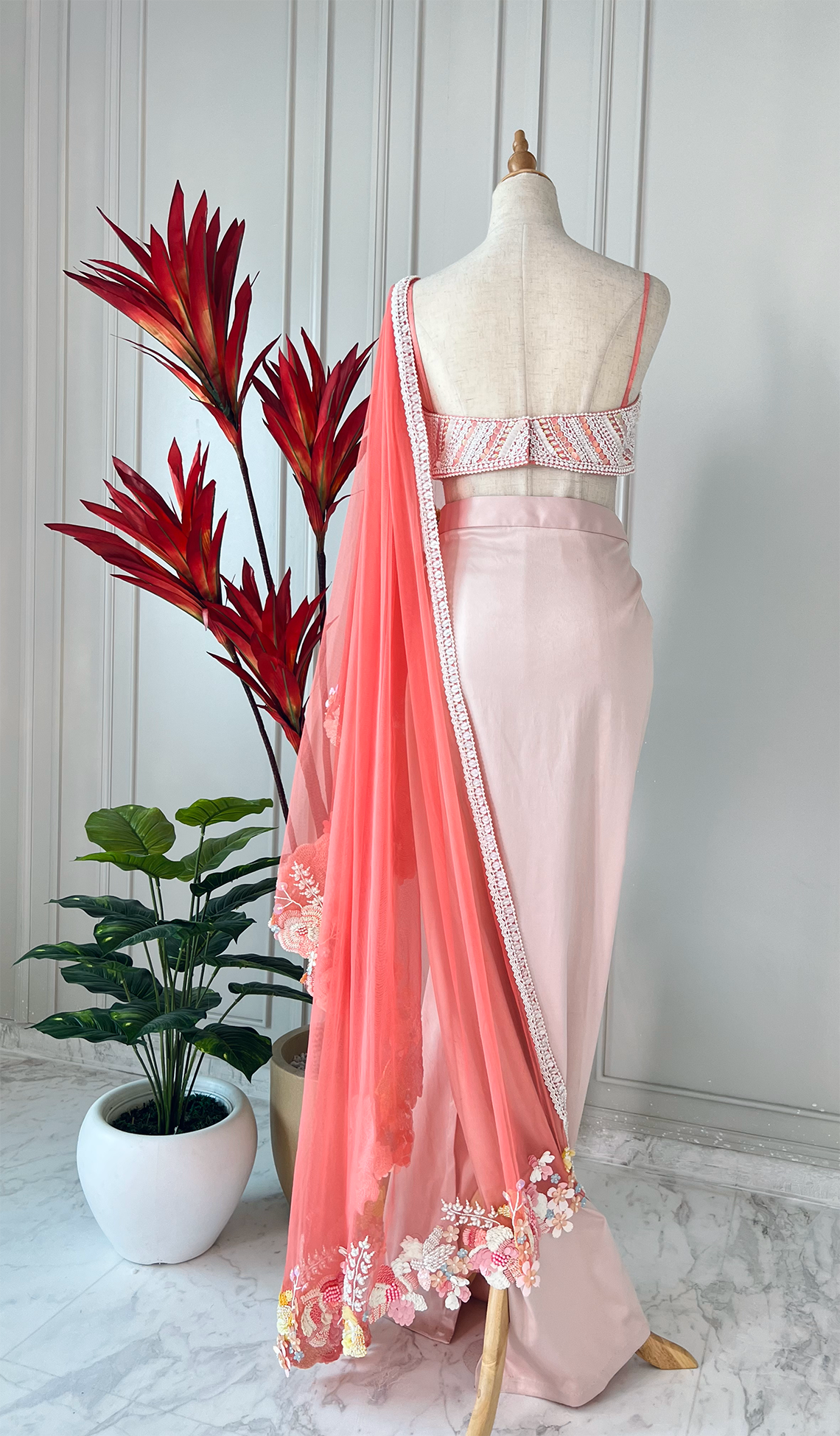 Featuring our one shoulder Tulip Drape set perfect for your wedding festivities. It comes with a jail embroidered bustier top which is paired with a Drape dutch satin skirt. The entire set is finished with a beautifully one shoulder draped piece with exquisite floral detailing