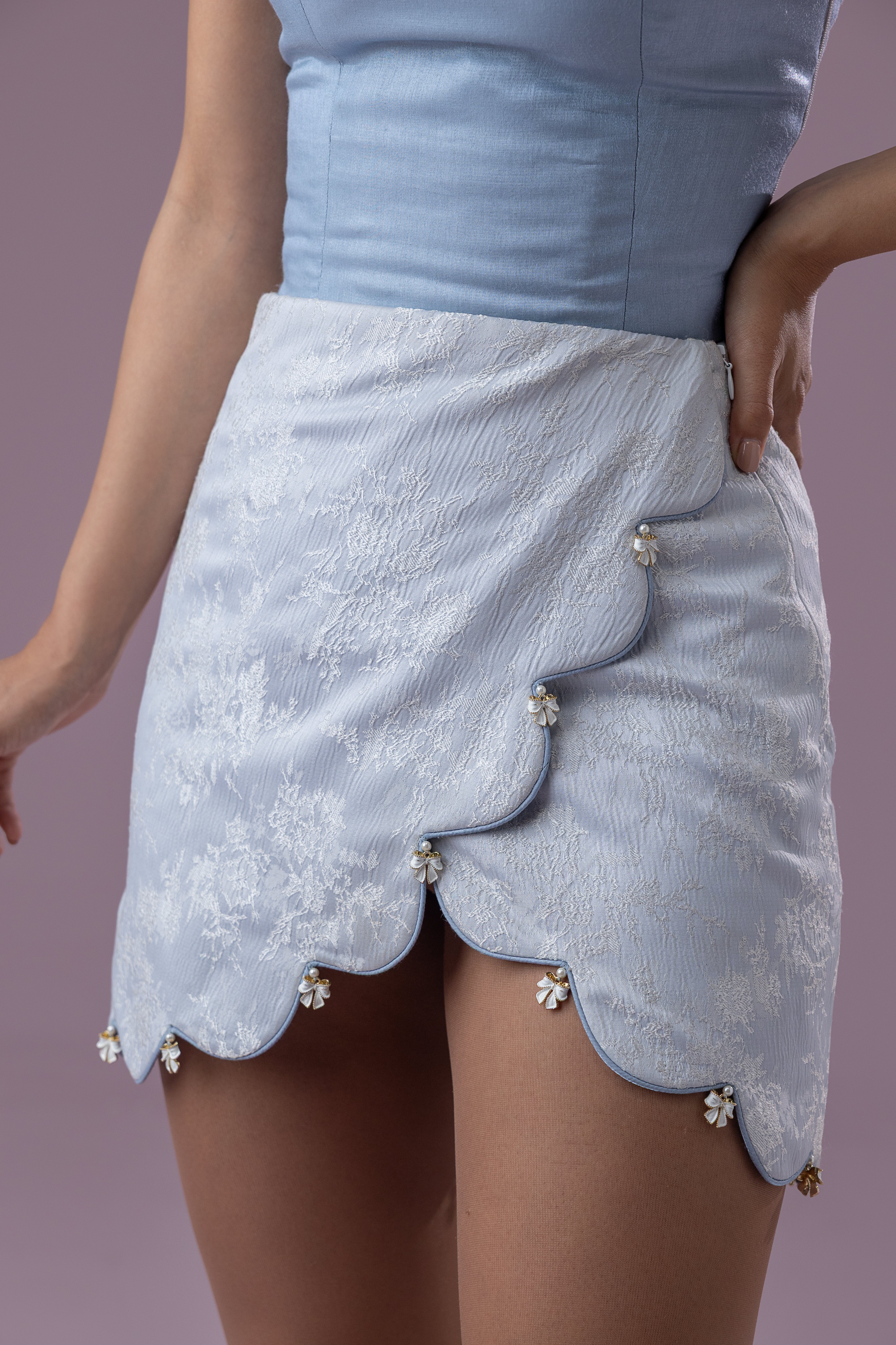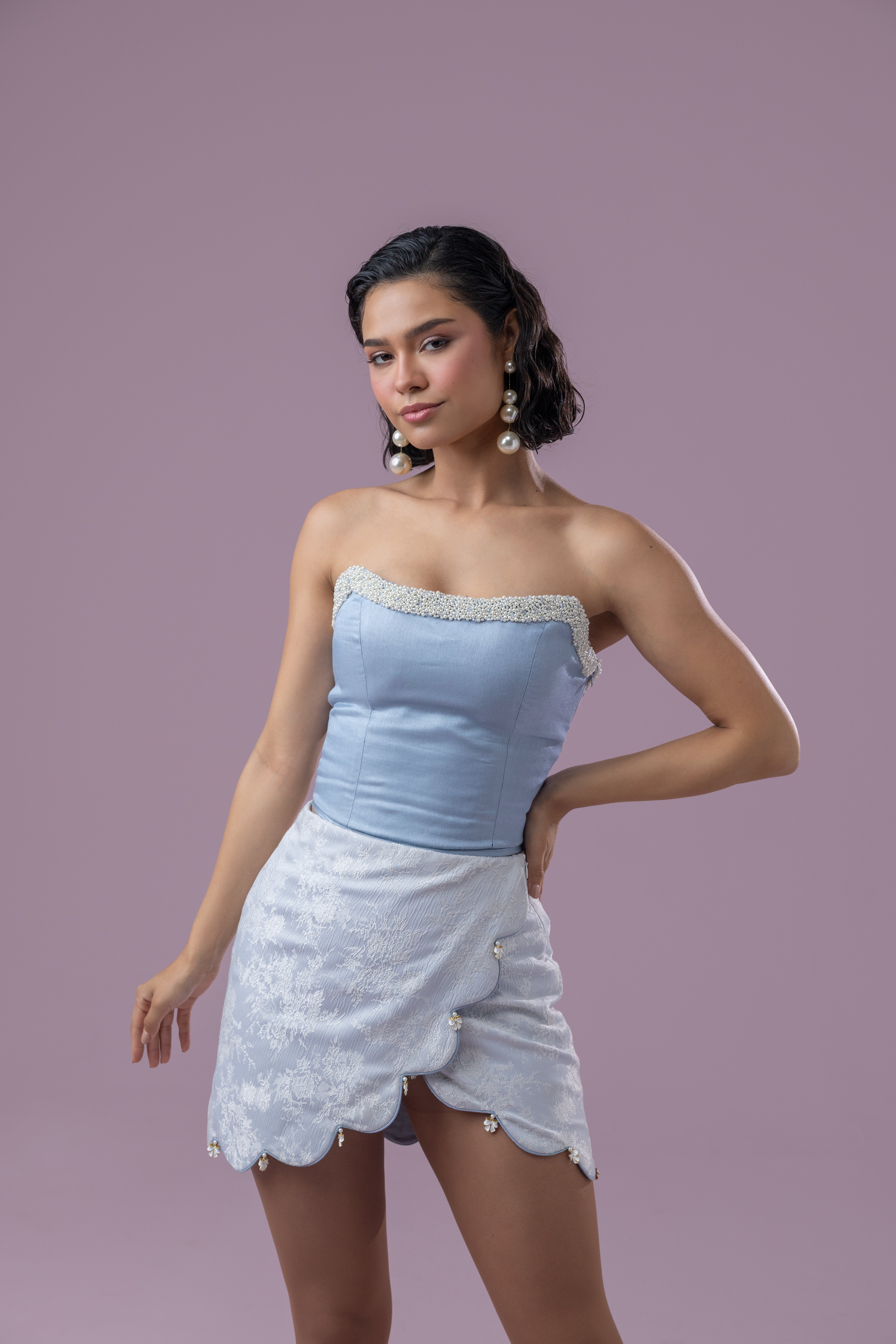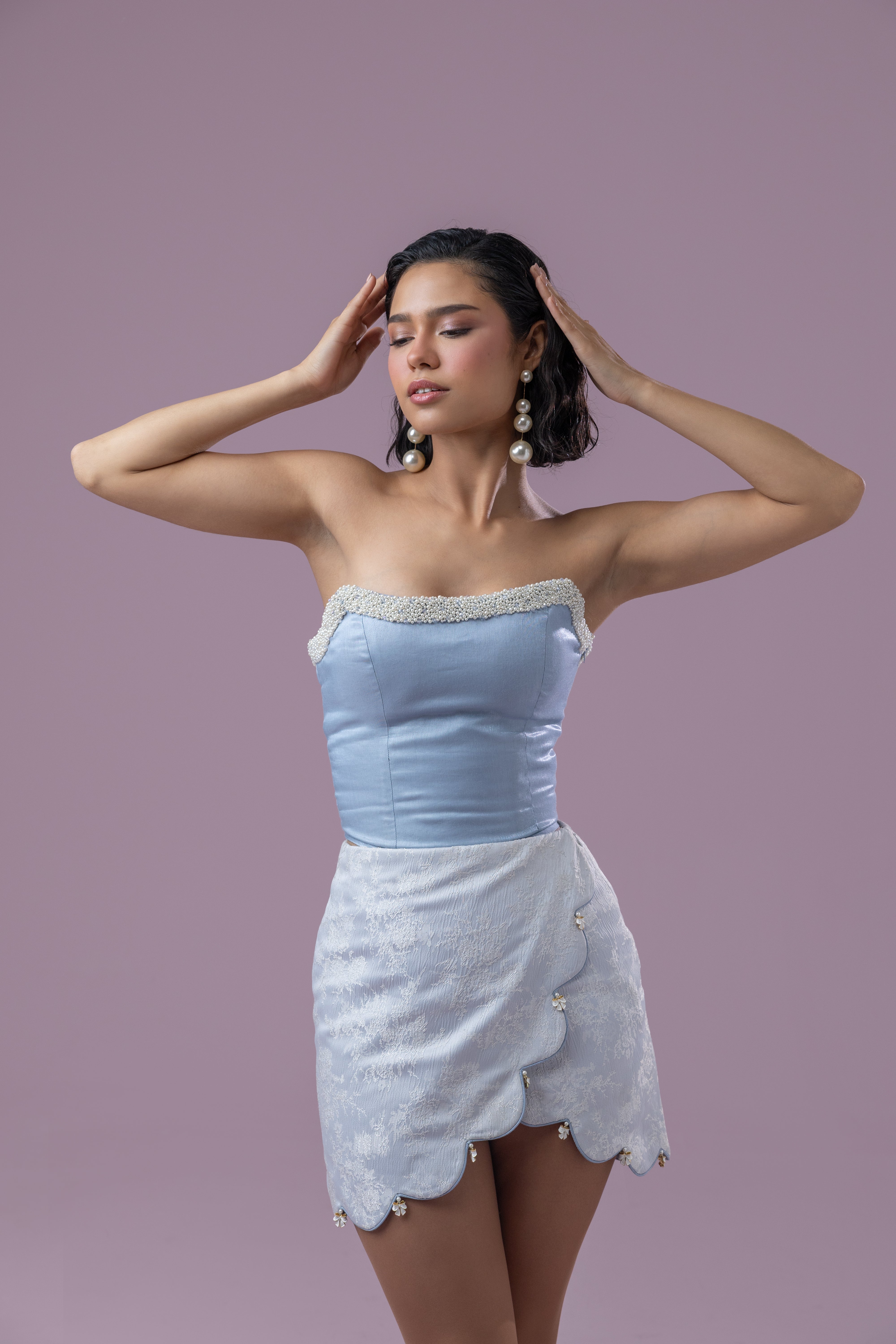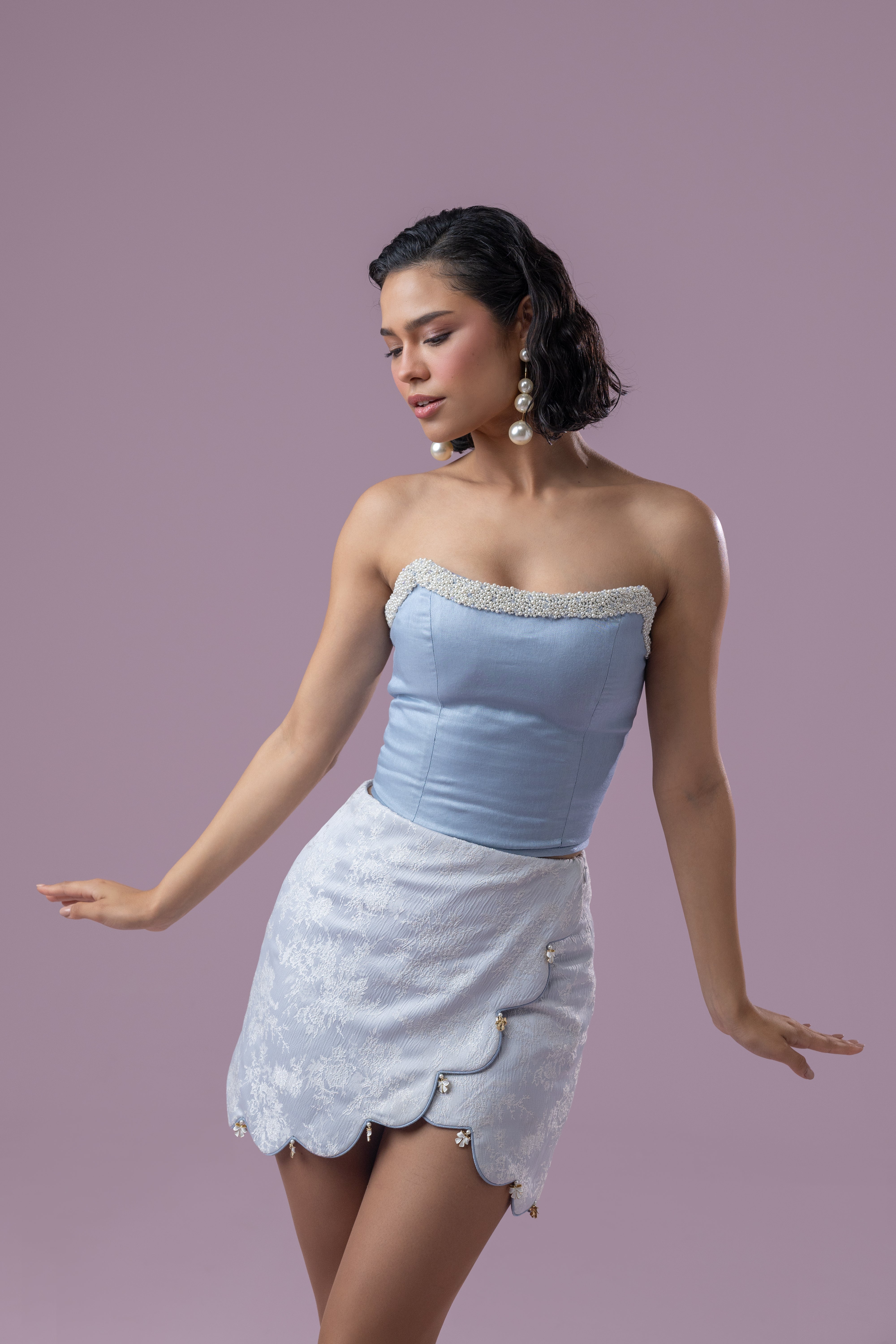 This mesmerizing ensemble features a meticulously hand-embroidered Steel Blue top, artfully merging structure and femininity. A cloud-hemmed skirt—expertly crafted from sumptuous Jacquard—imparts depth and graceful movement, while a delicately dangling bow adds a playful, yet refined finishing touch.