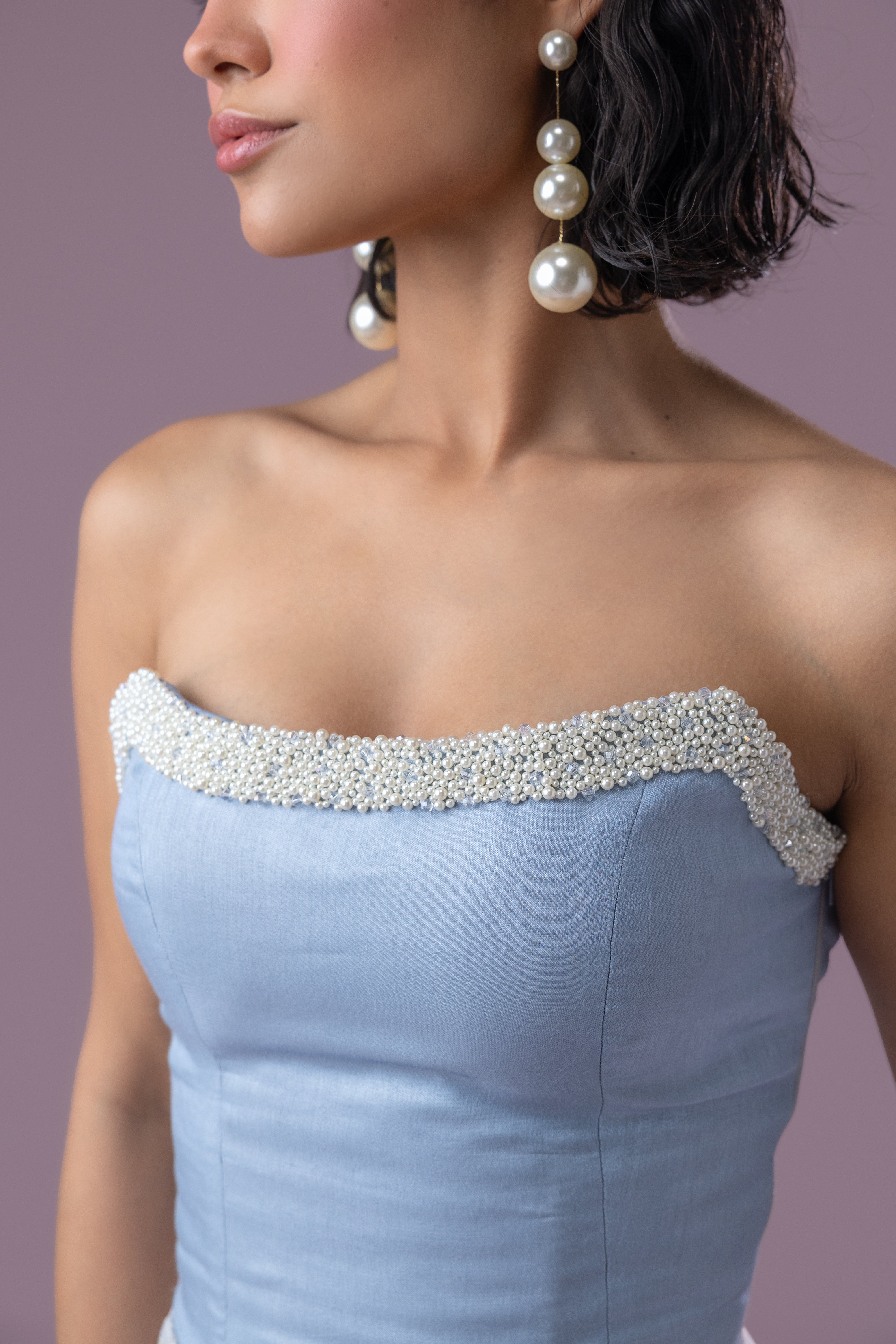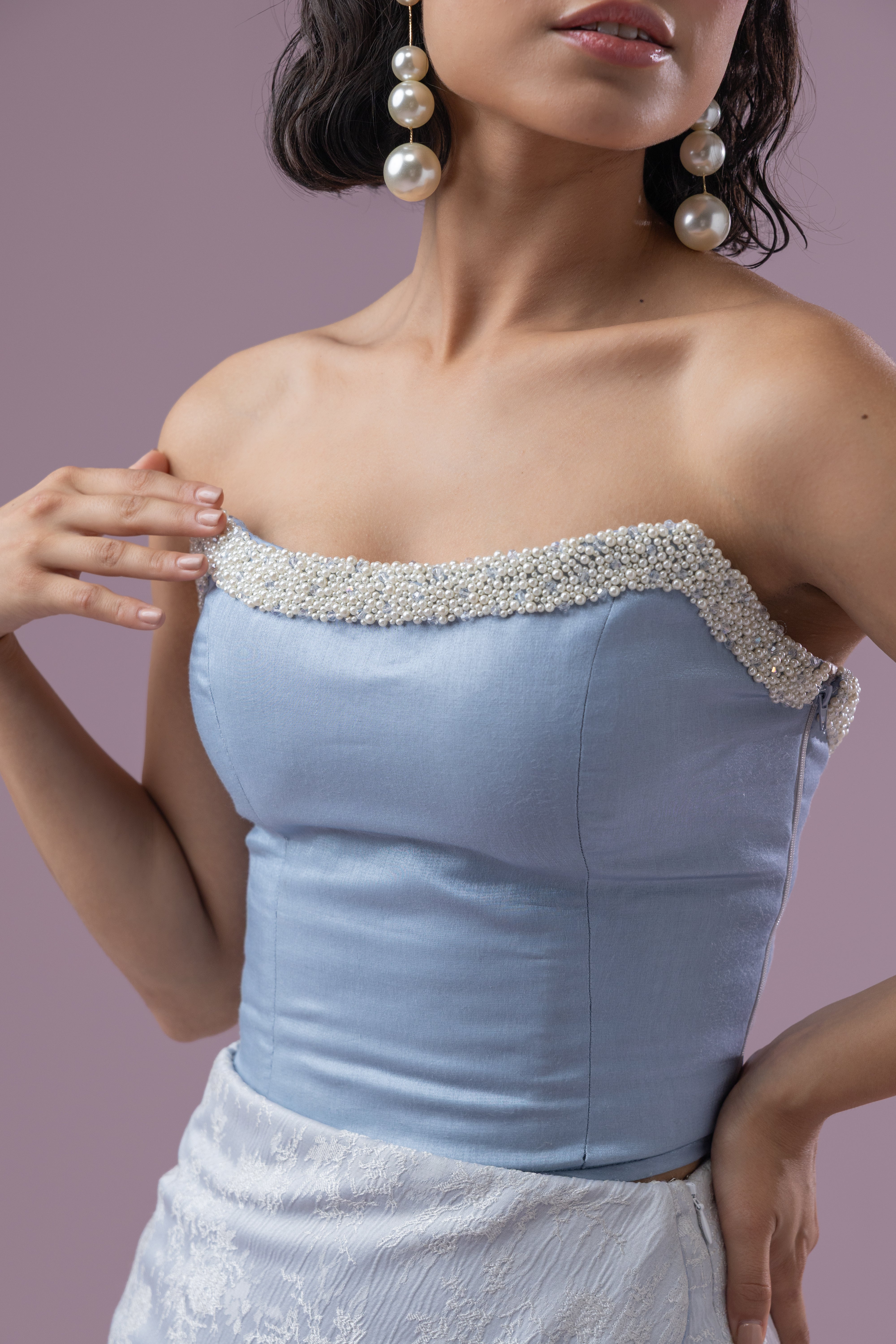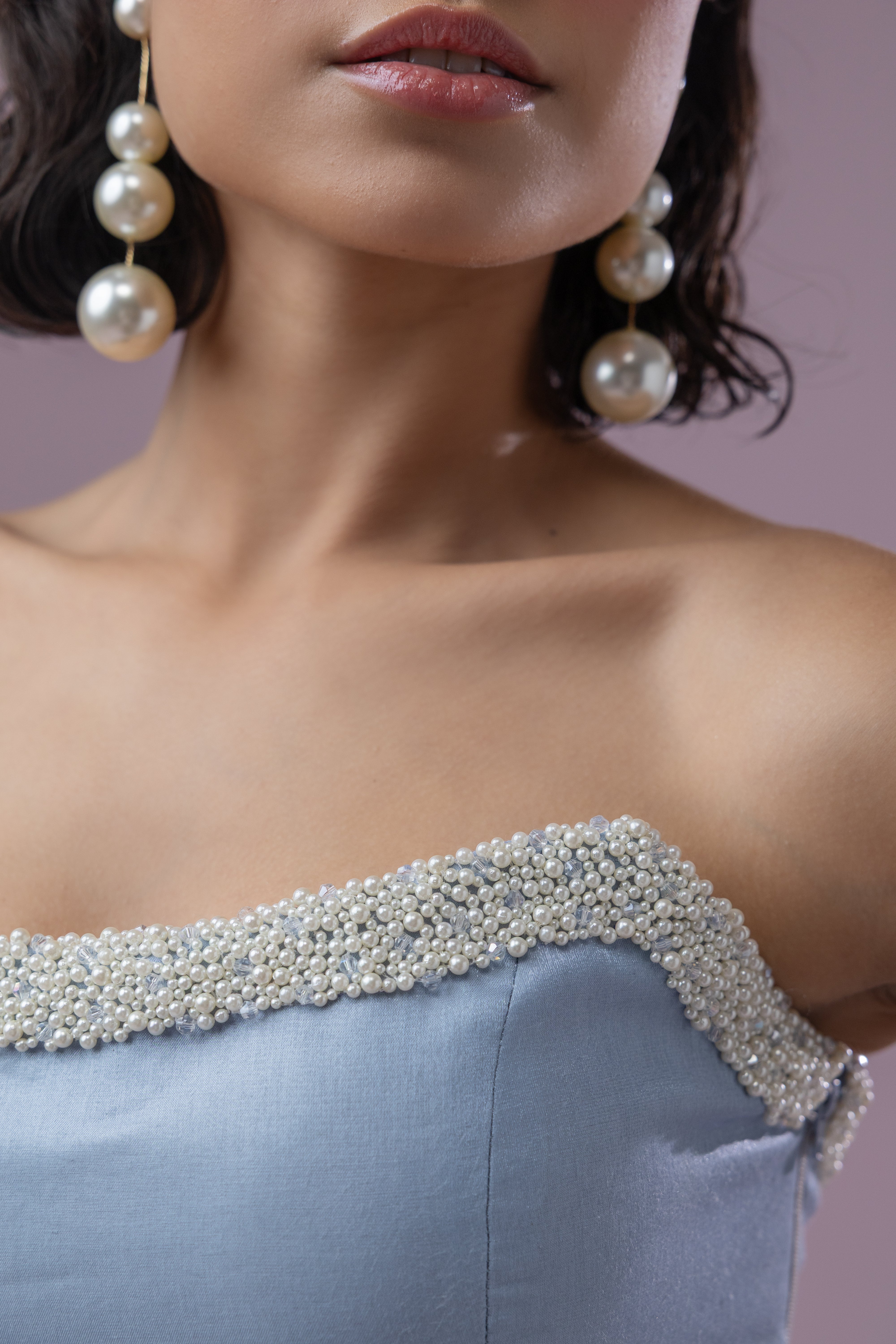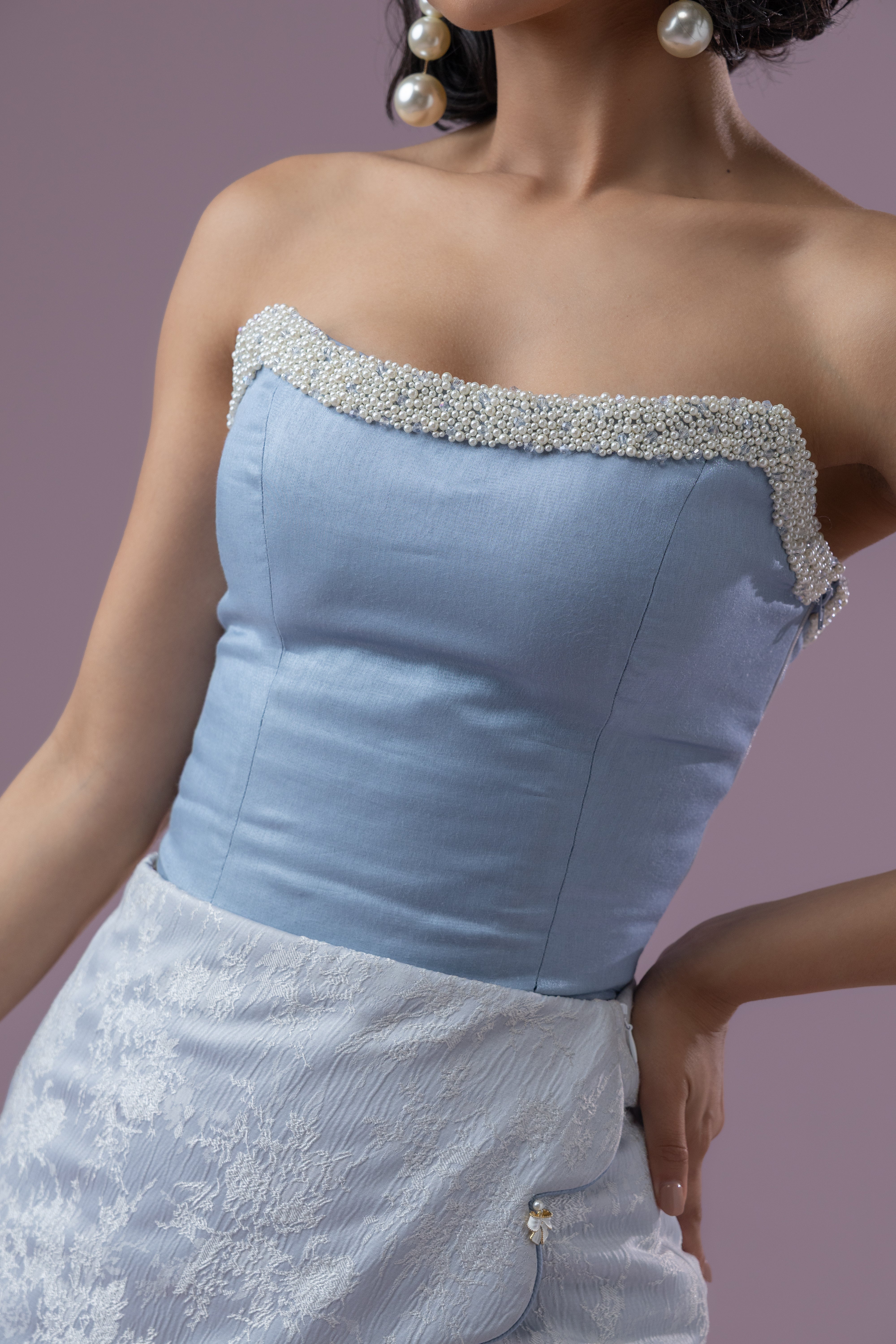 This mesmerizing ensemble features a meticulously hand-embroidered Steel Blue top, artfully merging structure and femininity. A cloud-hemmed skirt—expertly crafted from sumptuous Jacquard—imparts depth and graceful movement, while a delicately dangling bow adds a playful, yet refined finishing touch.