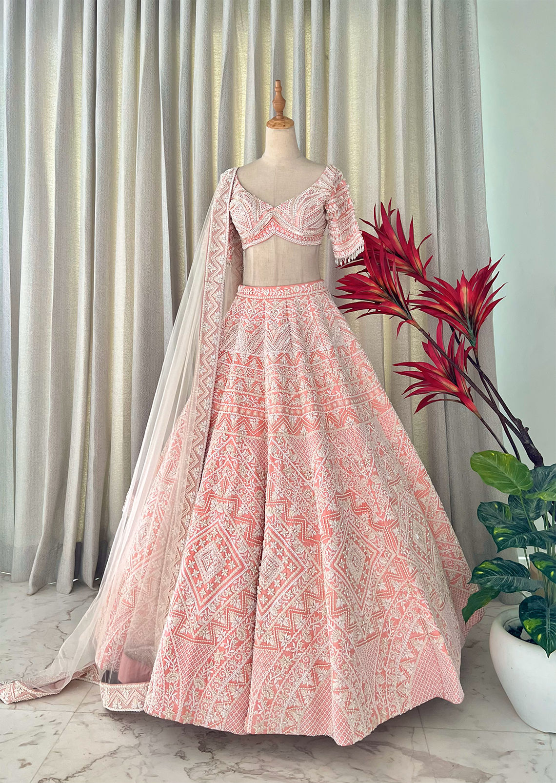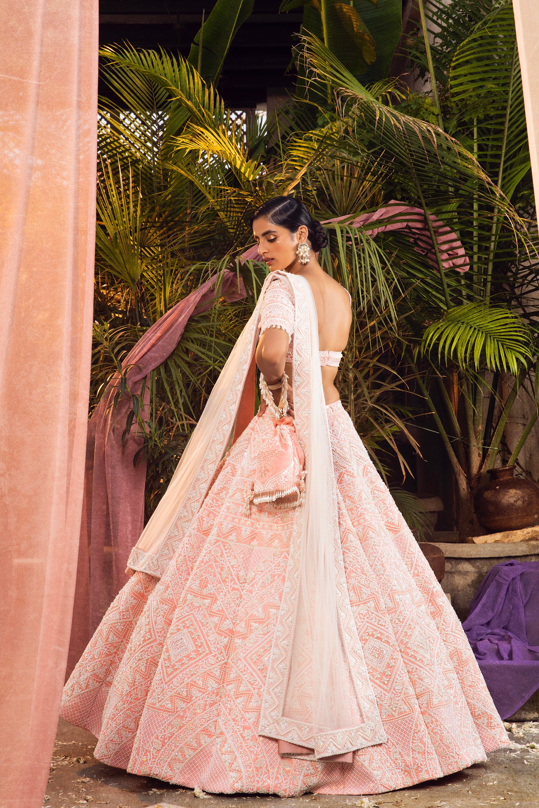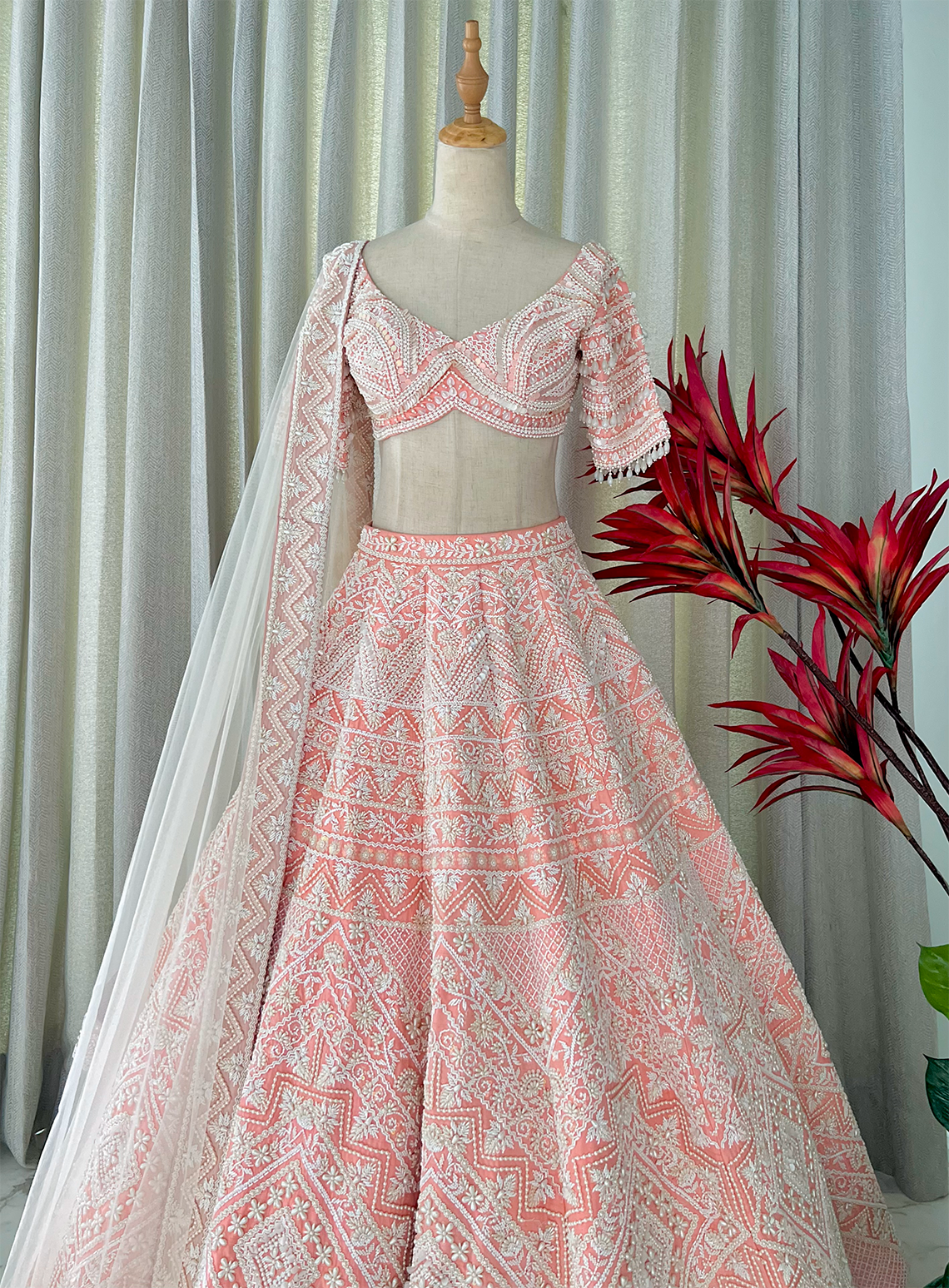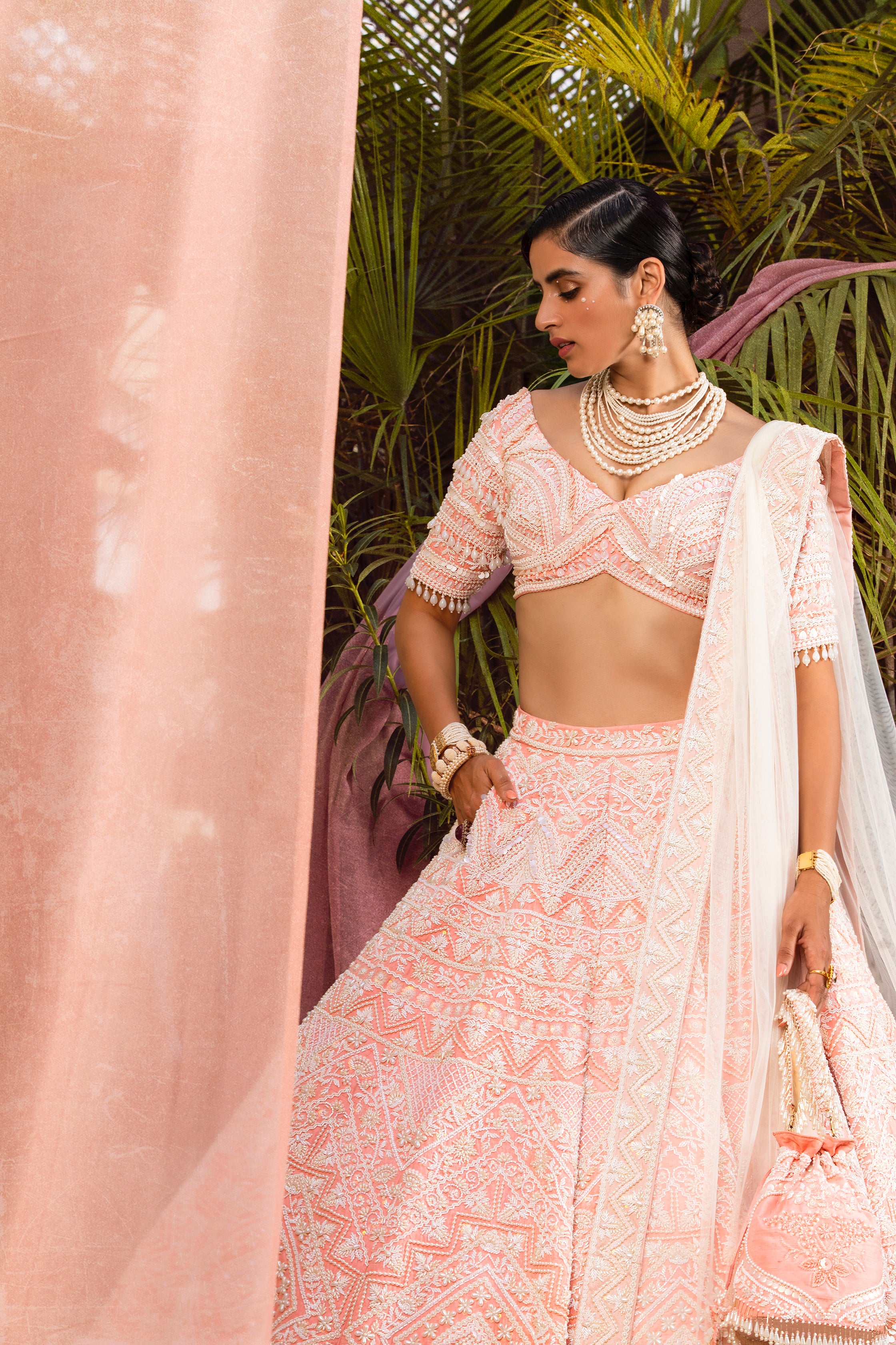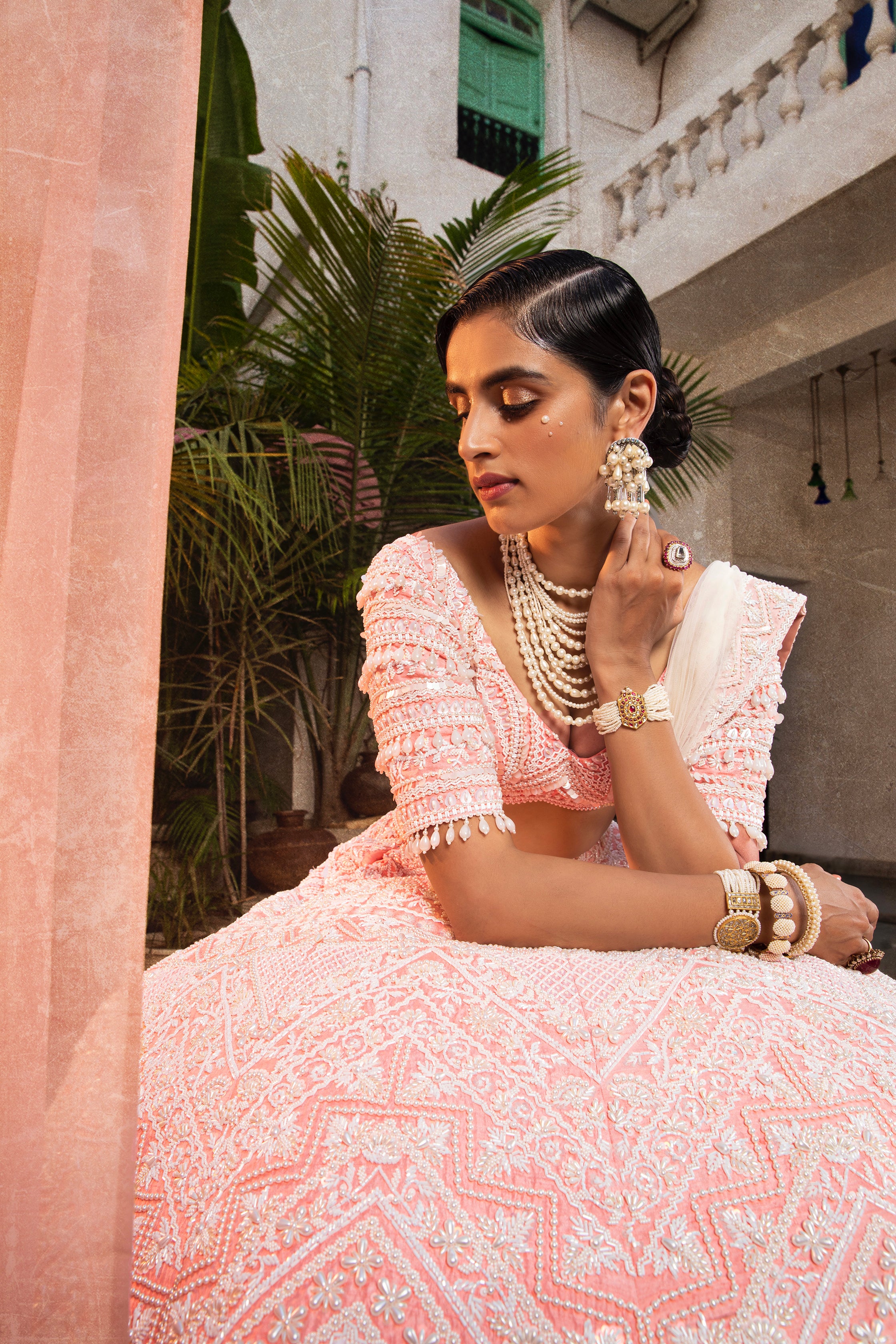 Featuring a ruby pink lehenga set in raw silk with heavily pearl embroidery in patterns paired with a geometric Square neckline blouse and teamed with a soft net dupatta with structured 2.5 inch border