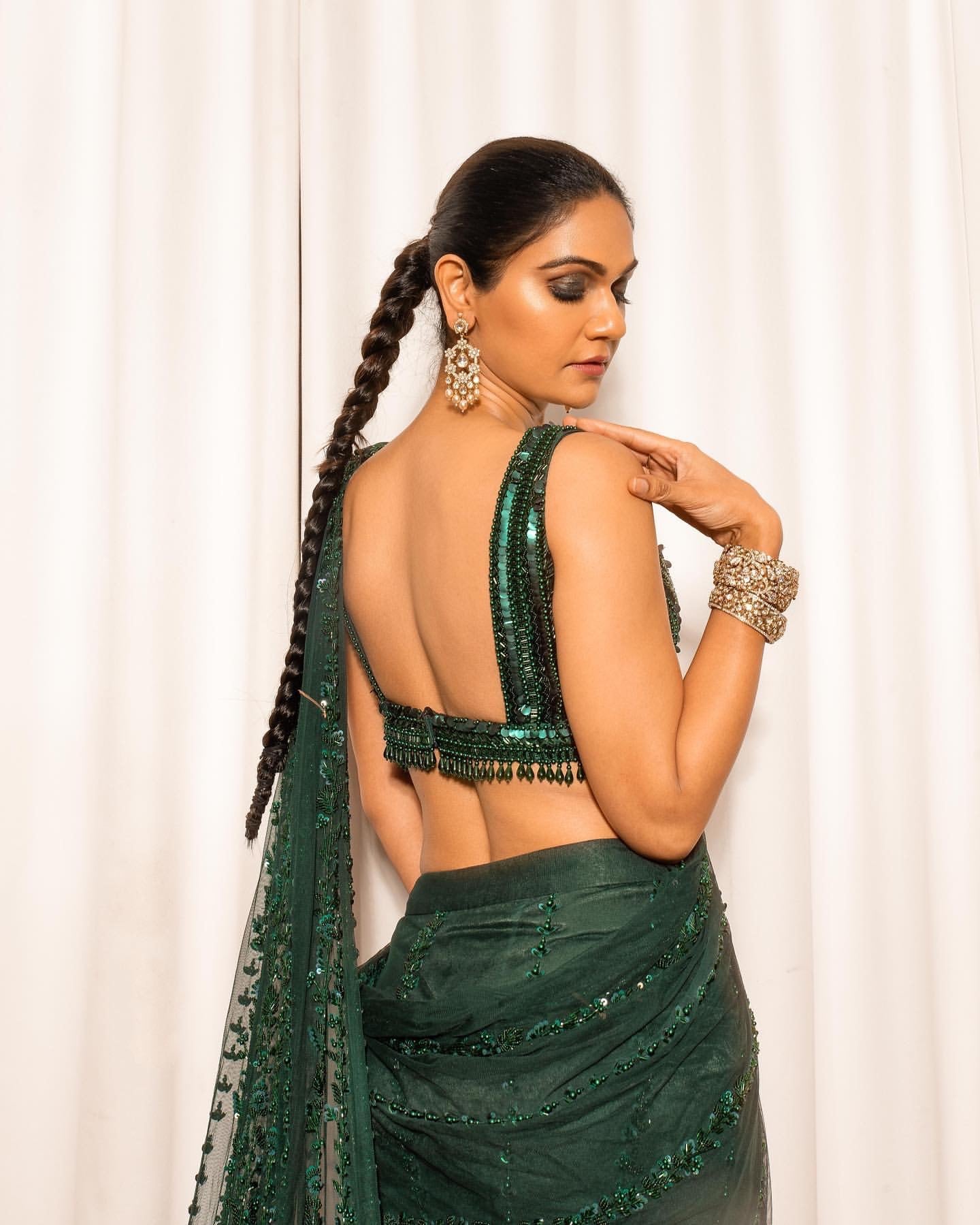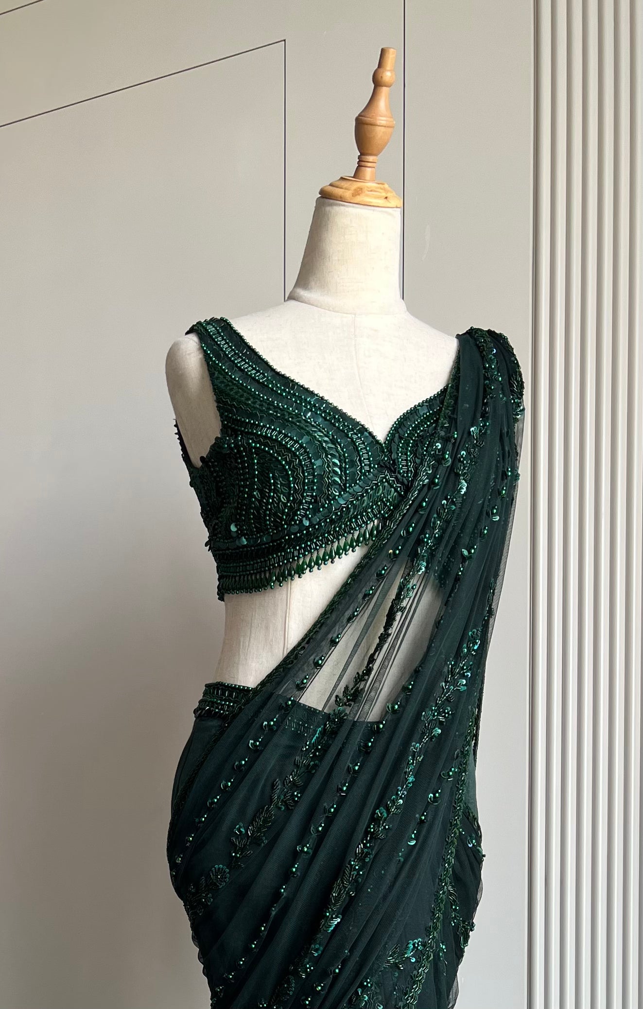 Zoey Saree is a monotone drape net saree with our iconic hand embroidered emerald green glass beads, pearls and sequins.